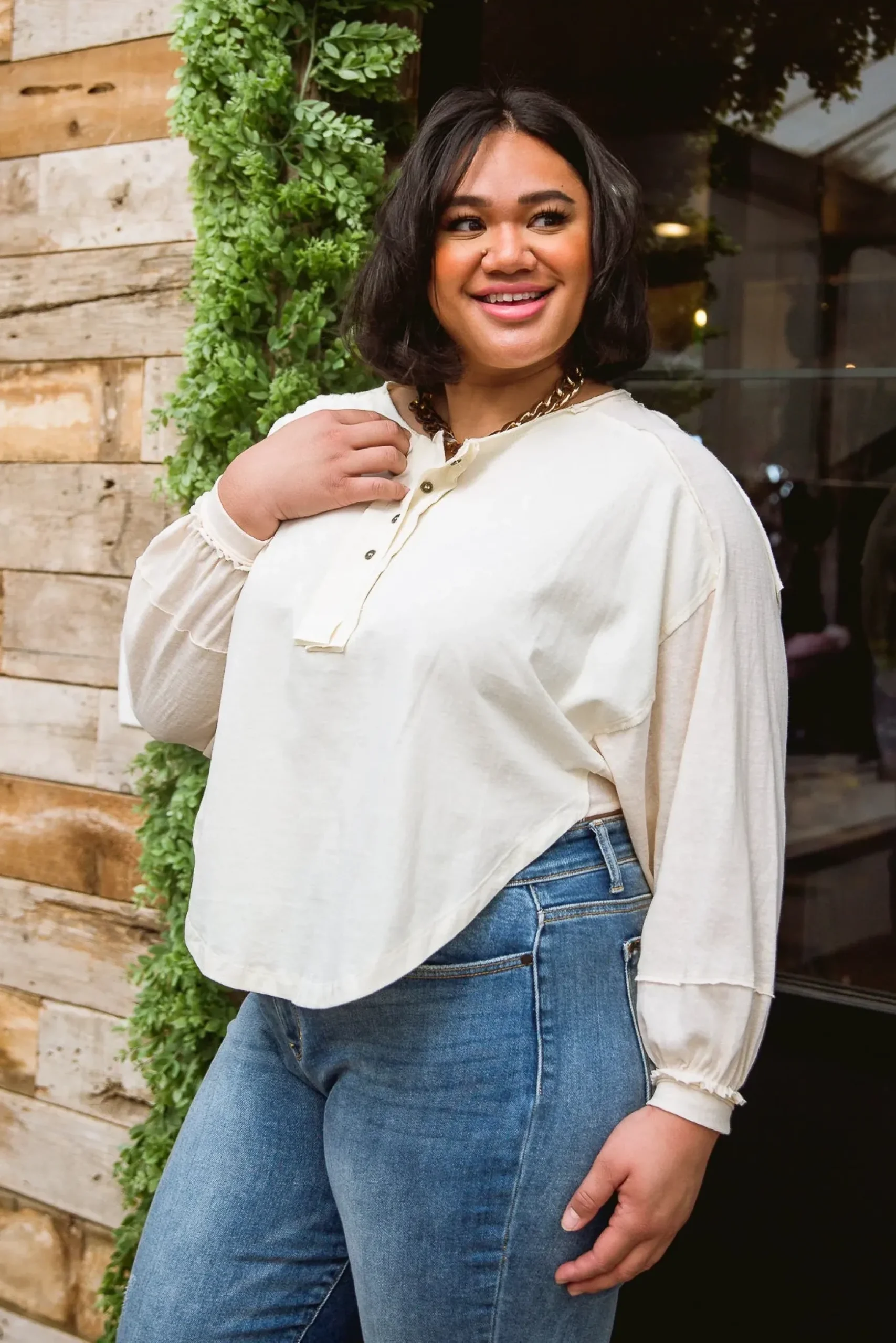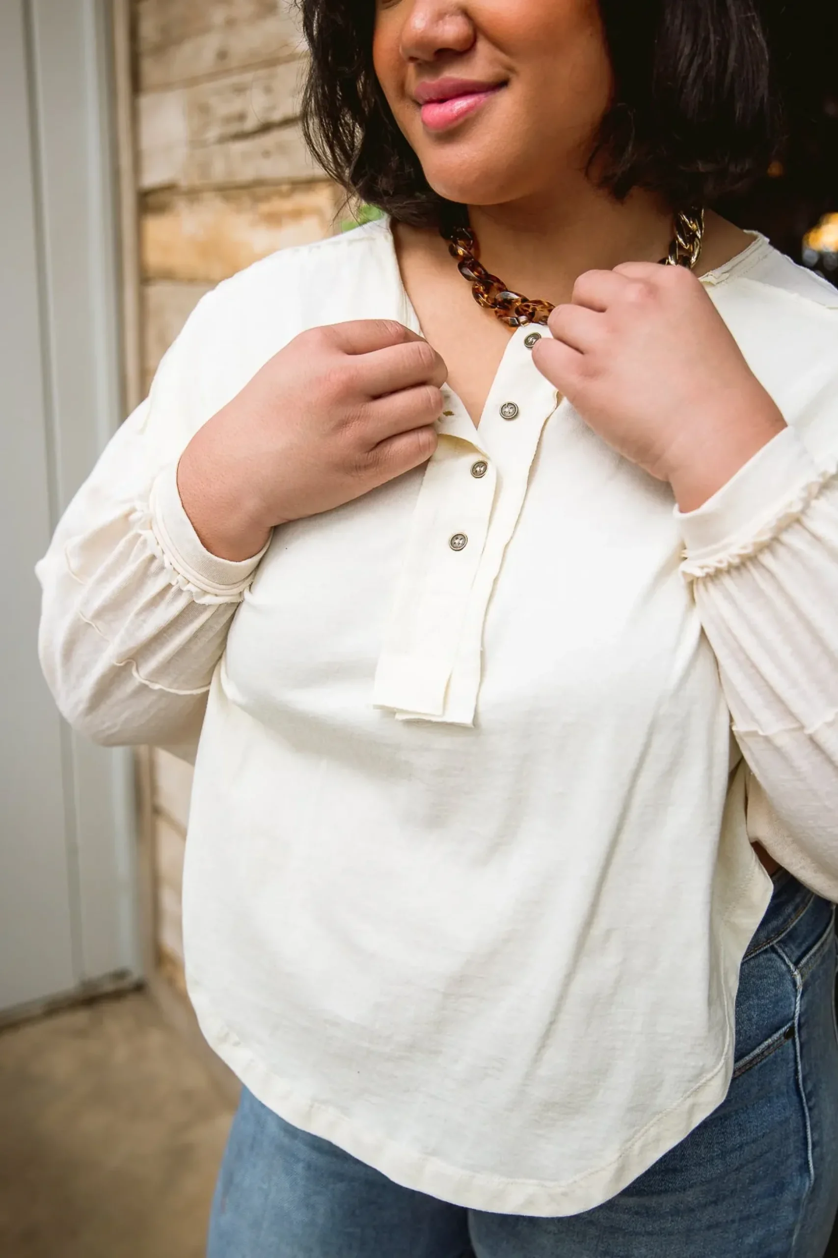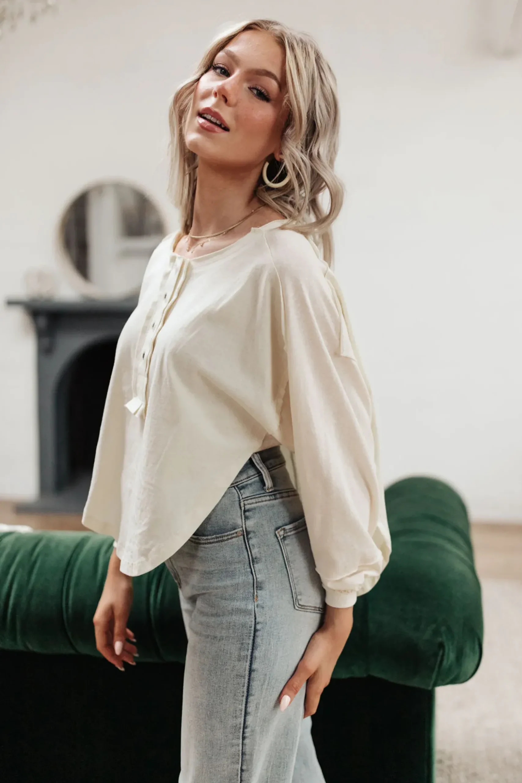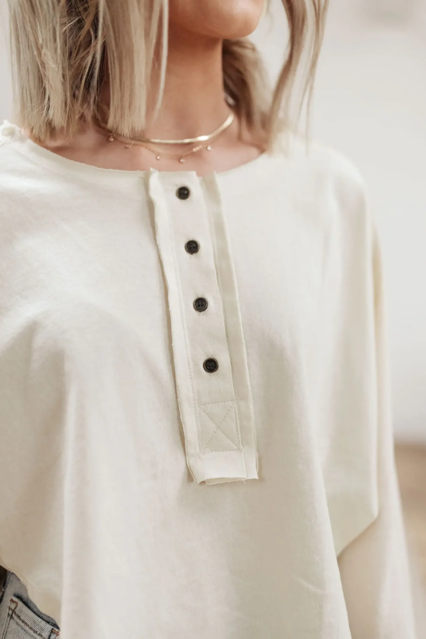 The Osaka Top is a fun and unique take on your classic henley long sleeve. We love the look it lends, with a high side shark bite cut, raw hem detail, balloon sleeves, and rustic four button henley.