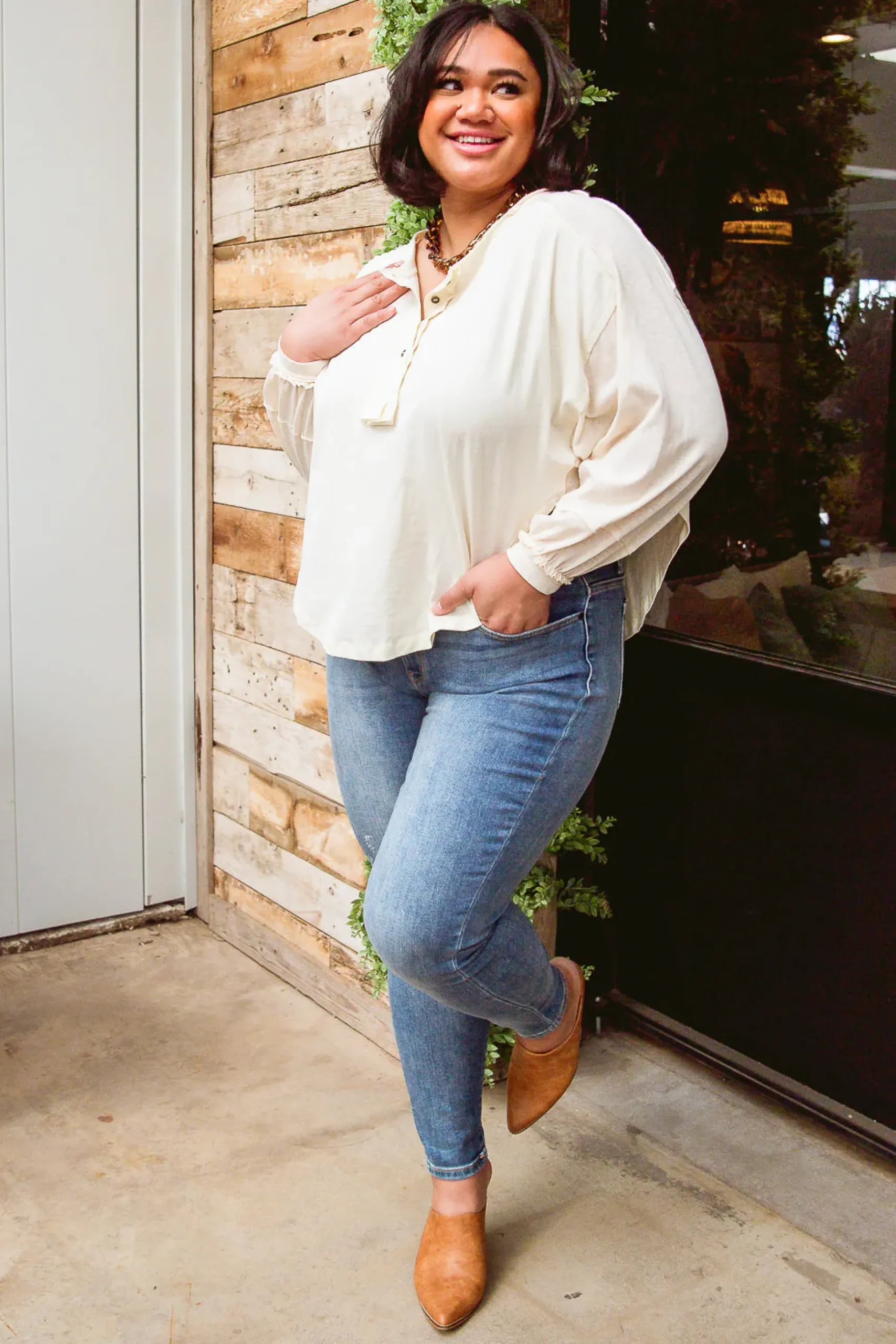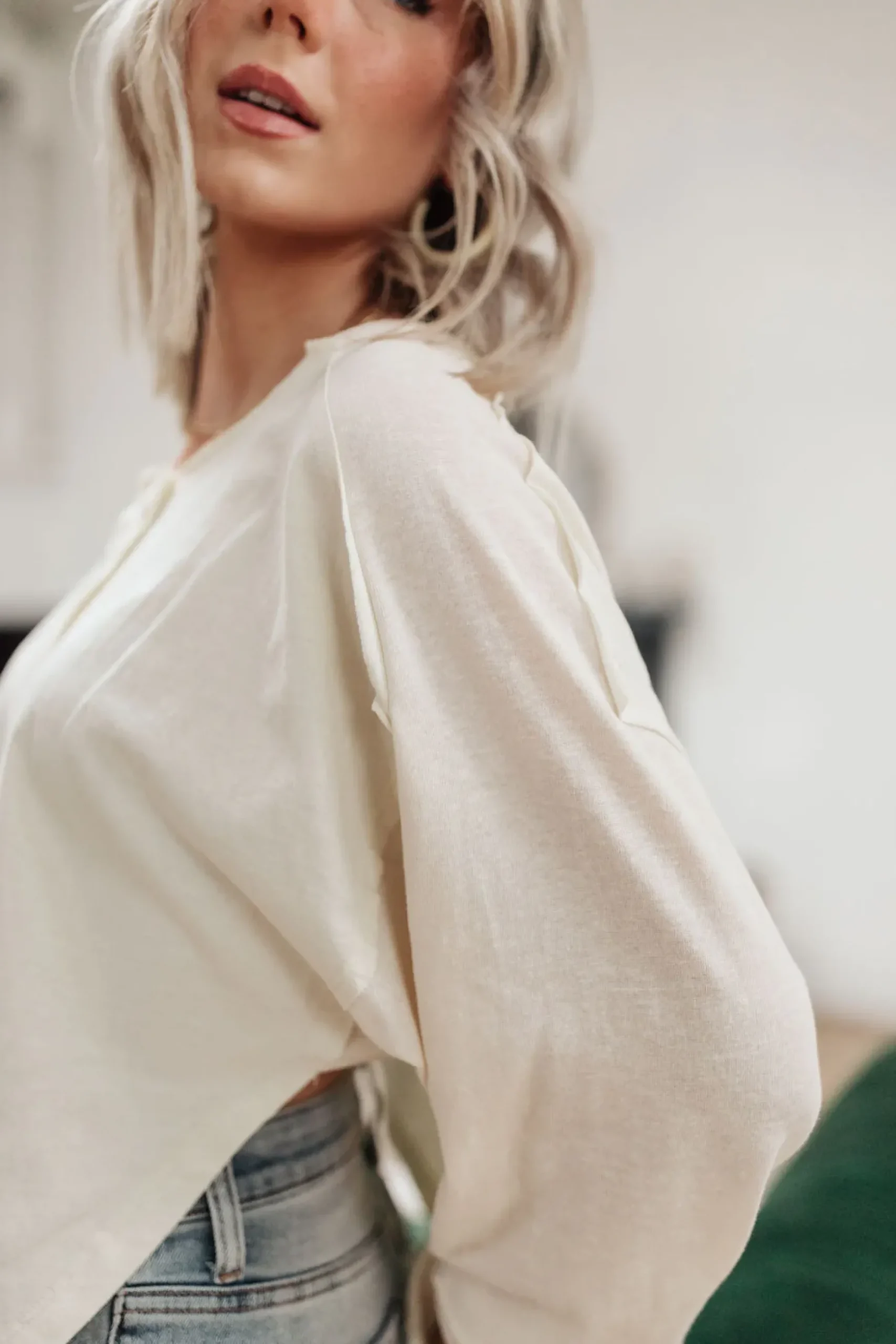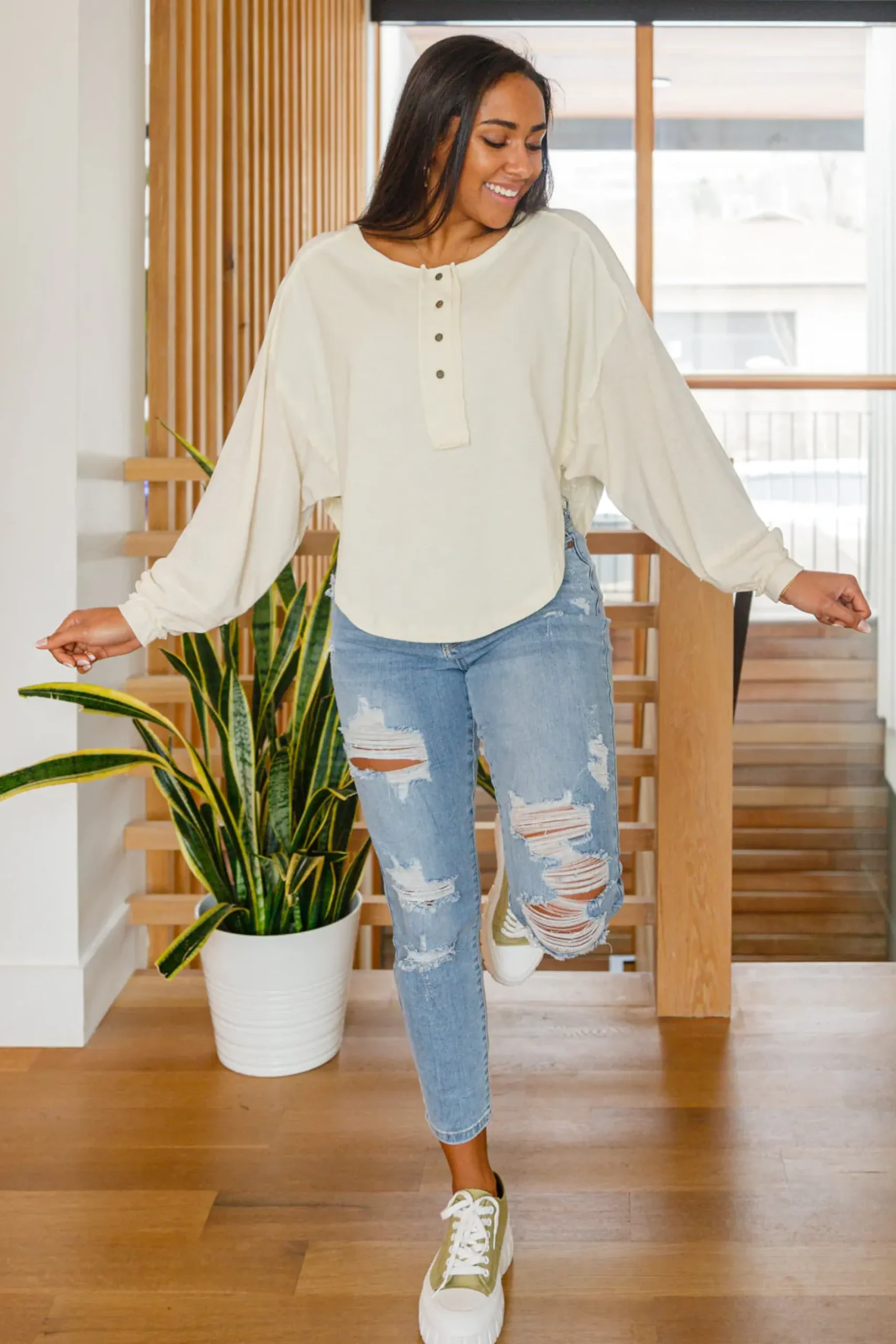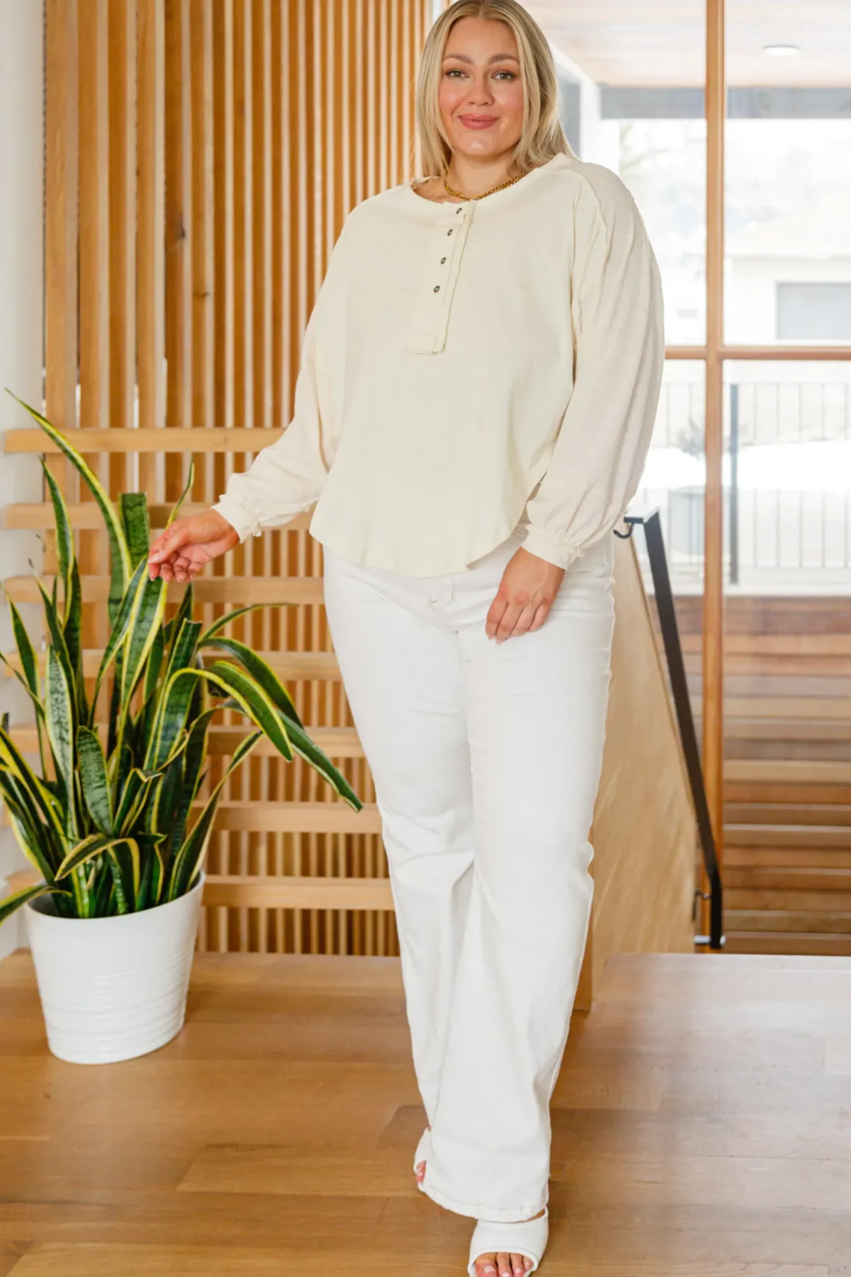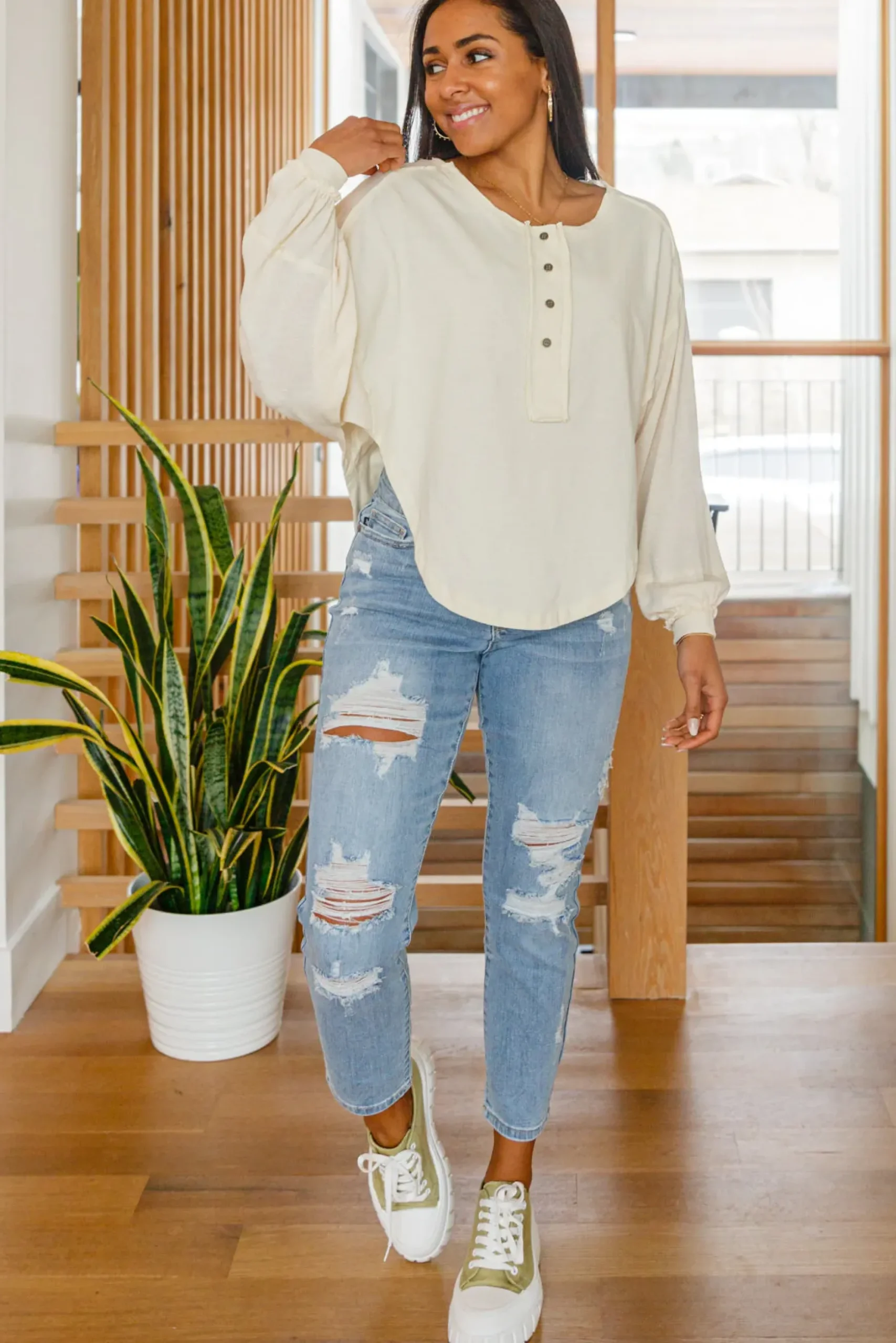 The Osaka Top is a fun and unique take on your classic henley long sleeve. We love the look it lends, with a high side shark bite cut, raw hem detail, balloon sleeves, and rustic four button henley.