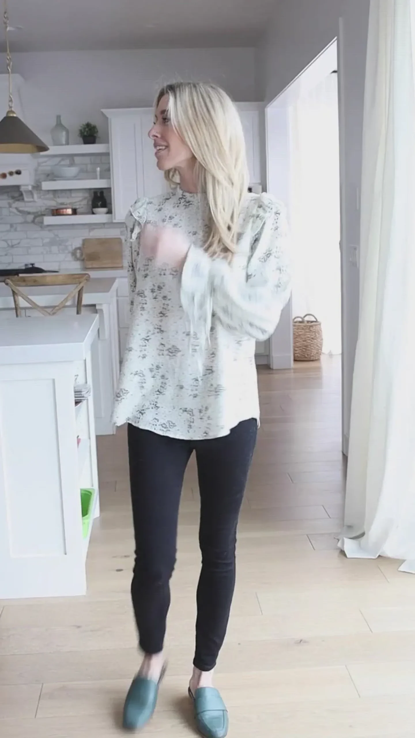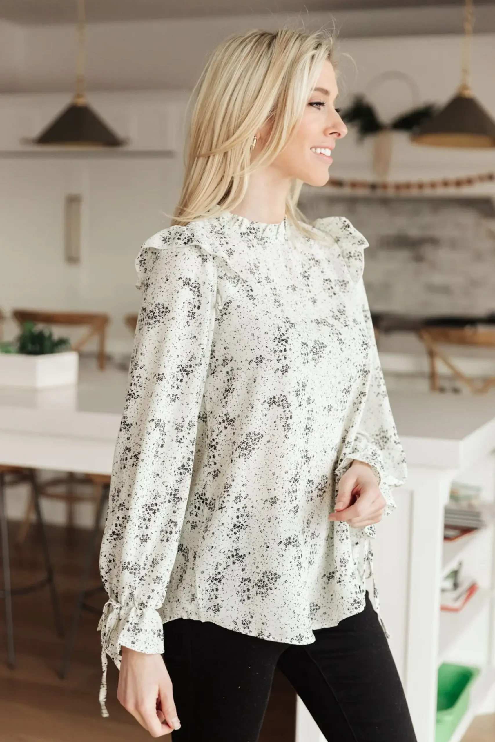 This romantic top is the perfect combination of flirty and modest. A stunning spotted print paints an abstract take on a floral design. This beautiful blouse has a flowy silhouette and features a ruffle neckline and shoulder detail. The sleeve has a slight balloon cut, decorated with an elastic cuff and tie detailing. It is so fun and chic, what more could you ask for!