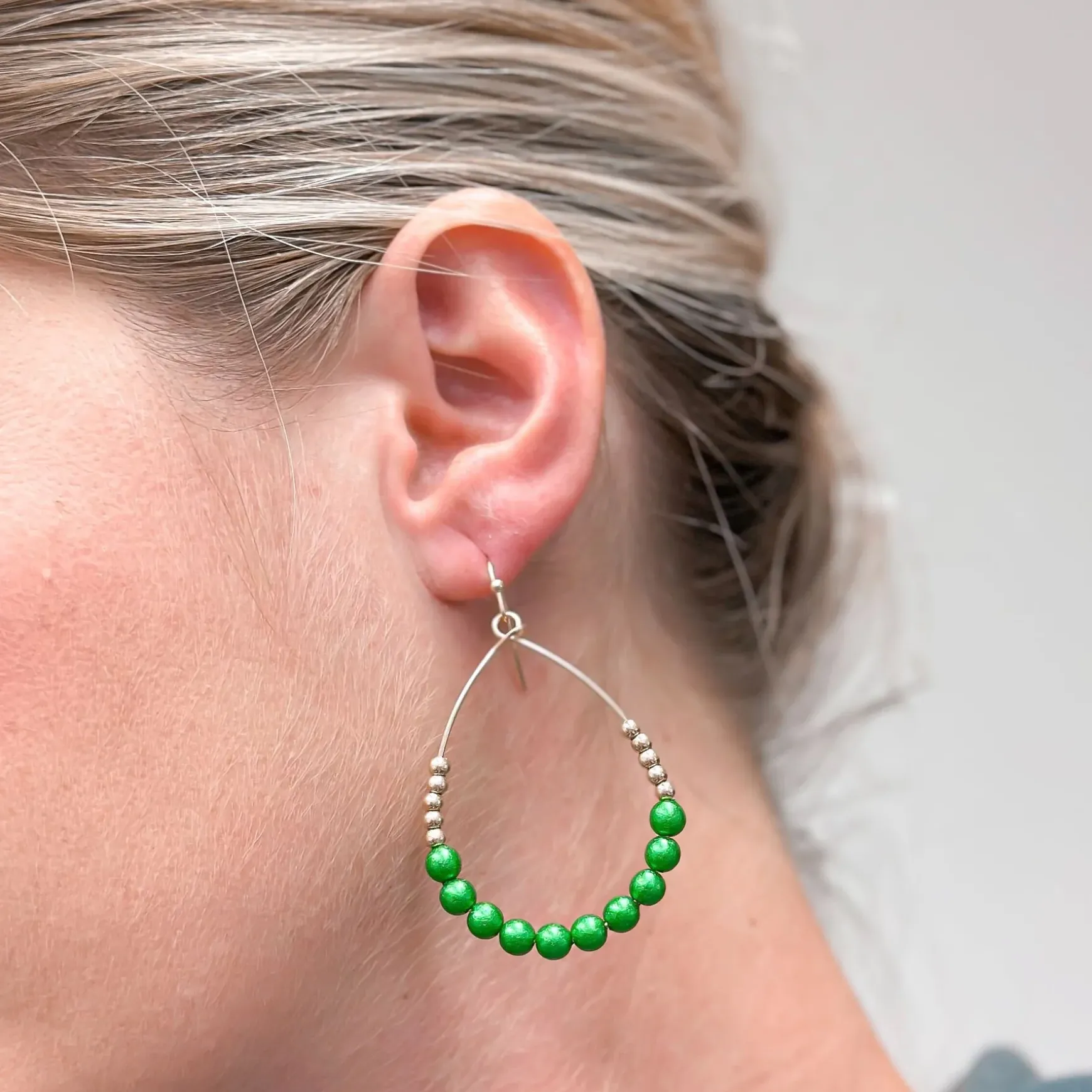 These Oval Green Pearl Holiday Dangle Earrings are perfect to add to your look!