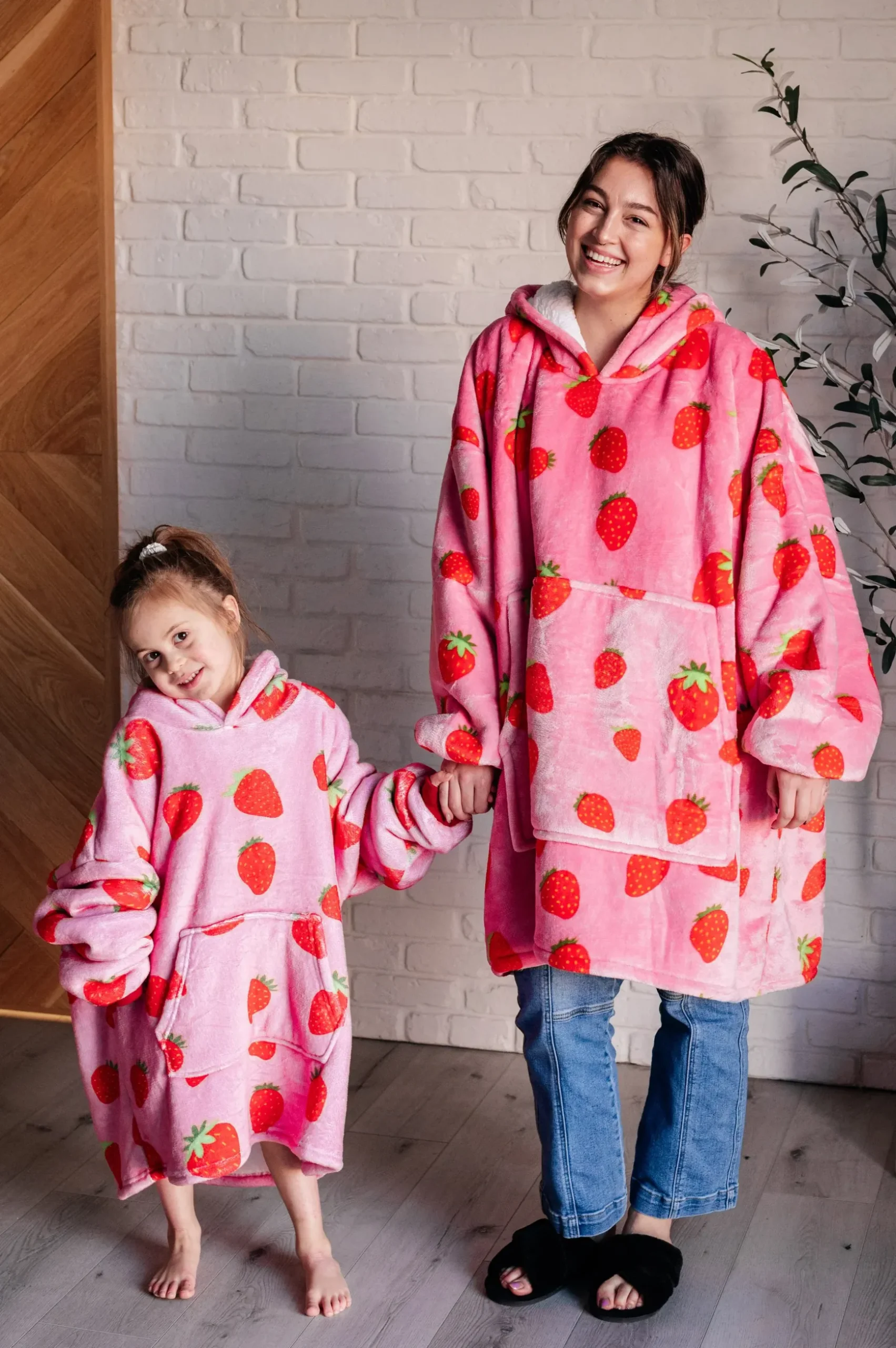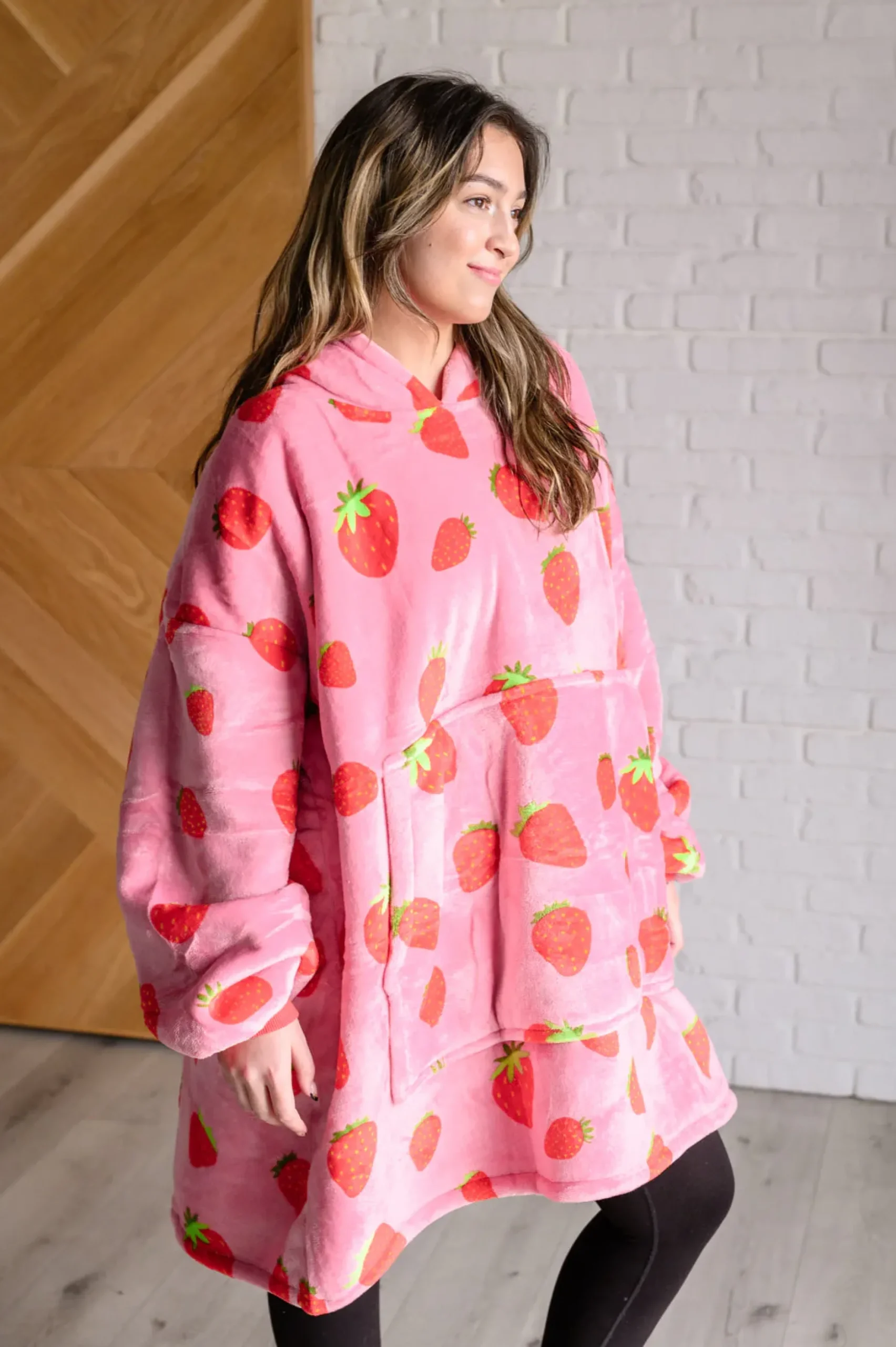 Experience a new kind of cozy all winter long with our Oversized Blanket Hoodie in Strawberry. Made from oh-so-soft poly velour and lined with cozy sherpa for ultimate warmth and comfort, this hoodie features a hooded neckline for full body comfort, deep kangaroo pocket for snacks and the remote, and balloon sleeves with banded, ribbed cuffs. Plus, its weight will instantly soothe you. Get it now and let the comfort wash over you!