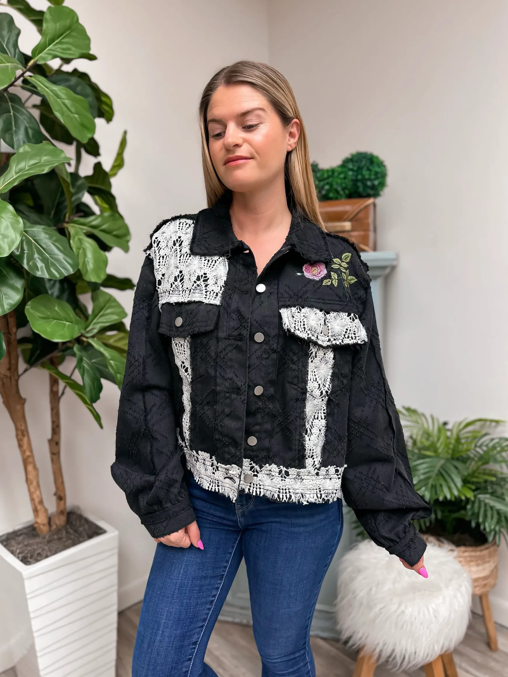 ‘PEACE’ Embroidered Textured Lace Jean Jacket by POL – Black Multi