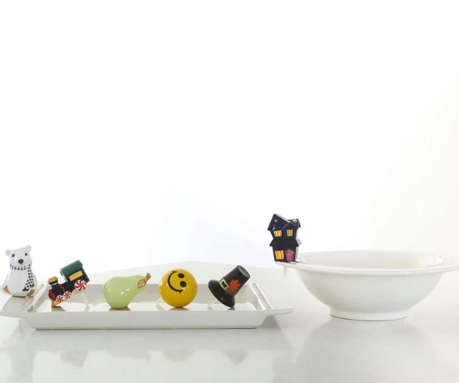 Nora Fleming Mini’s are made specifically to fit into the hole of your Nora Fleming base piece! First we suggest dabbing a drop of water in the hole, and inserting the rubber end, you can pull the stem from the bottom to secure the Mini in place. These are not meant to stand alone, but to compliment your existing Nora Fleming serving pieces – shop the full collection here!