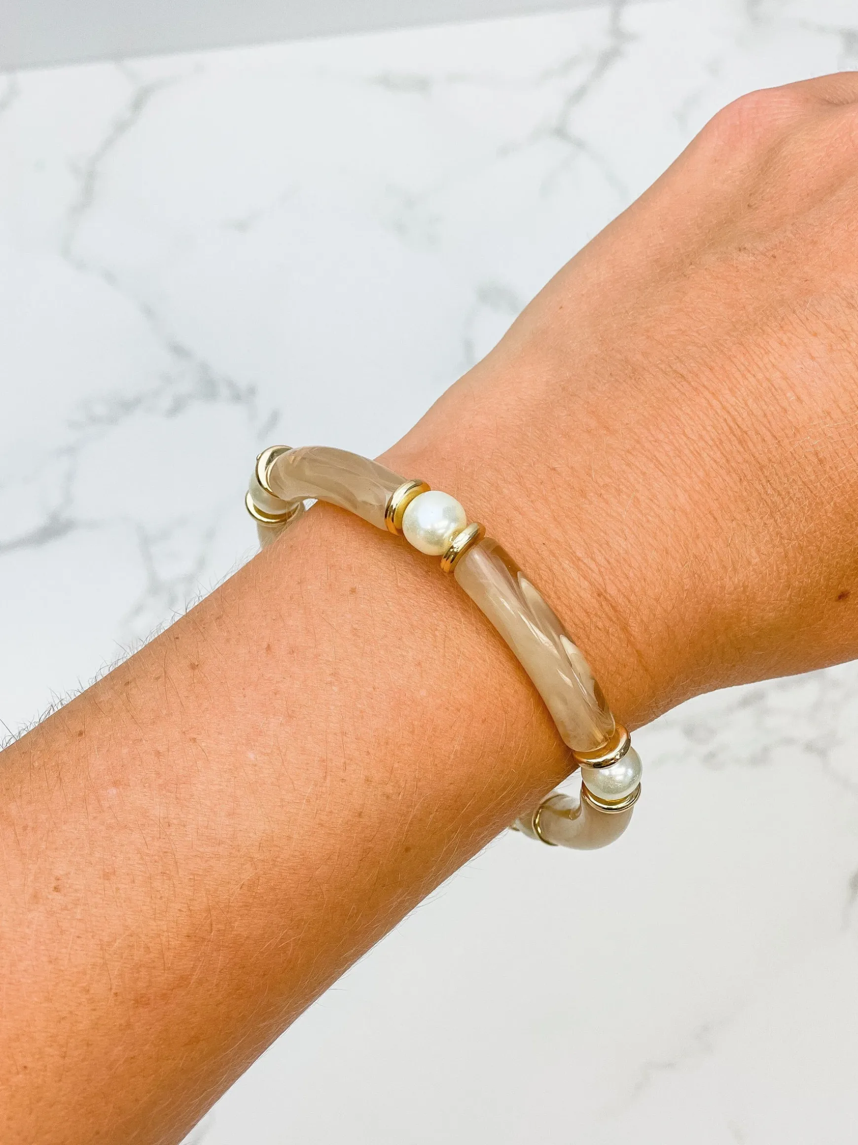 Warm neutrals paired with classic pearls, offer eye-catching everyday style to any arm party!