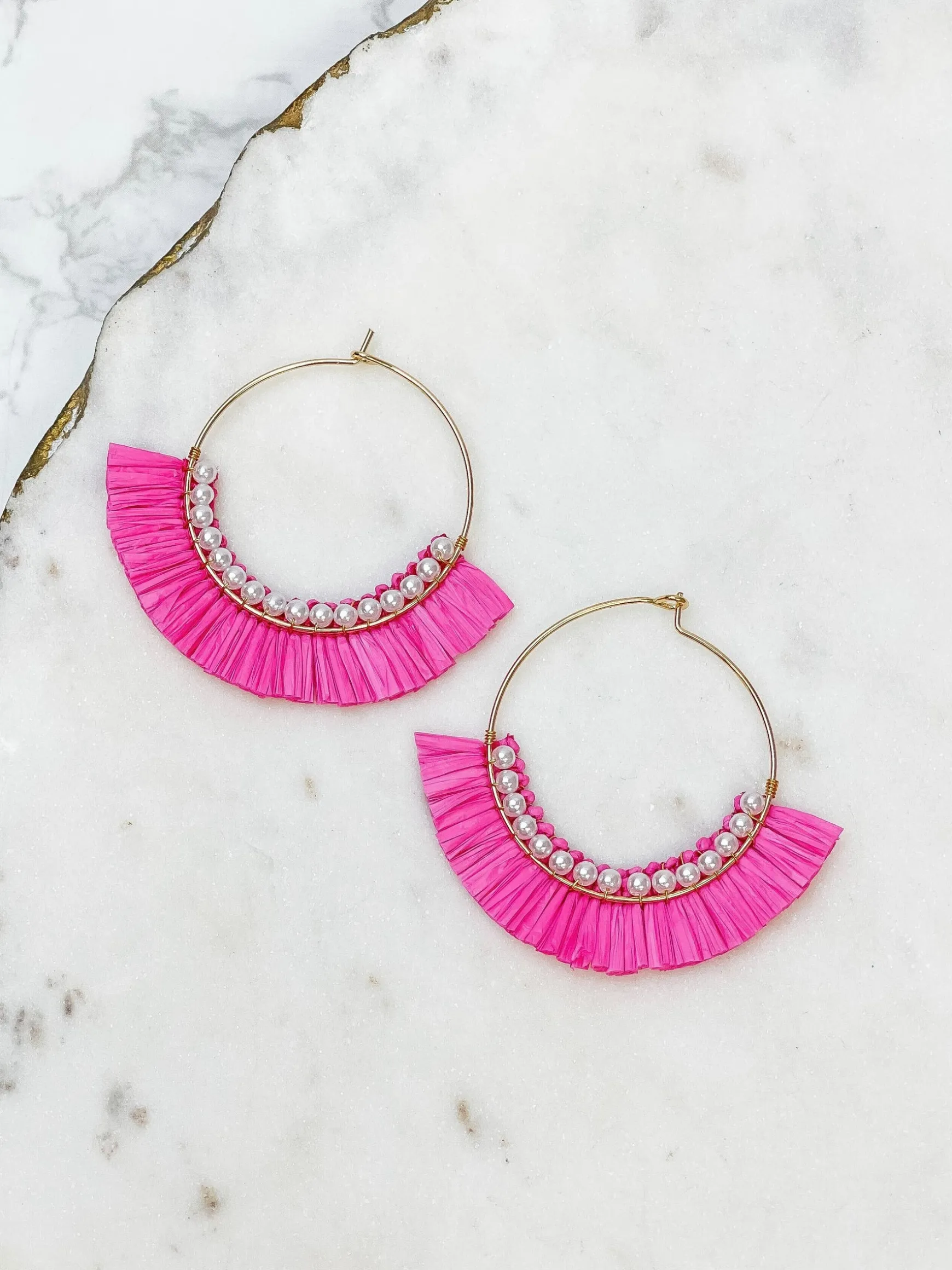 Add a touch of color to your look with these stunning Pink Pearl Lined Raffia Drop Dangle Earrings.