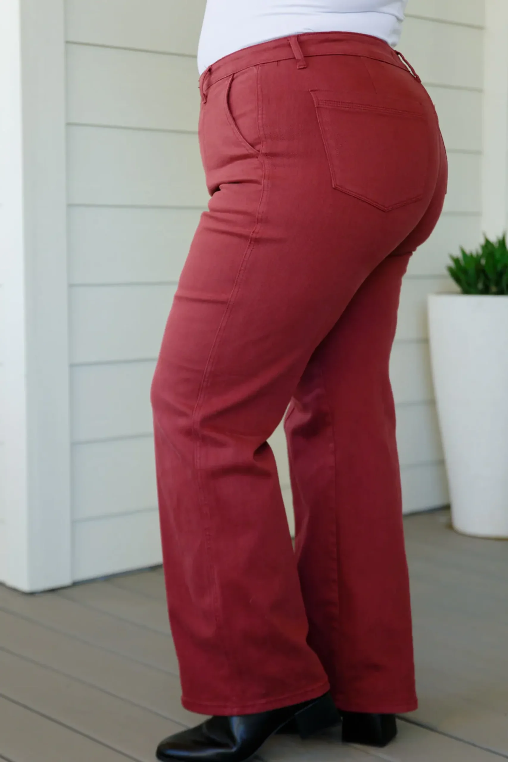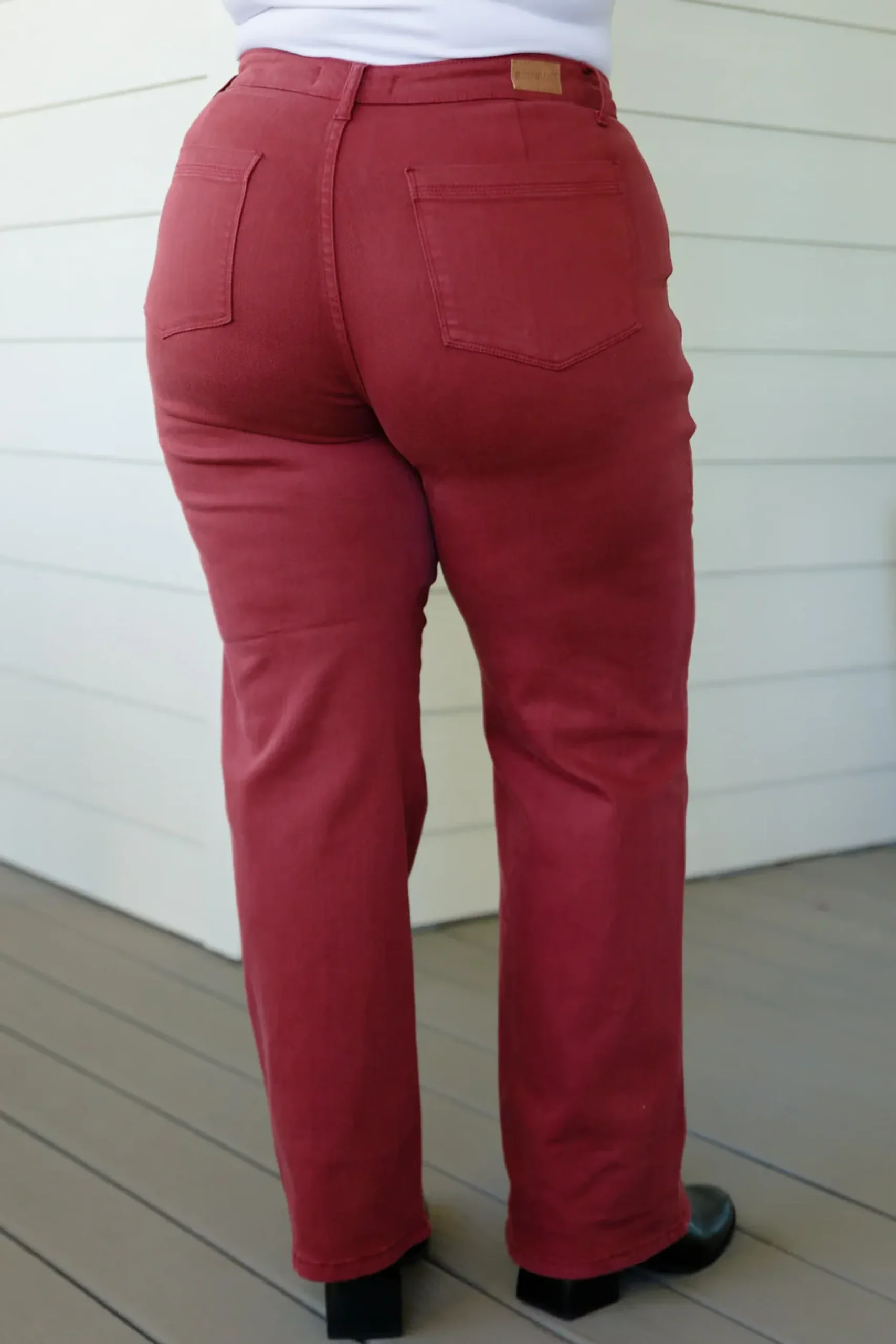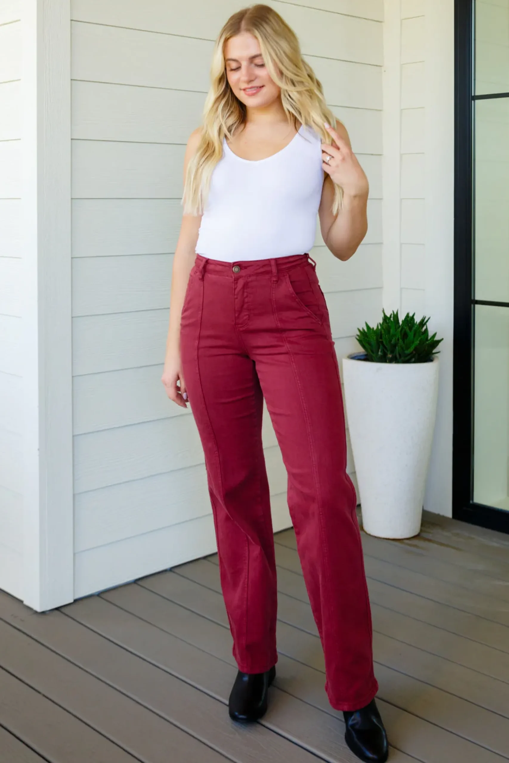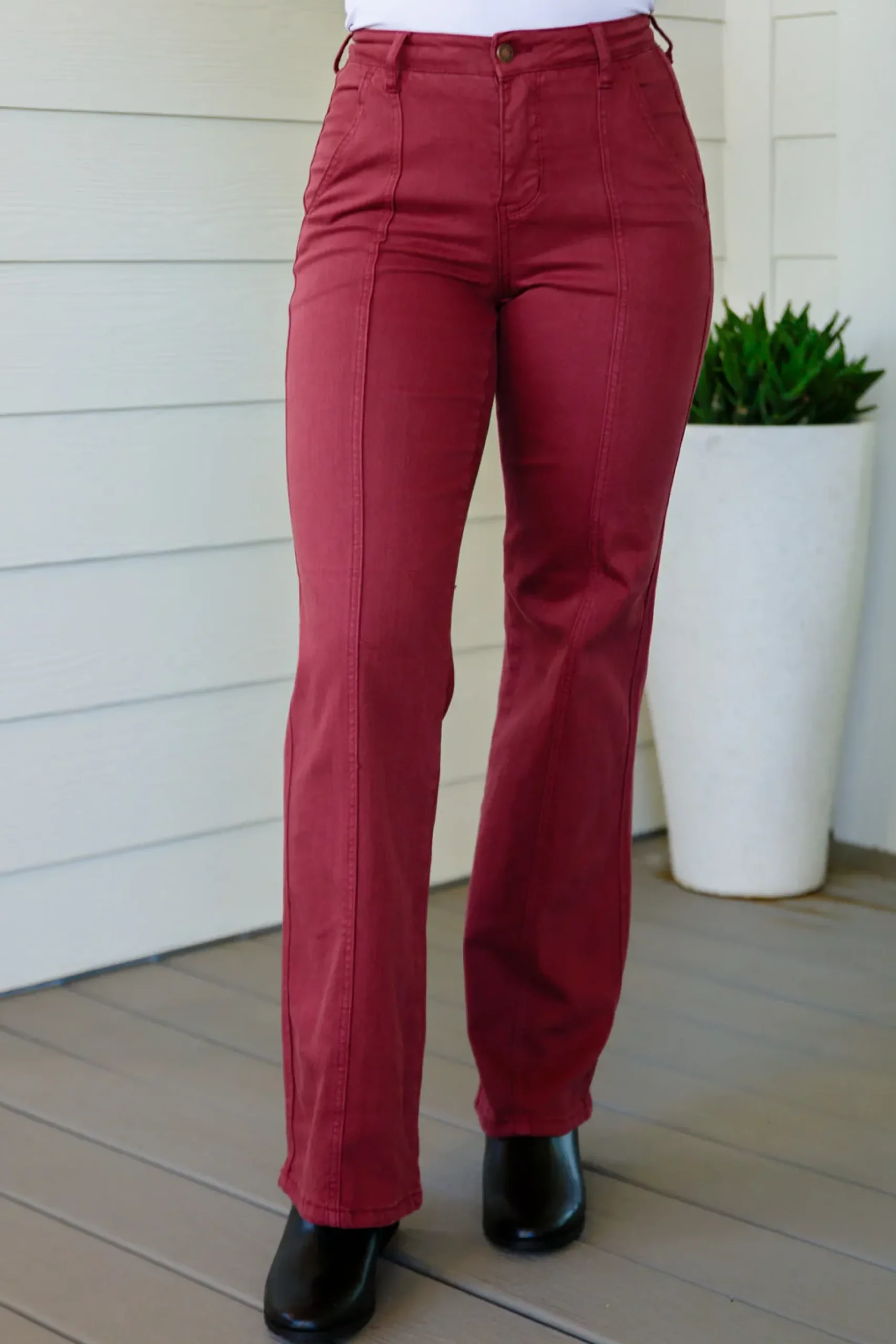 Introducing our Phoebe High Rise Jeans from Judy Blue, designed with a flattering center front seam and a comfortable, straight-leg silhouette. Featured in a rich burgundy, each piece is garment-dyed for a uniquely personal touch. Get the ultimate fit and style – upgrade your wardrobe today!