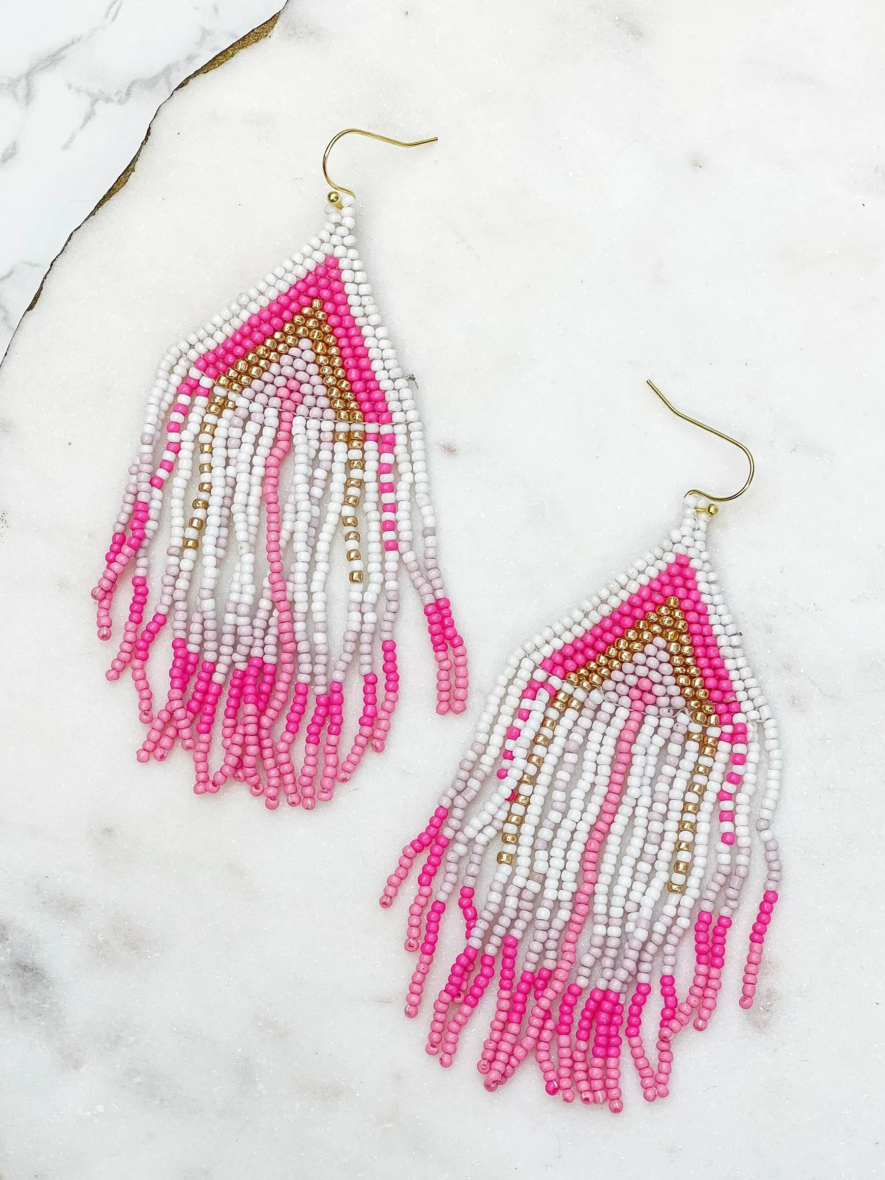 Pink, White & Gold Fringe Seed Bead Dangle Earrings
