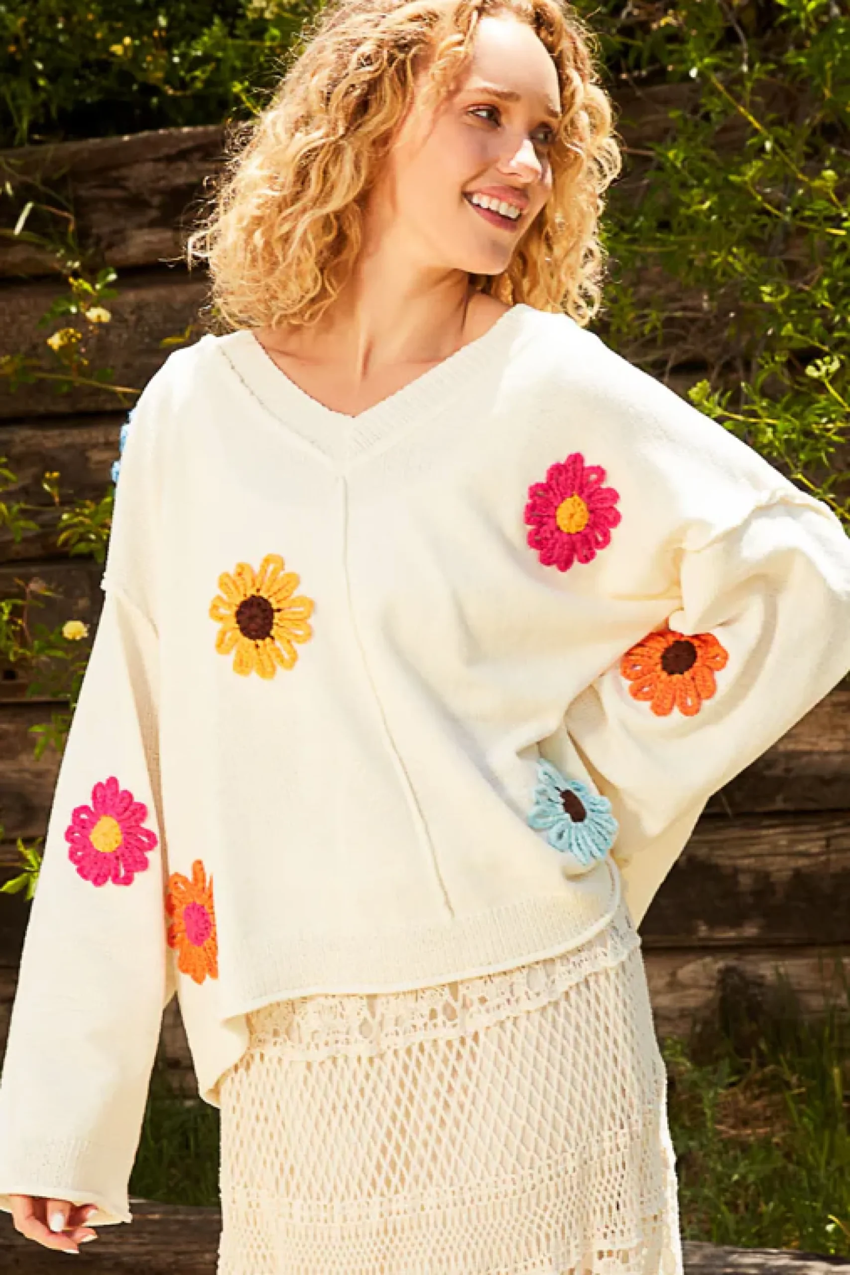 V-neck long sleeve relaxed fit sweater in chenille with flower patches.