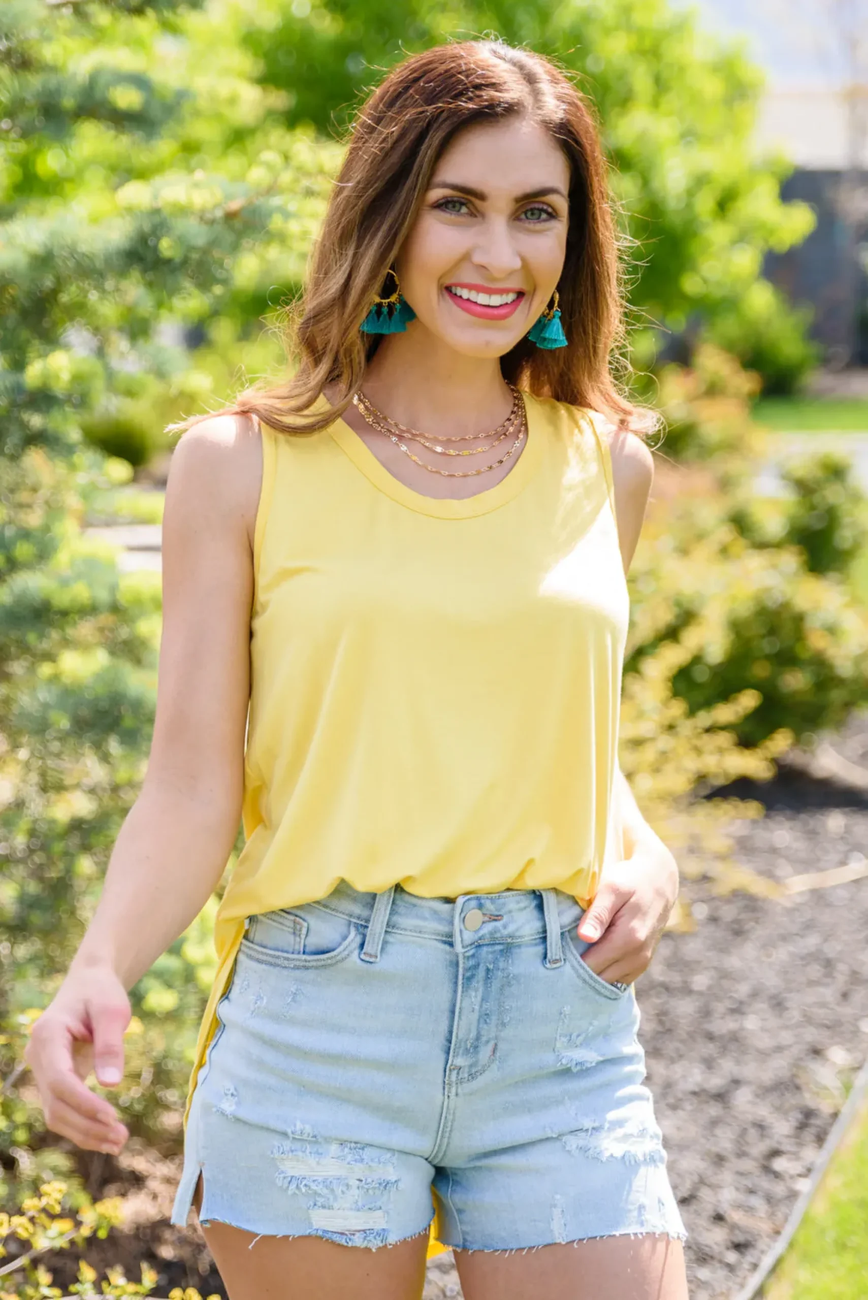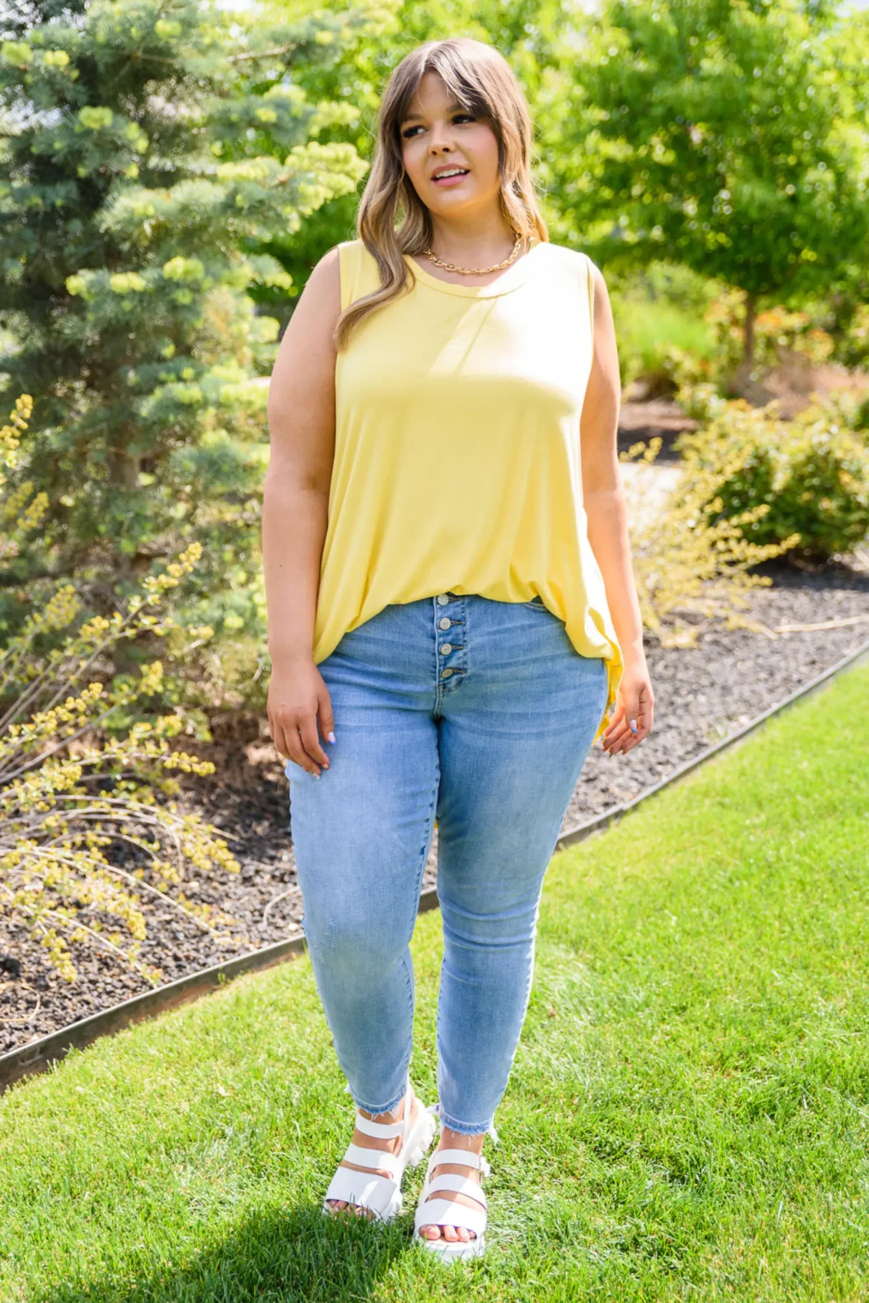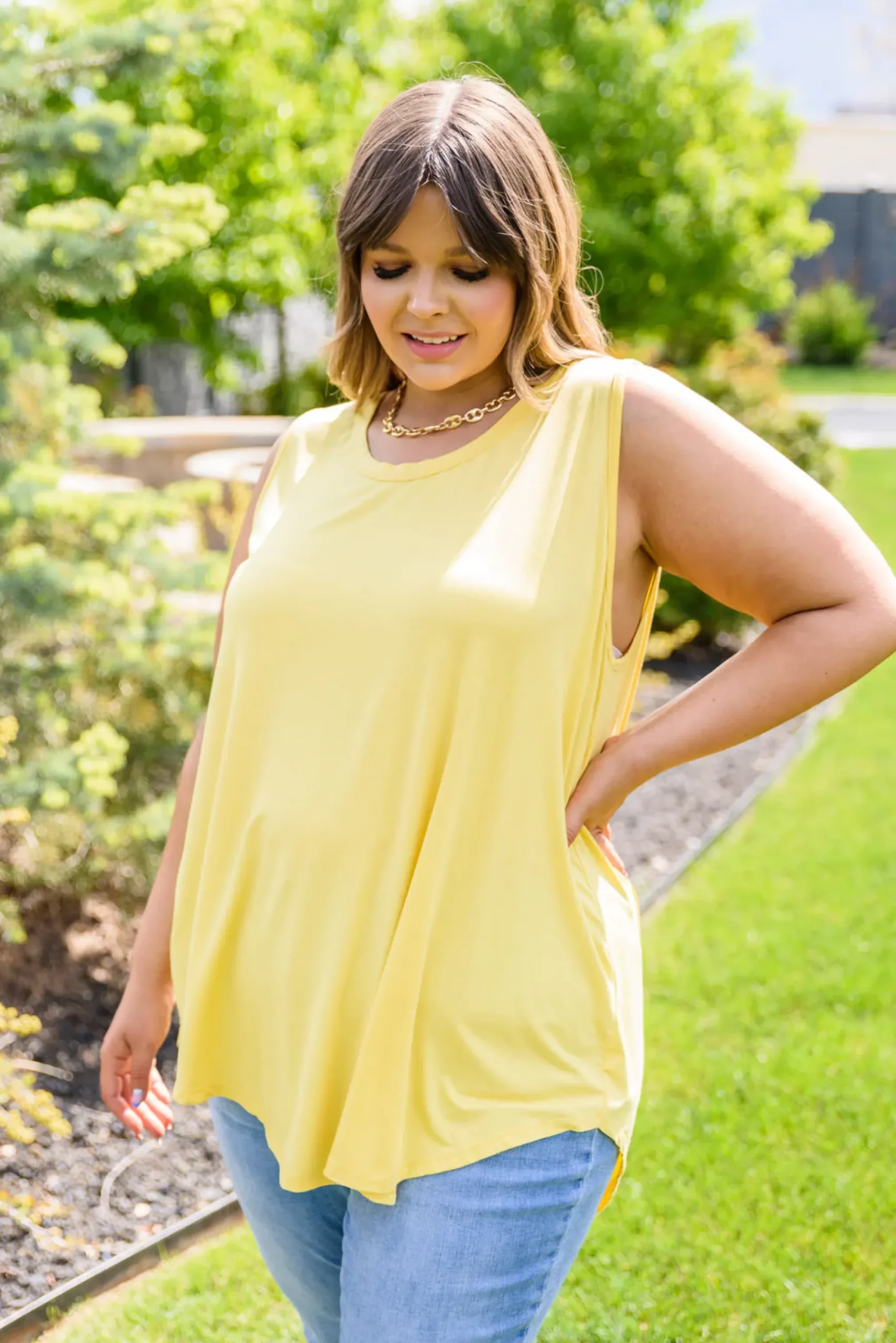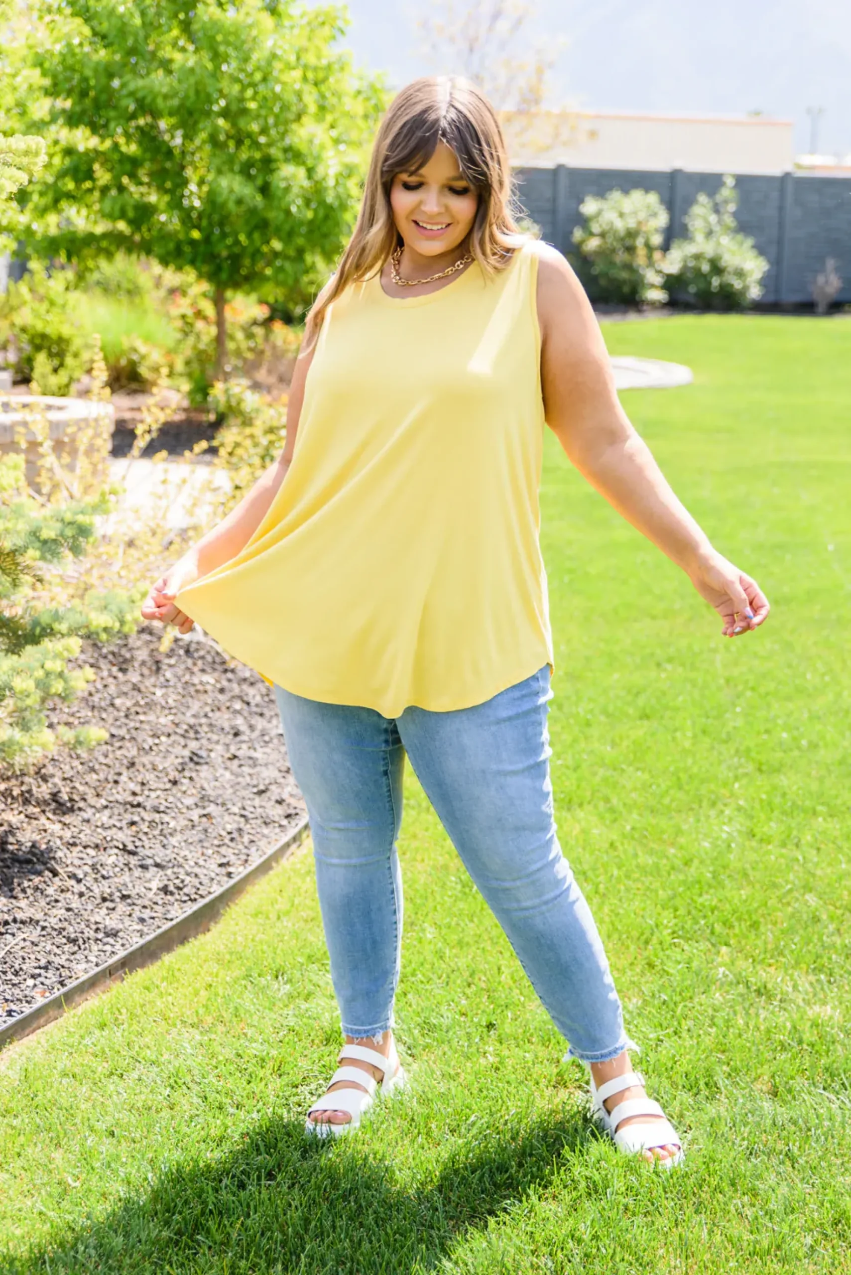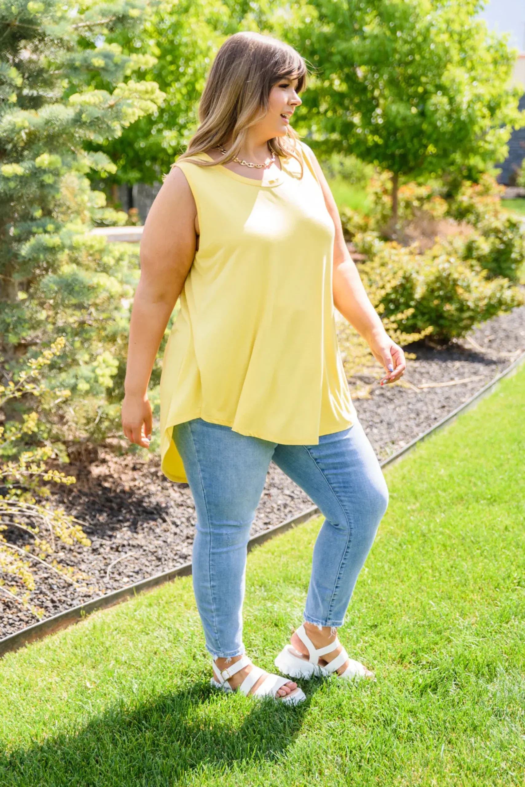 Create a casual look you’ll absolutely love in the Pure Sunshine Top! This lightweight, flowy top is bound to keep you cool and cute in the summer sun! Featuring a round neckline, sleeveless cut, and slight high-low hem. Pair with light wash denim shorts and white sneakers for a casual & stylish look!