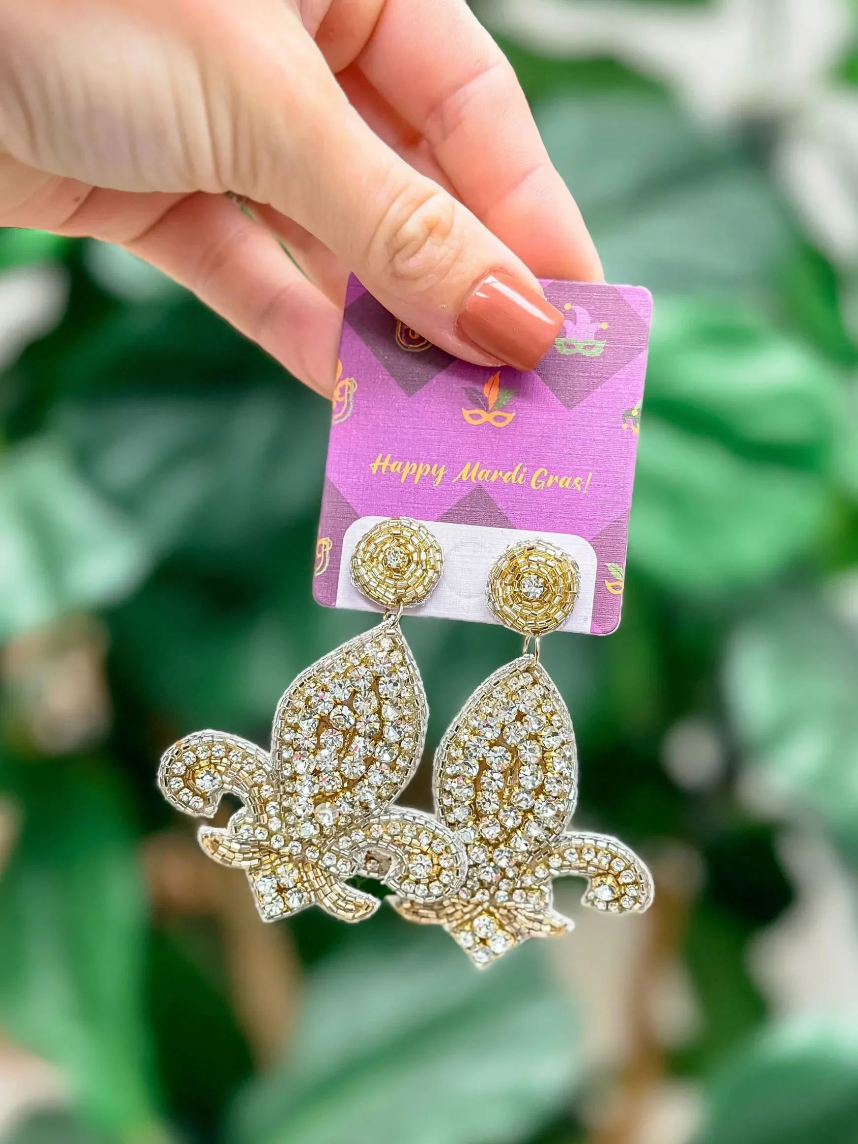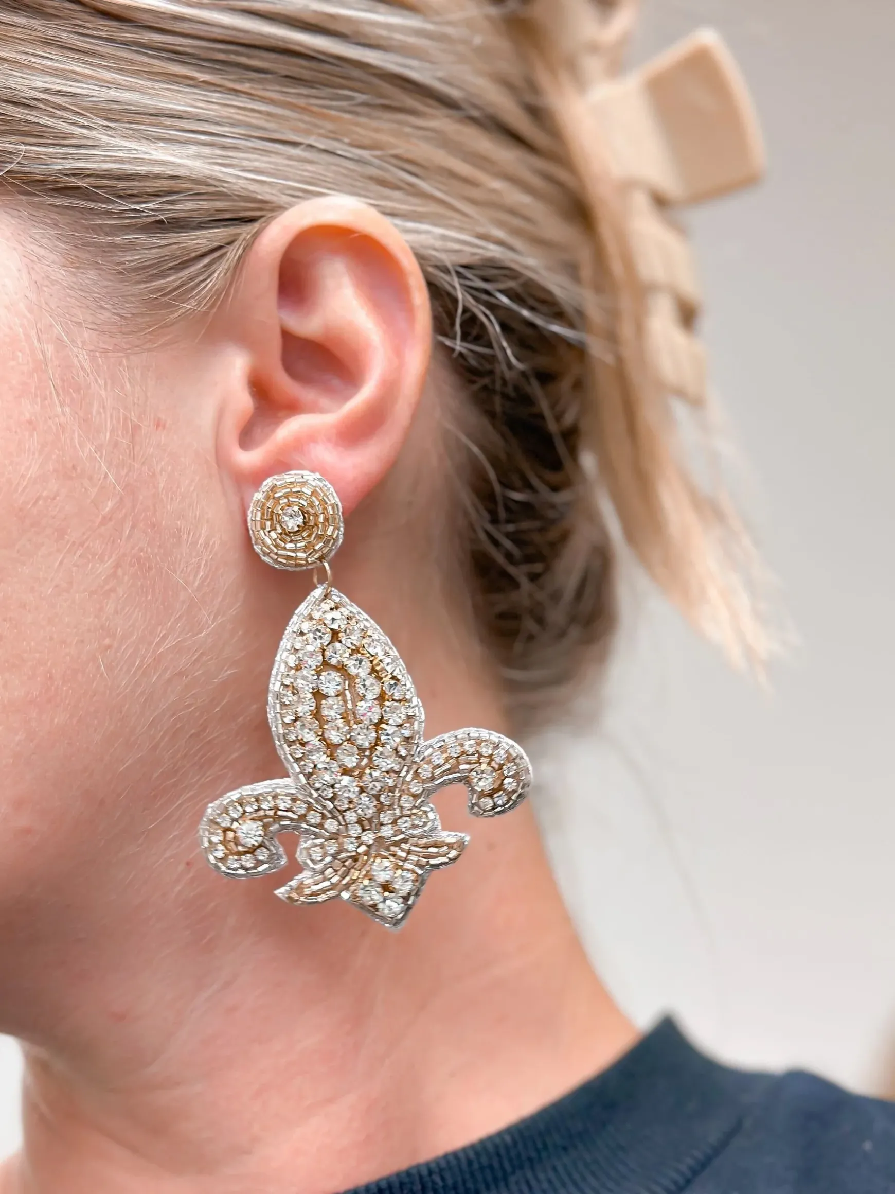 Turn heads with these stylish Rhinestone Fleur De Lis Statement Earrings.