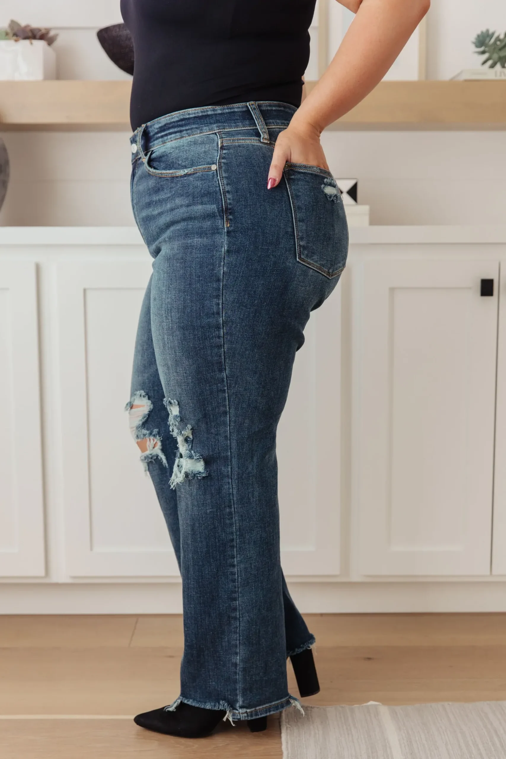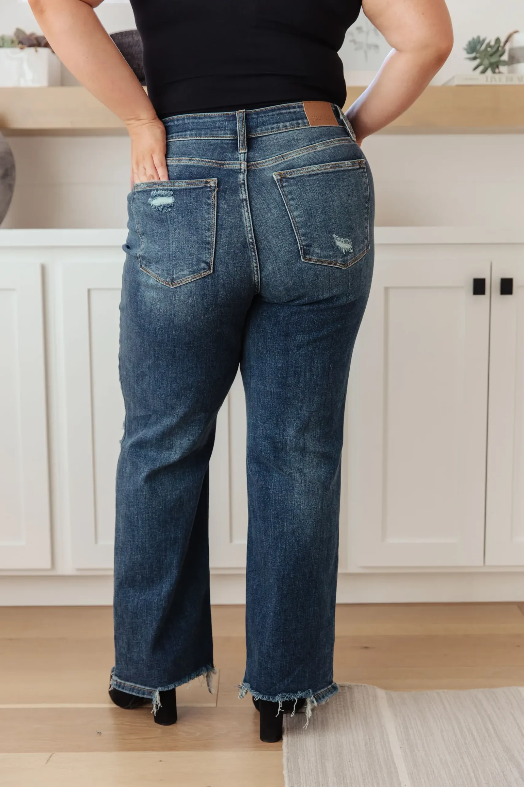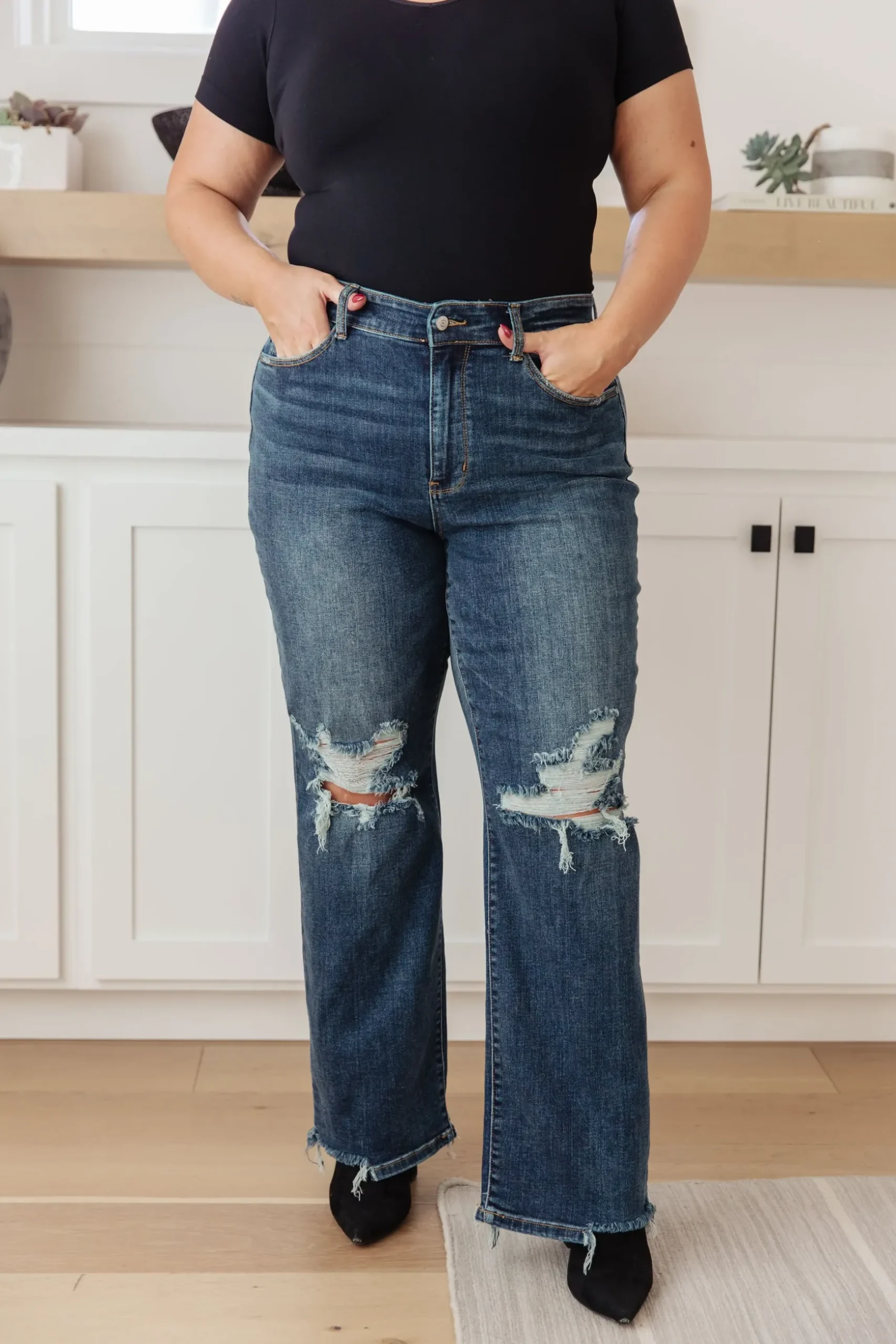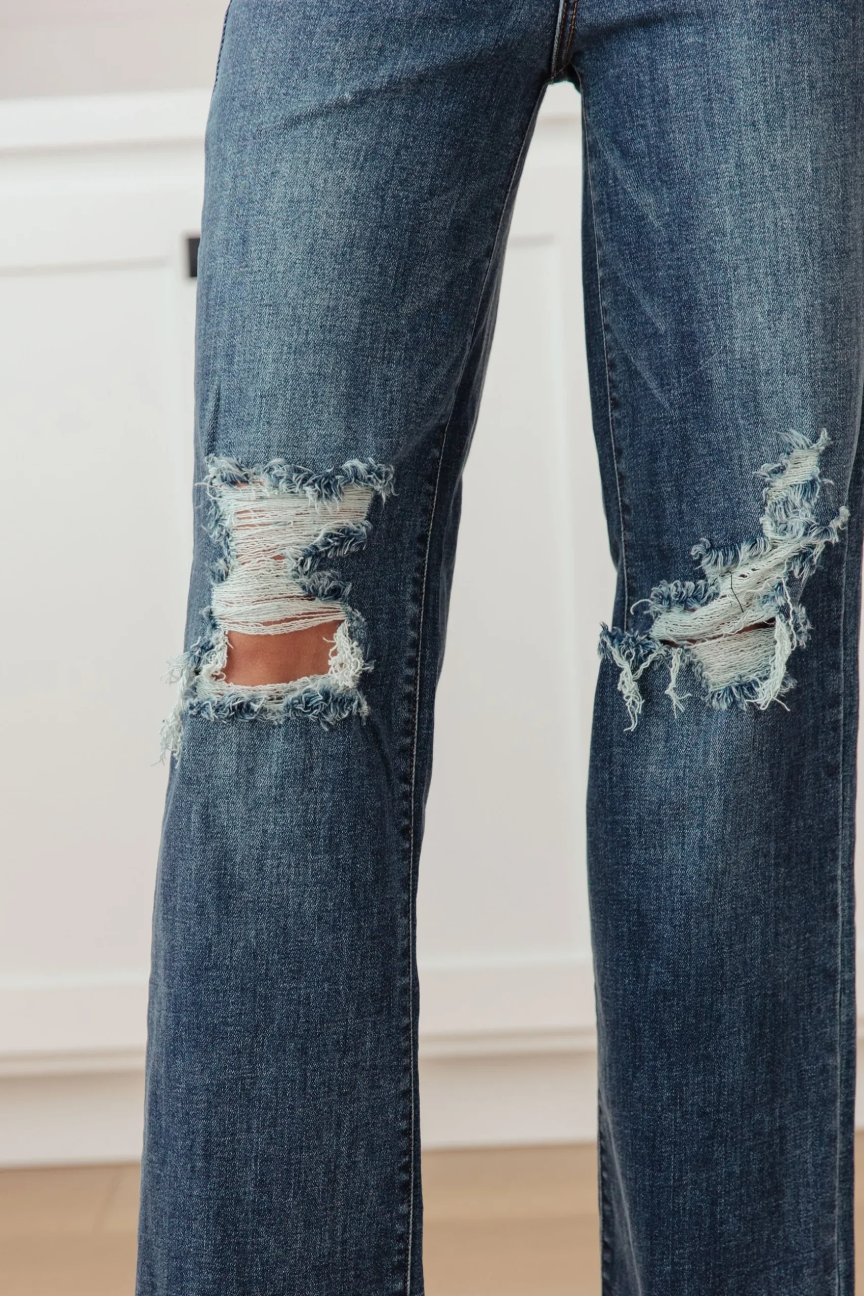 Your best outfits start with the Rose High Rise 90’s Straight Jeans! Featuring a stretchy, dark wash denim that shapes a high rise waist with five pocket cut and zipper fly. 90’s Straight cut pant legs end with chewed hems with distressing at the knees.