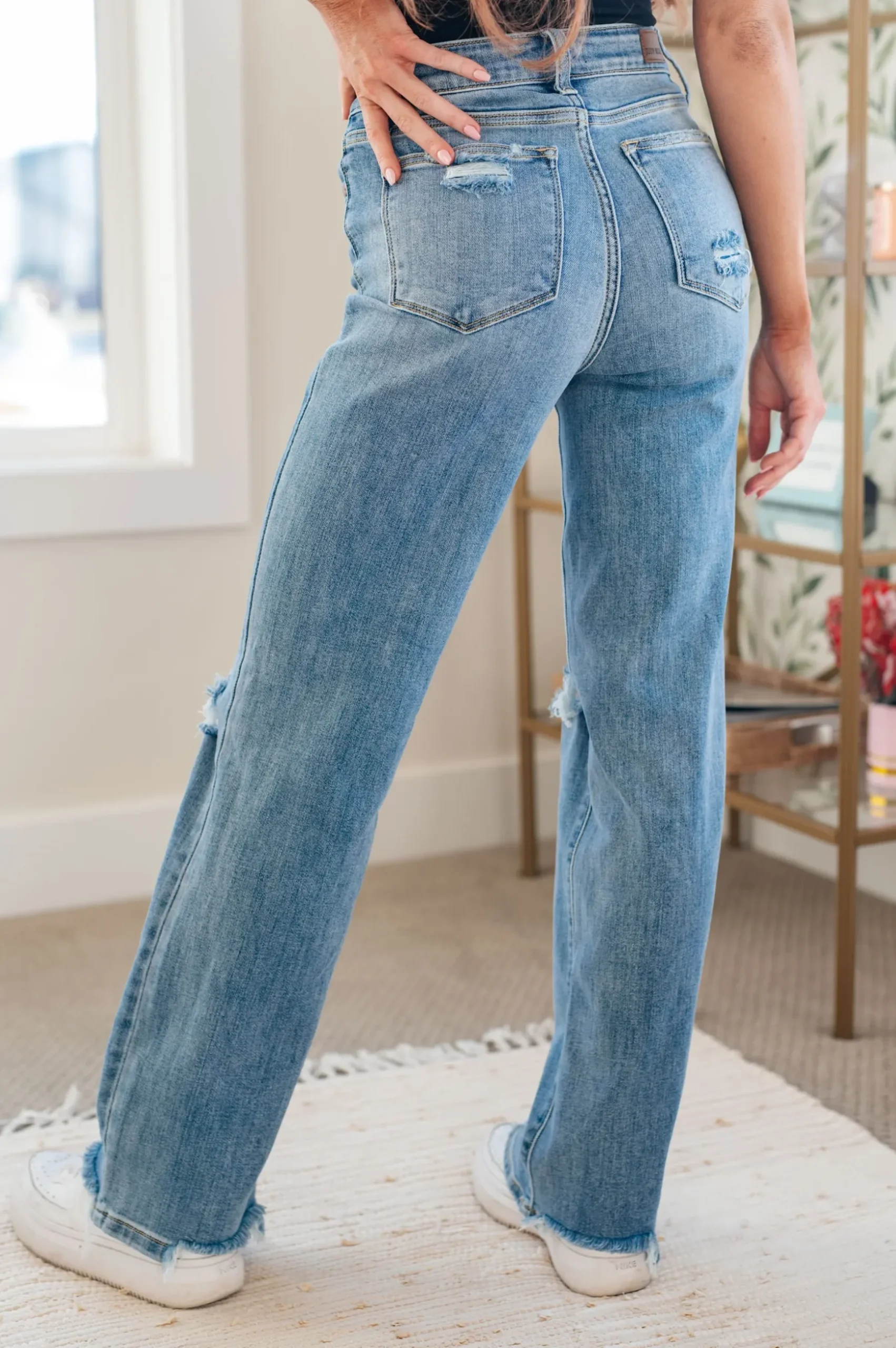 Your best outfits start with the Rose High Rise 90’s Straight Jeans! Featuring a stretchy, light wash denim that shapes a high rise waist with five pocket cut and zipper fly. 90’s Straight cut pant legs end with chewed hems with distressing at the knees.
