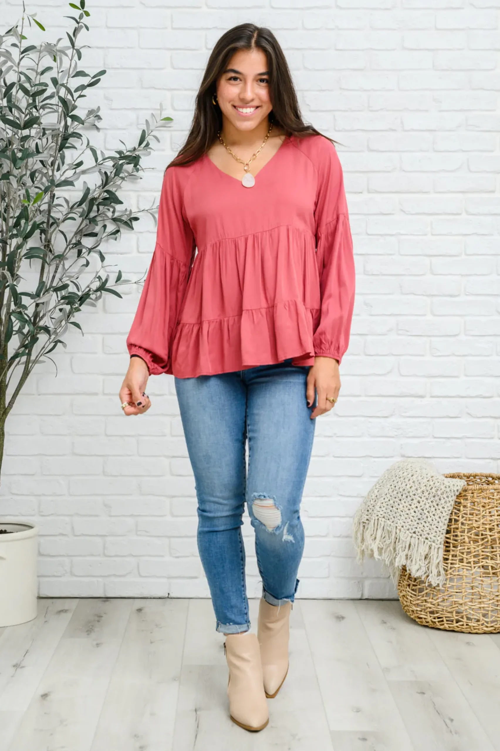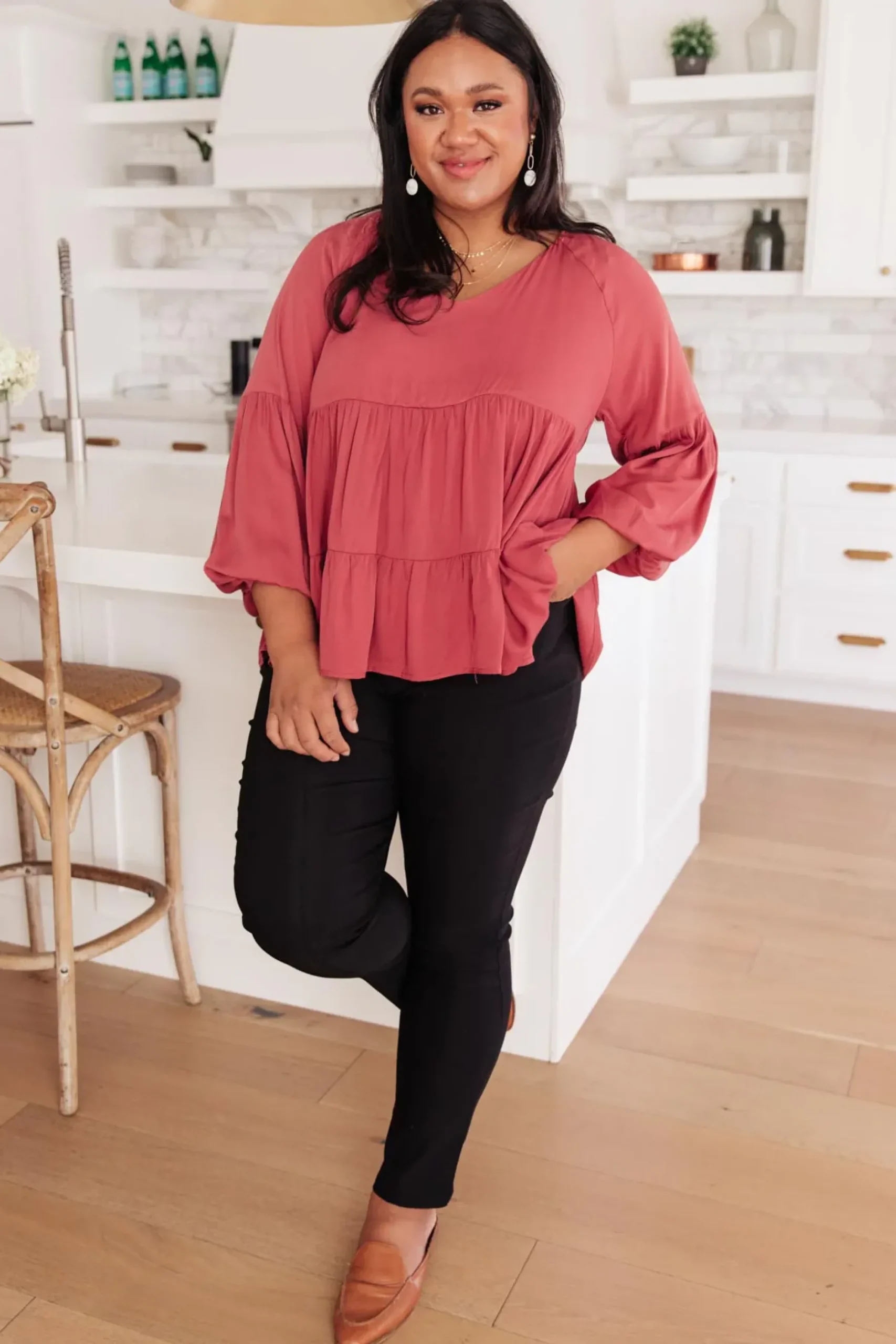 The Sassy Swing Tiered Top is a romantic blouse with soft bishop sleeves. This tiered top has beautiful movement and is a show stopping color! Pair it with black trousers and gold jewelry.