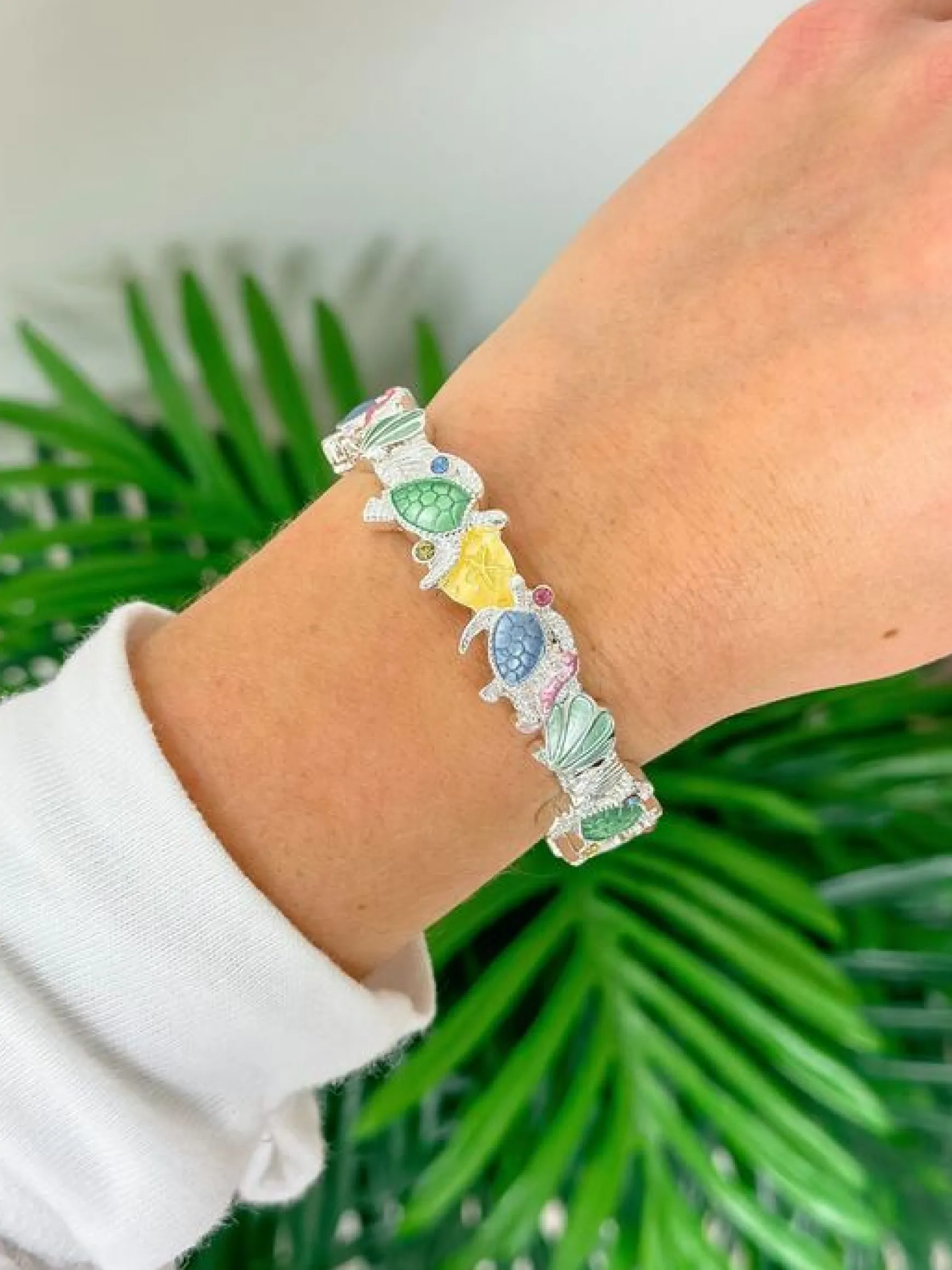 This Sea Life Enamel Stretch Bracelet is a unique piece featuring intricate turtle shell designs.