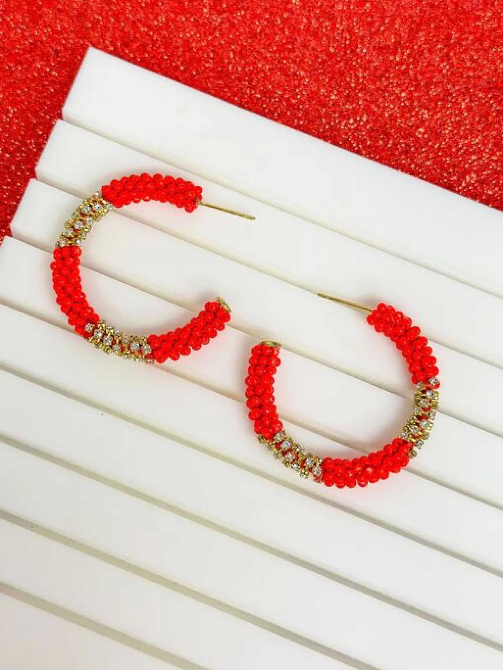 Add a pop of color and fun to your outfit with our Seed Bead & Rhinestone Hoop Earrings! Perfect for Valentine’s Day, these lightweight earrings are sure to make a statement.