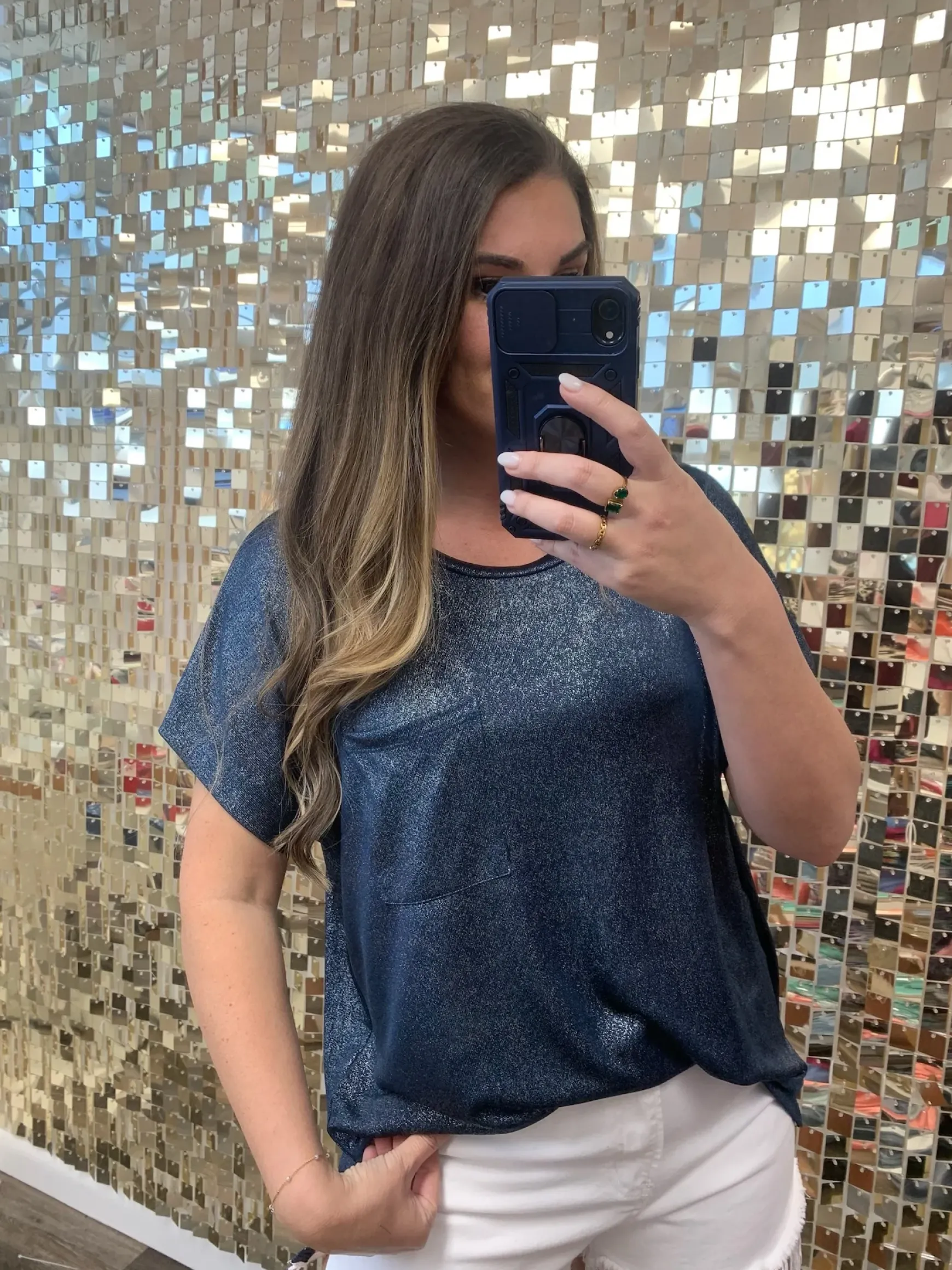 This shimmering top features a relaxed fit with a soft, lightweight fabric and a single front pocket, adding both elegance and practicality. Its subtle sparkle and flowy silhouette make it perfect for casual outings or evening occasions. Designed with a classic round neckline and short sleeves, it effortlessly blends comfort and style.