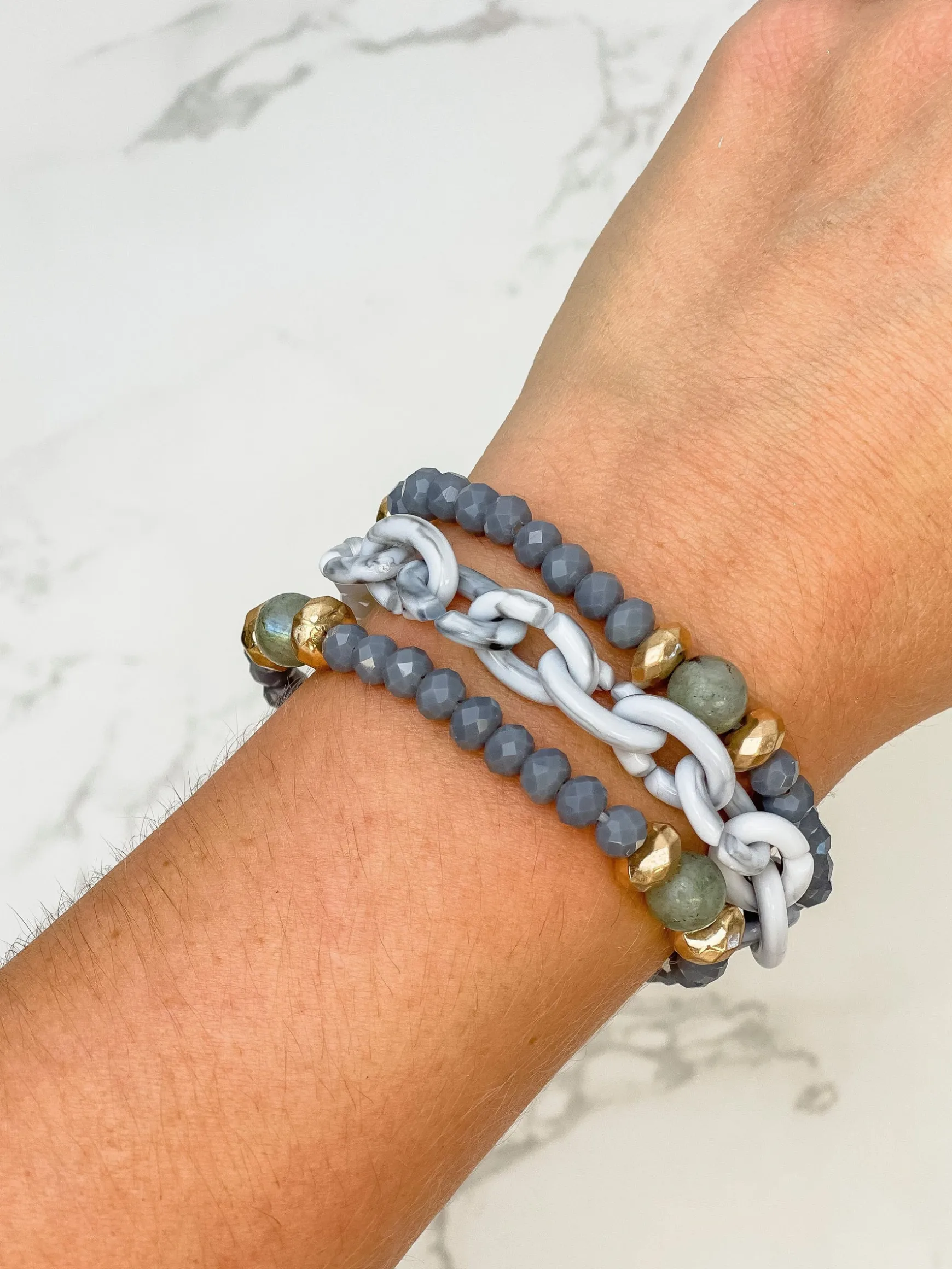 Stone Chain & Glass Bead Stretch Bracelet Set – Gray