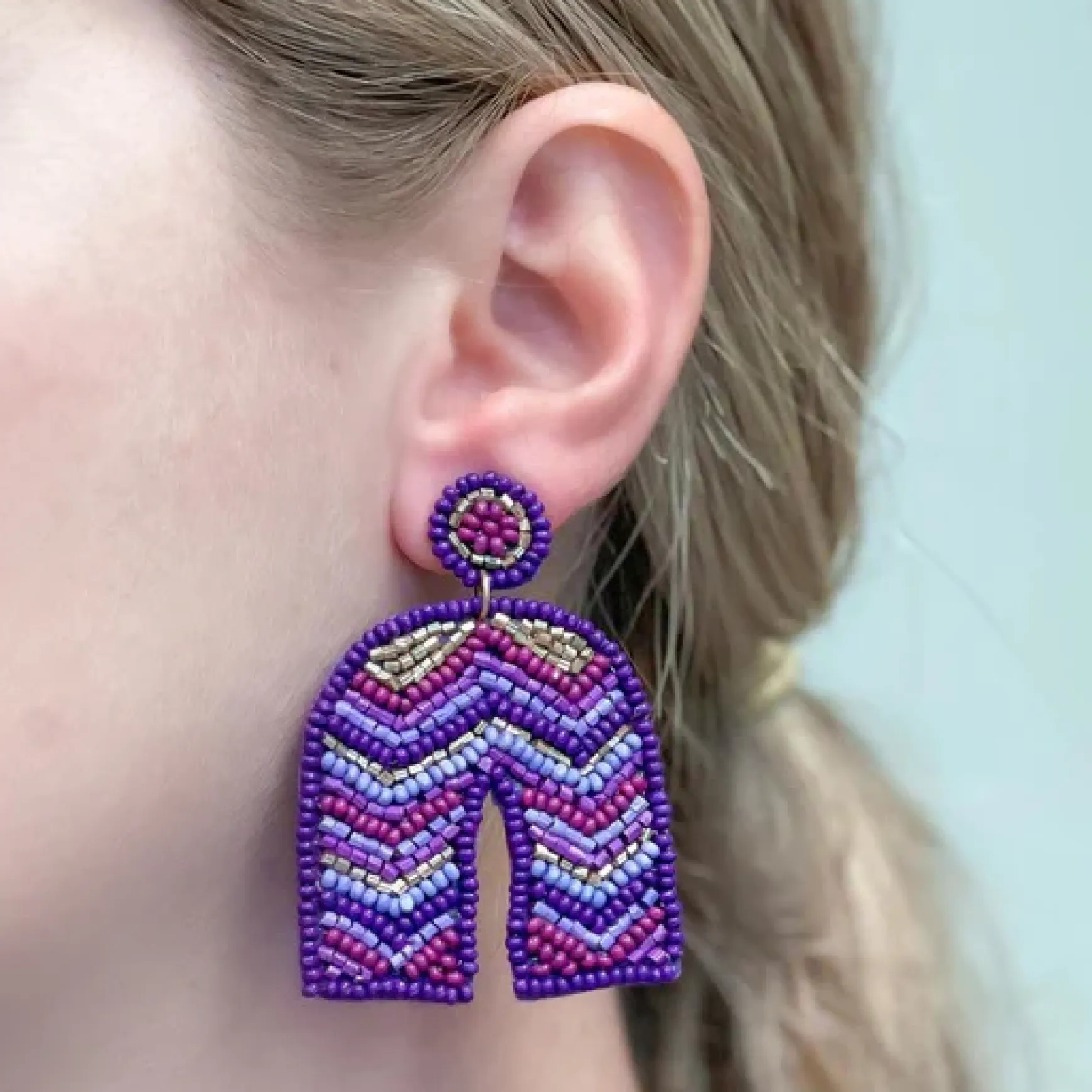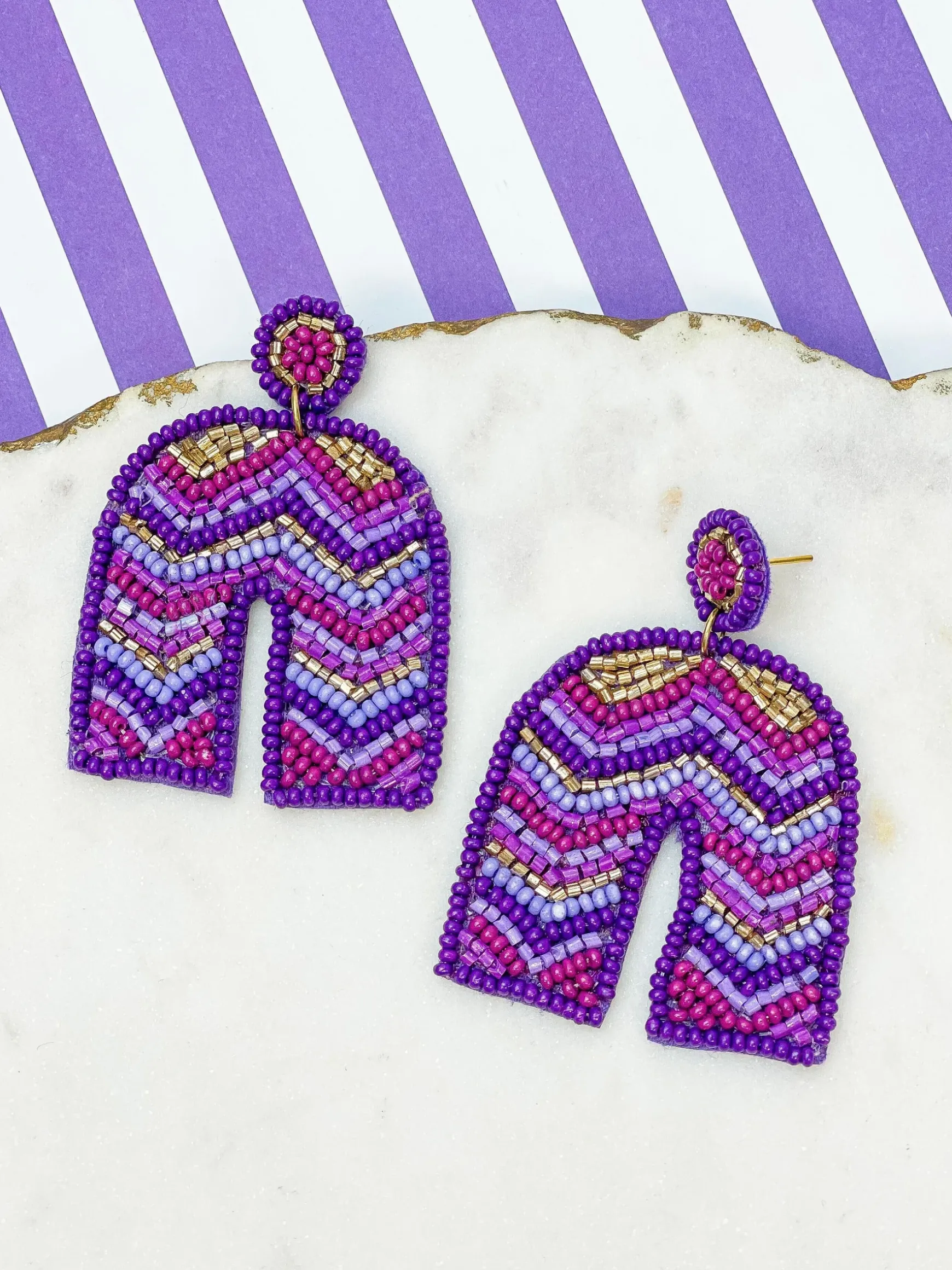 Elevate your outfit with our Purple Striped Beaded Horseshoe Dangle Earrings. These fun statement earrings add a touch of whimsy to any look. The unique design and playful colors make them a must-have accessory. Upgrade your style with these eye-catching earrings.