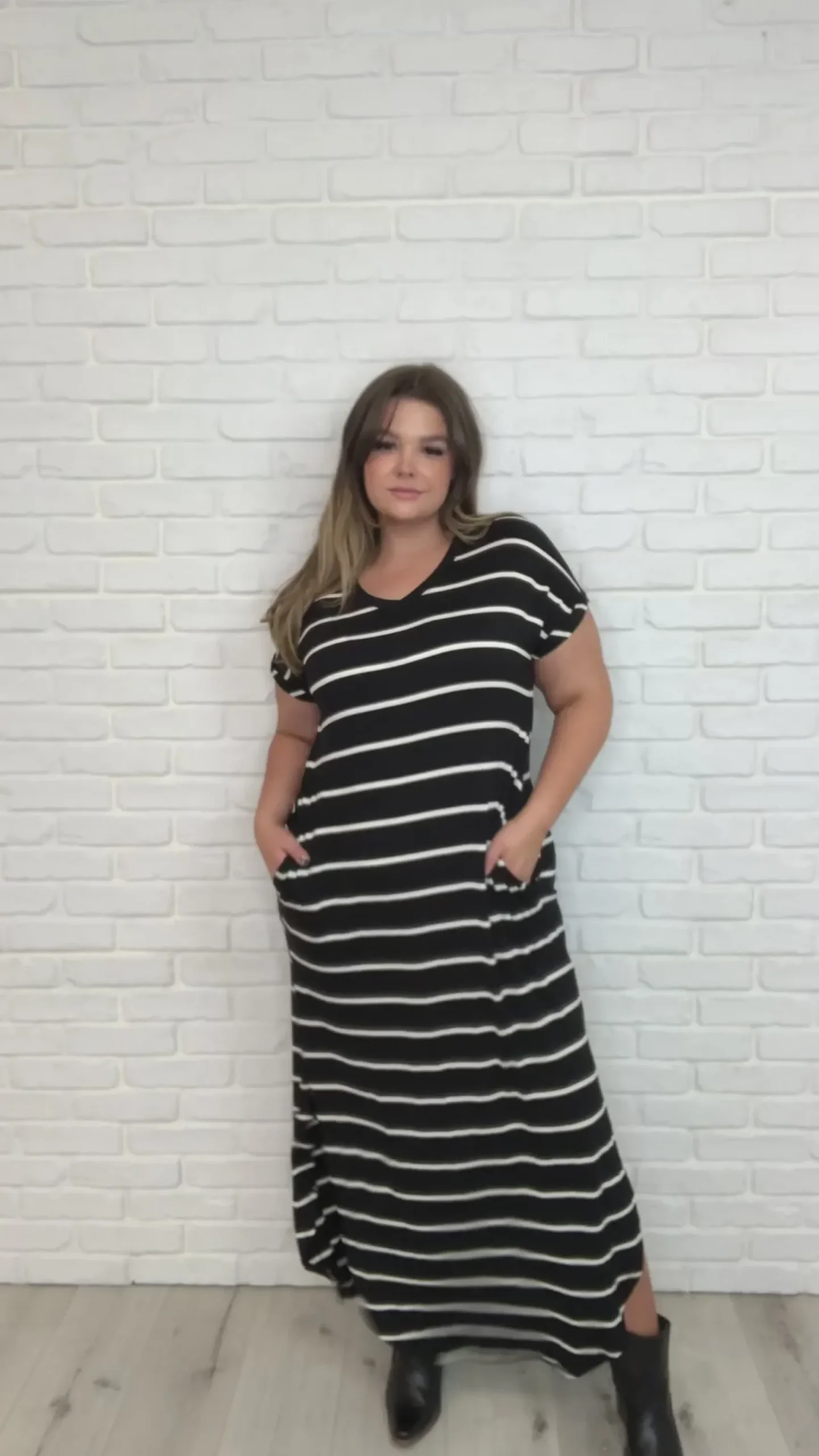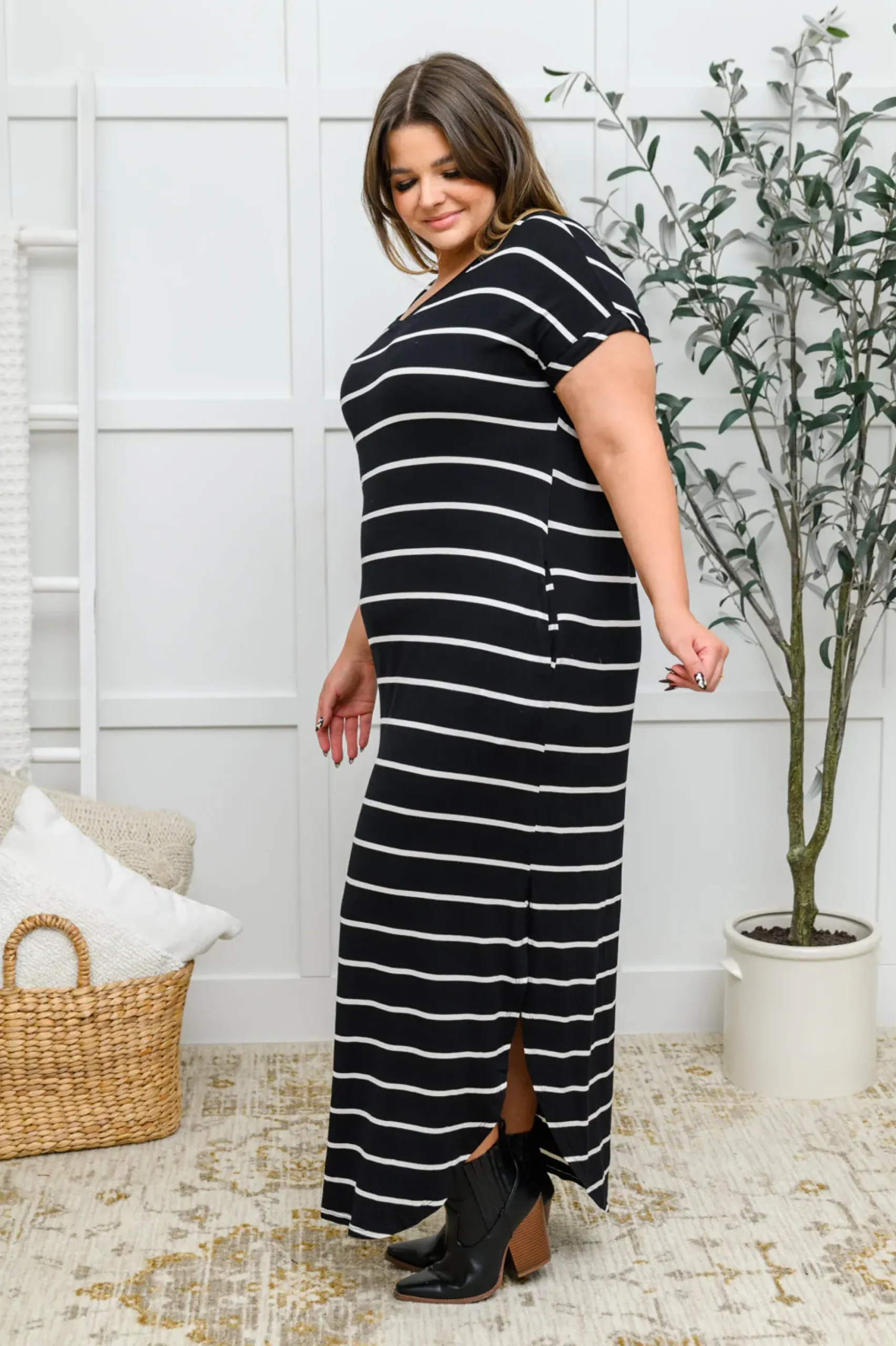 This striped V-Neck basic maxi dress with cuffed short sleeves, side pockets and side slits are sure to be a long-term closet staple. With a double Round Hem that’s lightweight. Dress unlined.