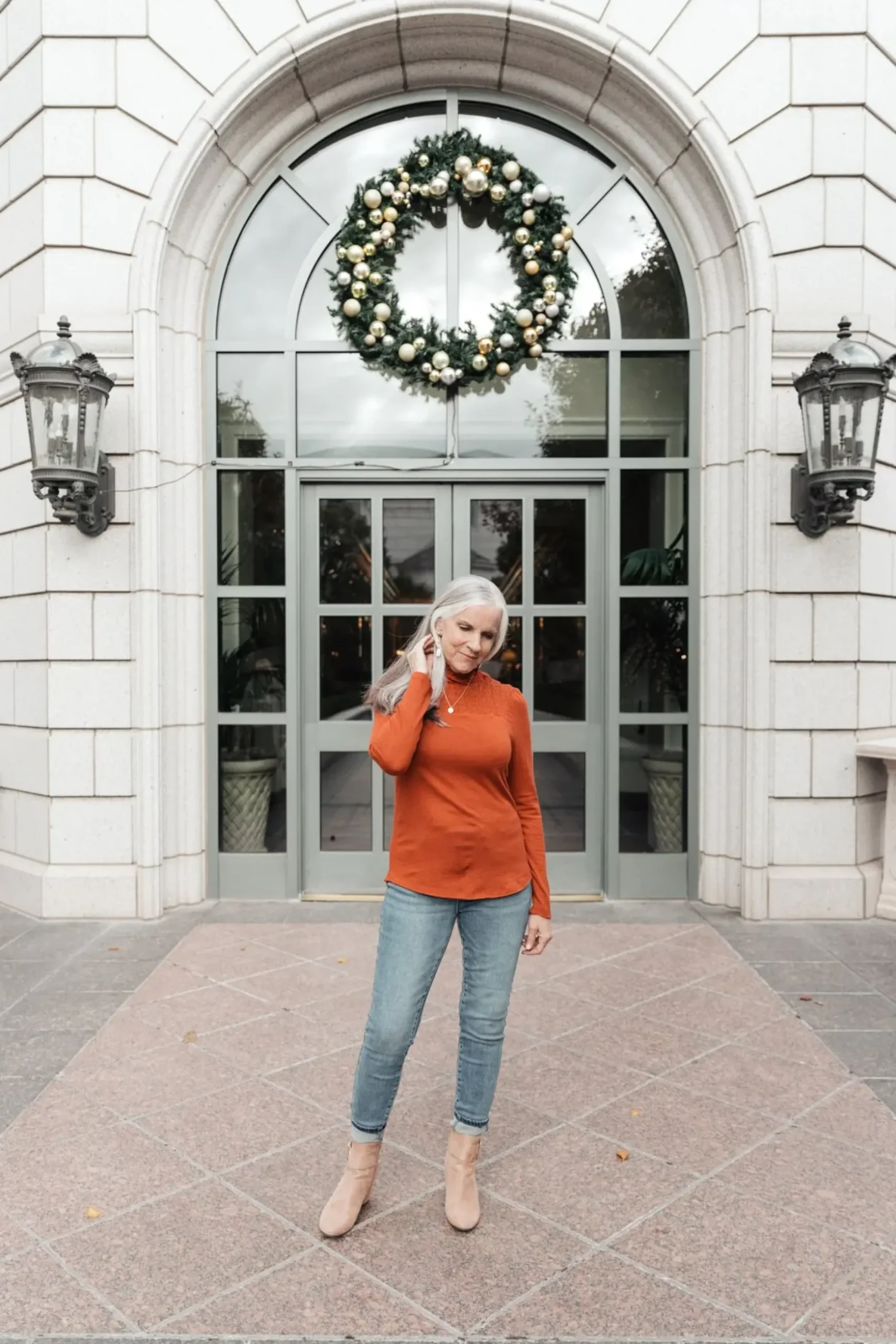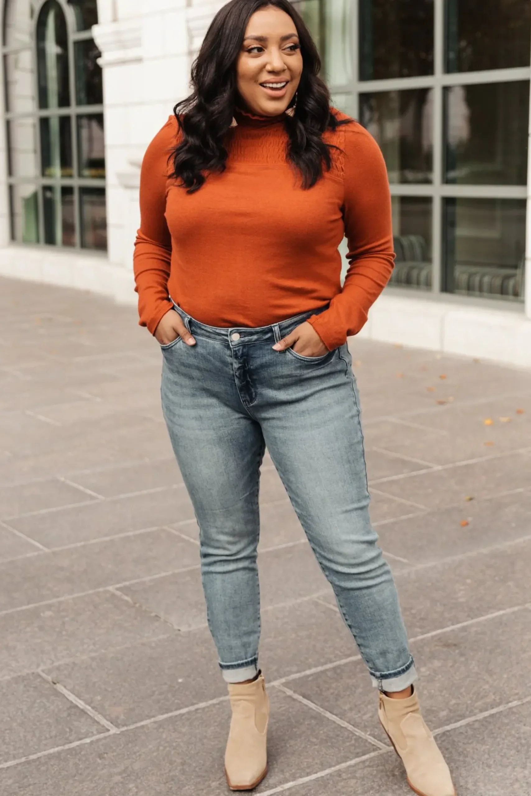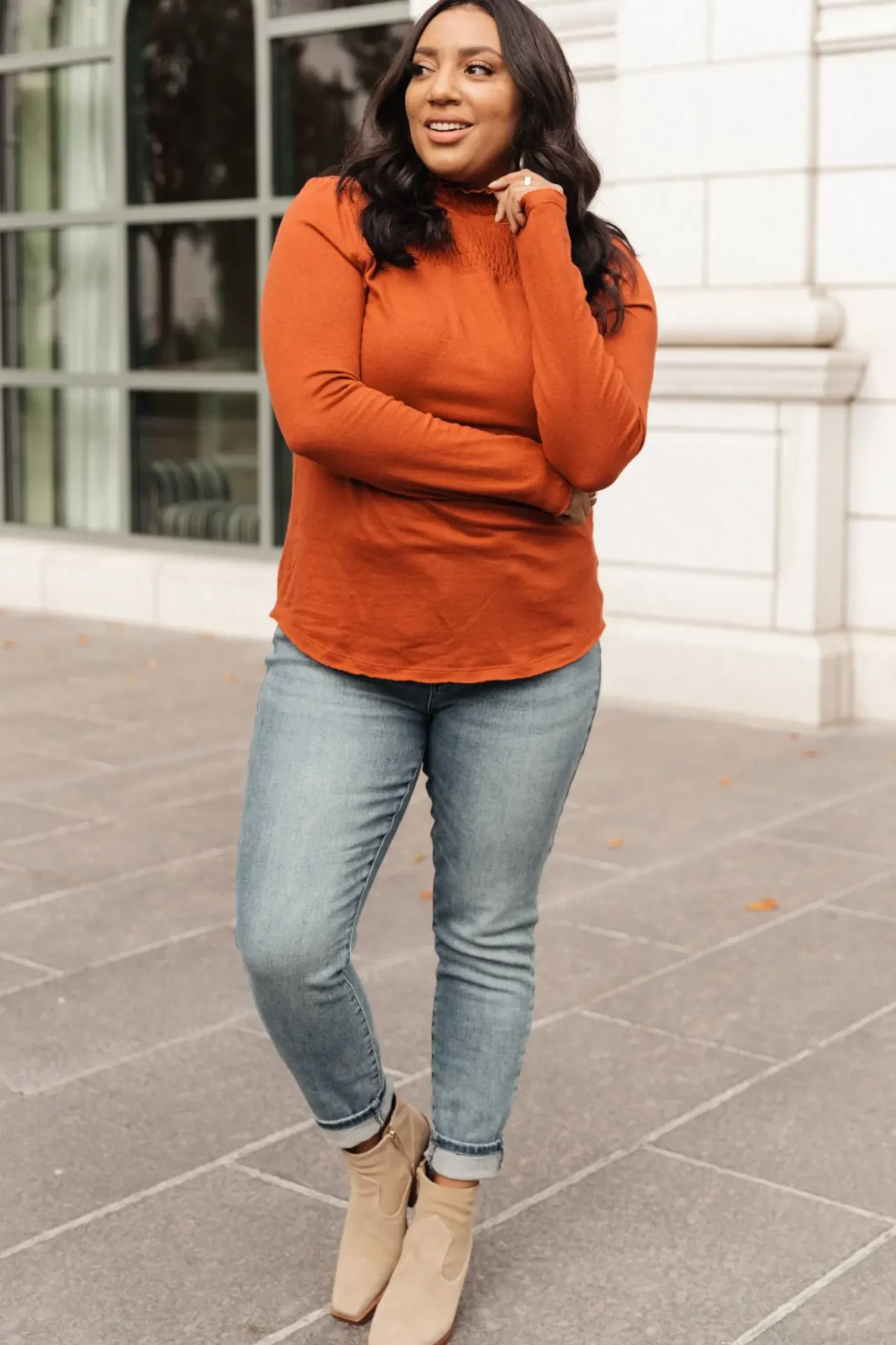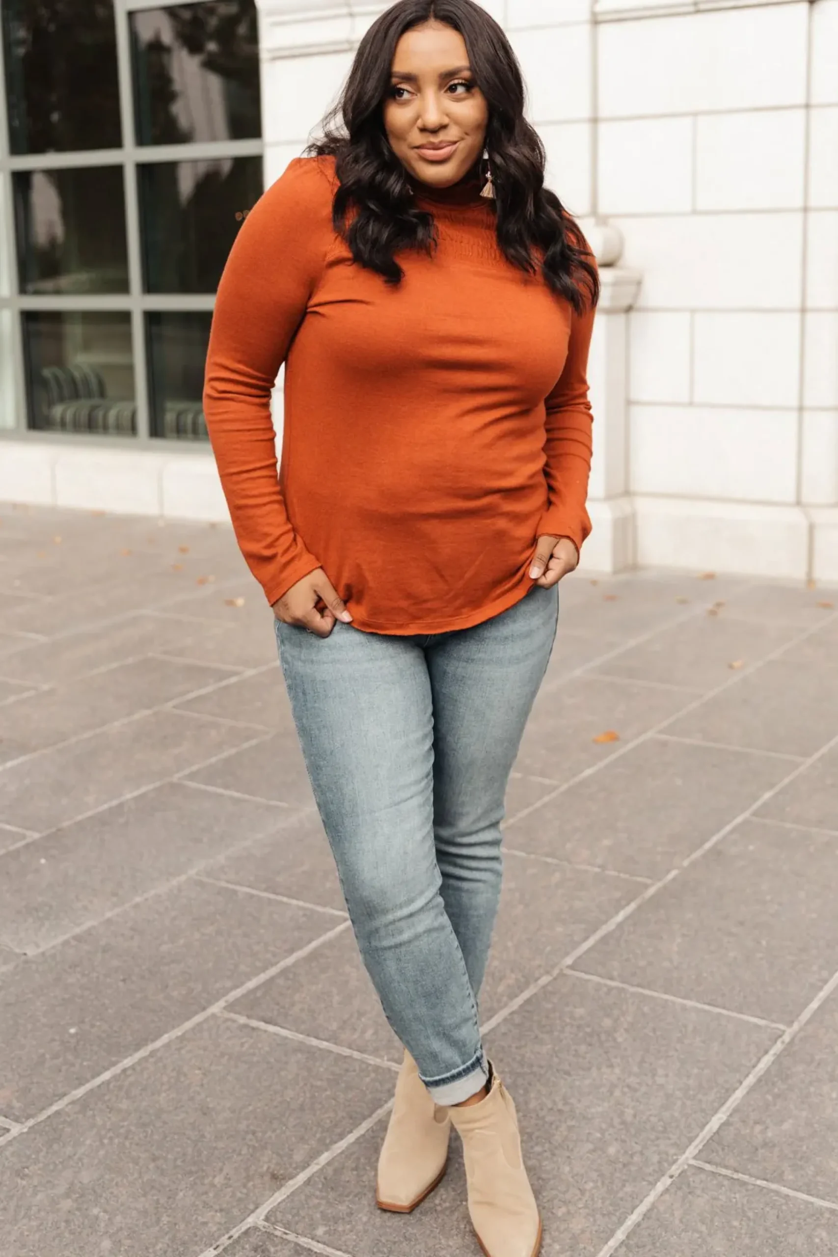 Spice up your style with this rust-colored turtleneck top with ruched detailing along the neckline! A touch of stretch that hugs your body in all the right places. Fitted long sleeves and form fitting body throughout, it’s the ultimate layering shirt to add a pop of color to your closet!