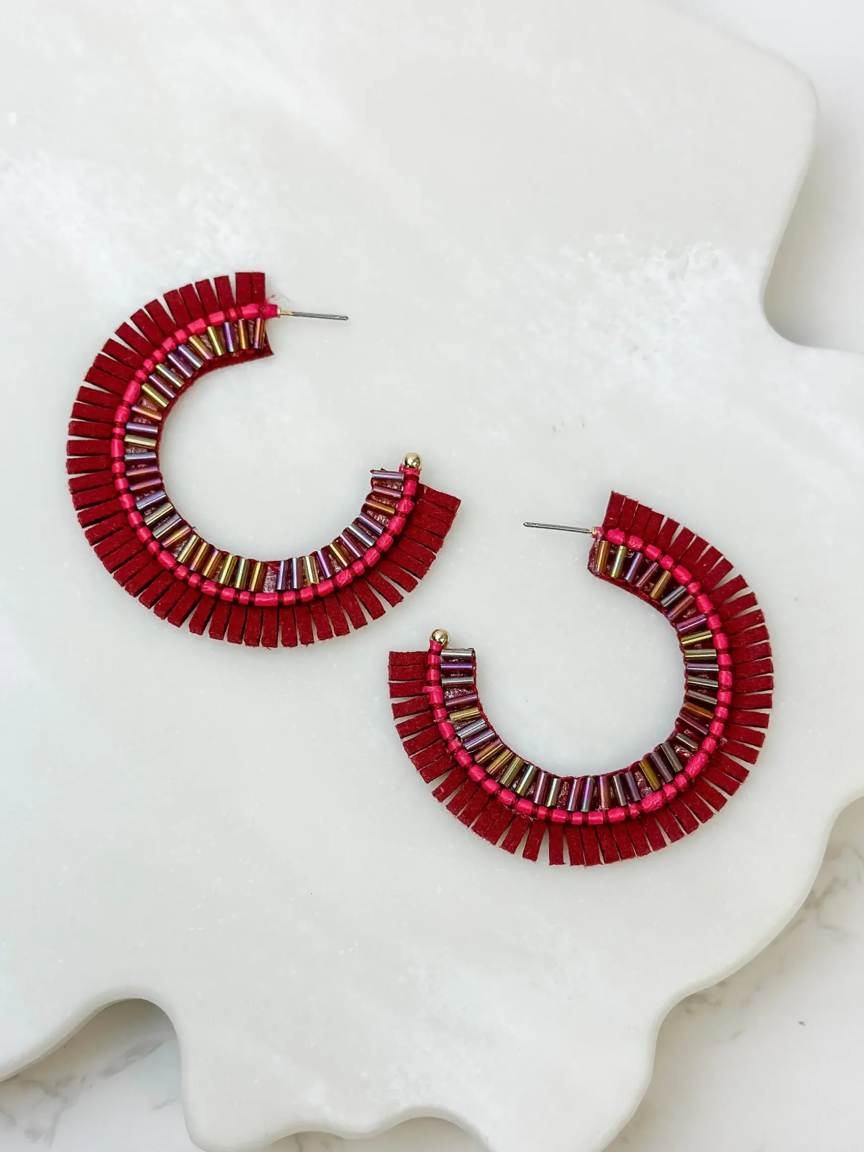 Stay on trend this season with these fashionable Suede Fringe Beaded Hoop Earrings!