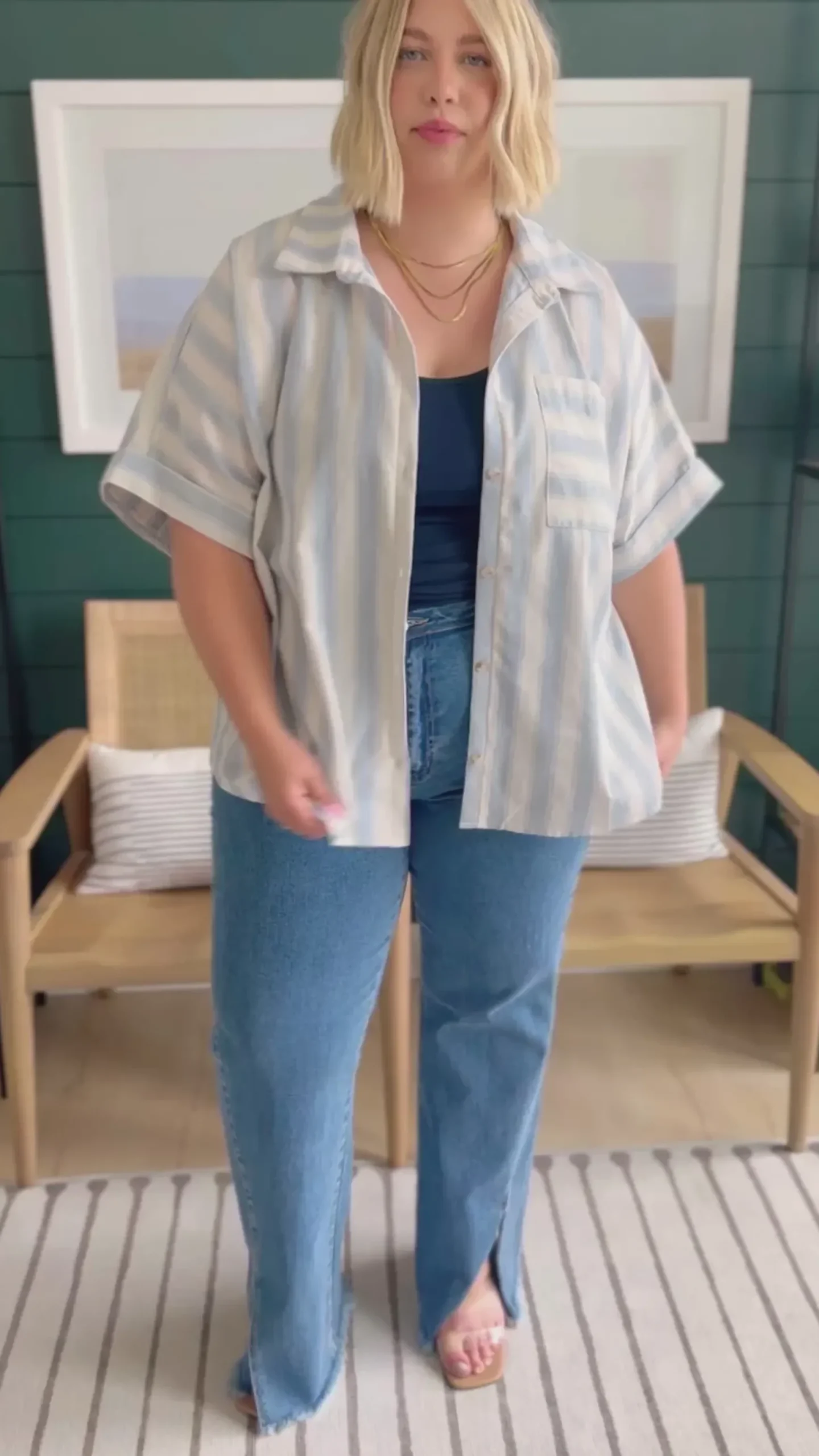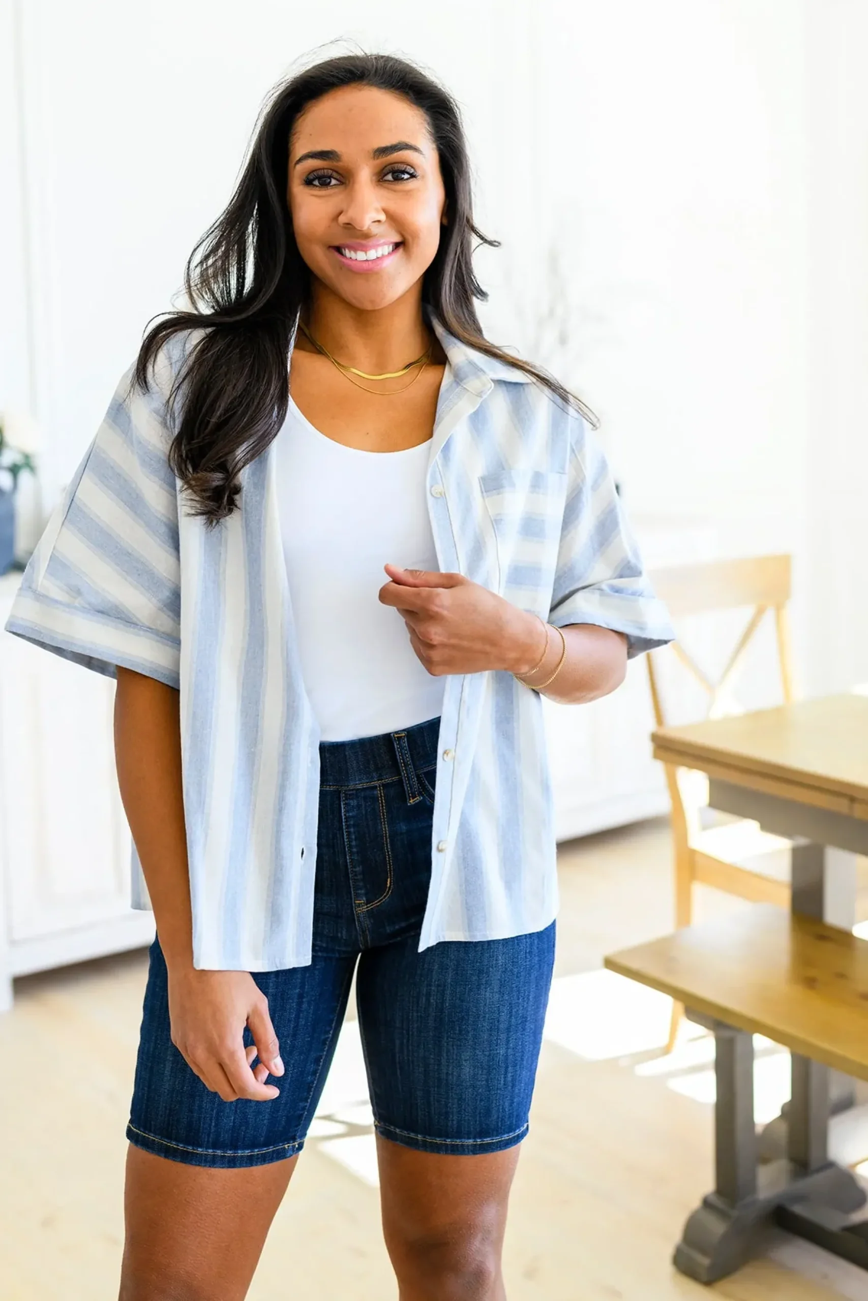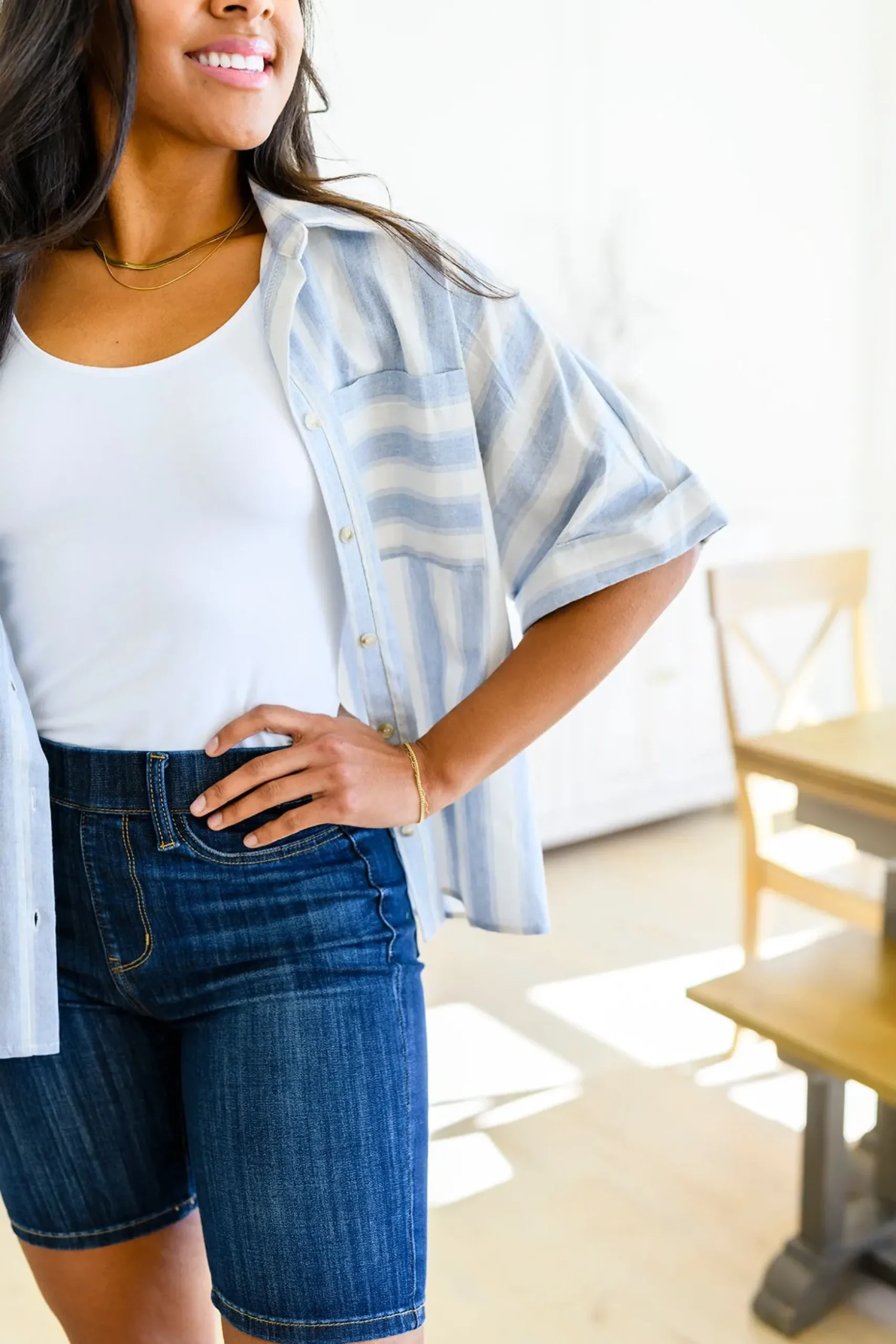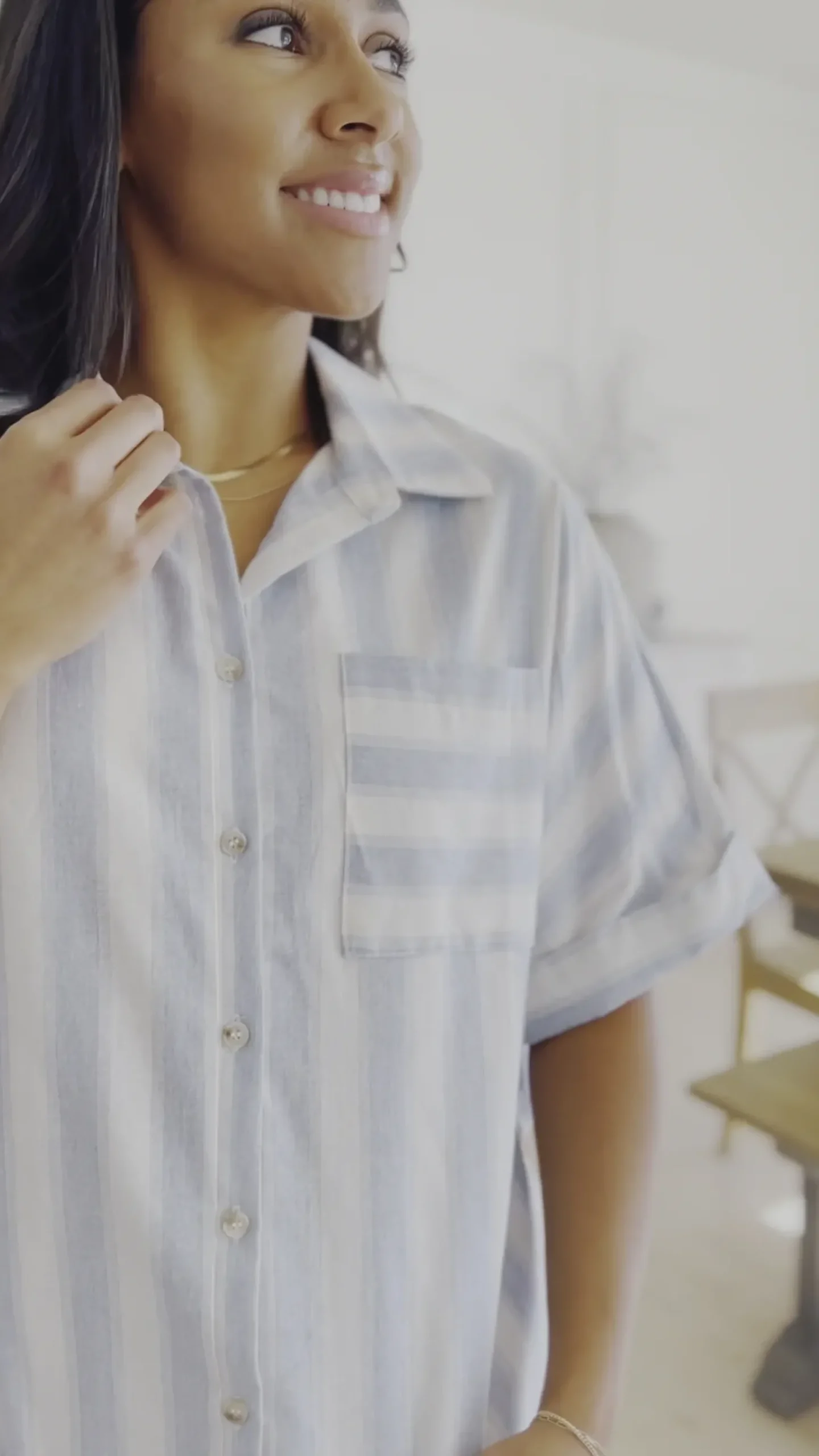 Uniquely tailored and designed to inspire relaxation, the Tailored to Relax Striped Button down has an oversized silhouette. Featuring dolman sleeves, perpendicular striped details, and a gathered back panel, making it an ideal choice for your next staycation. Dare to look fashionably comfortable and relax in style.