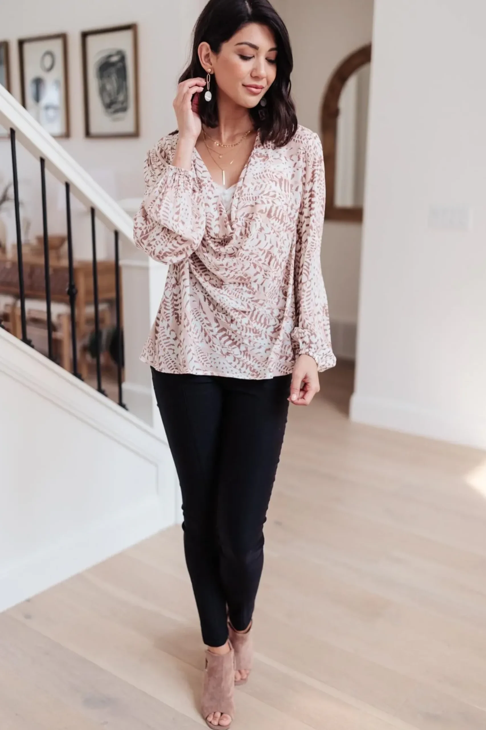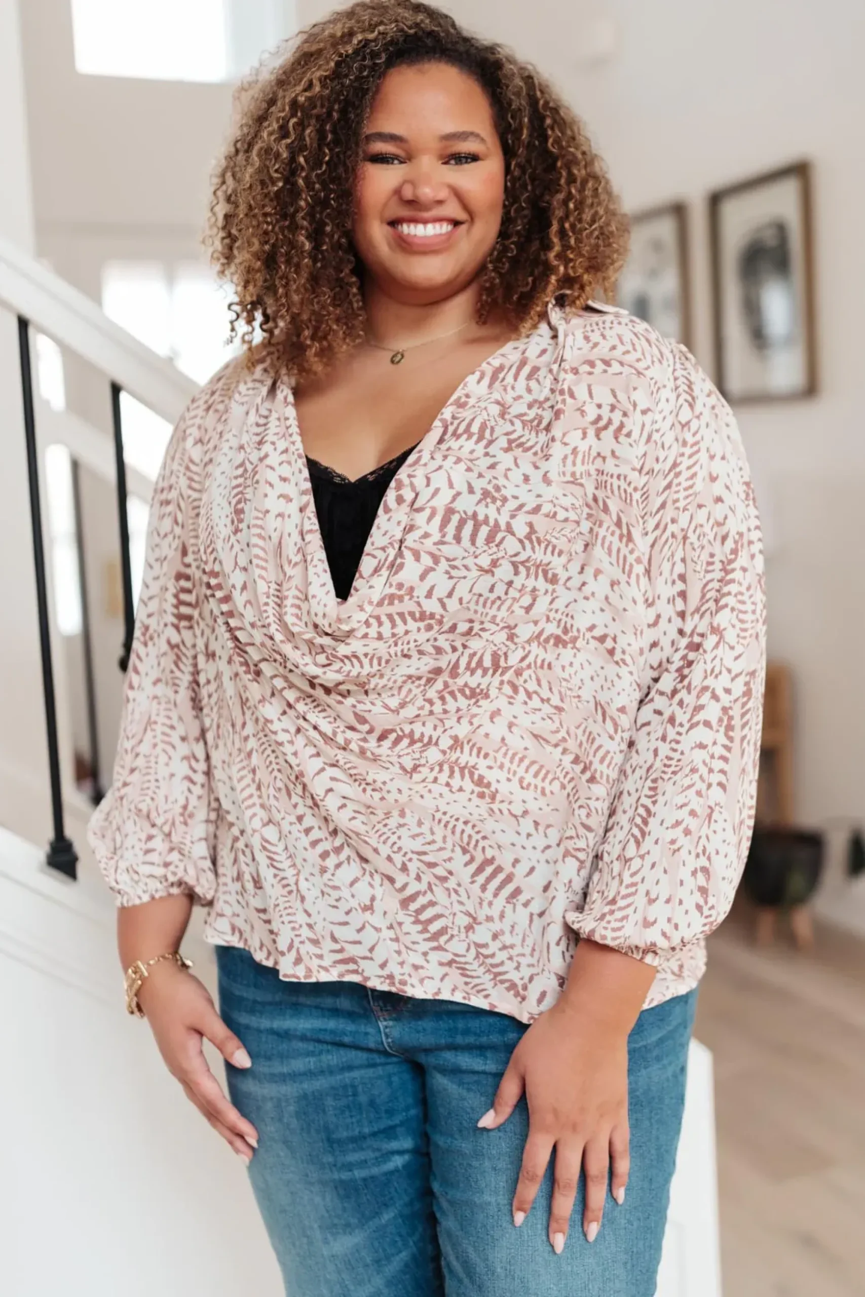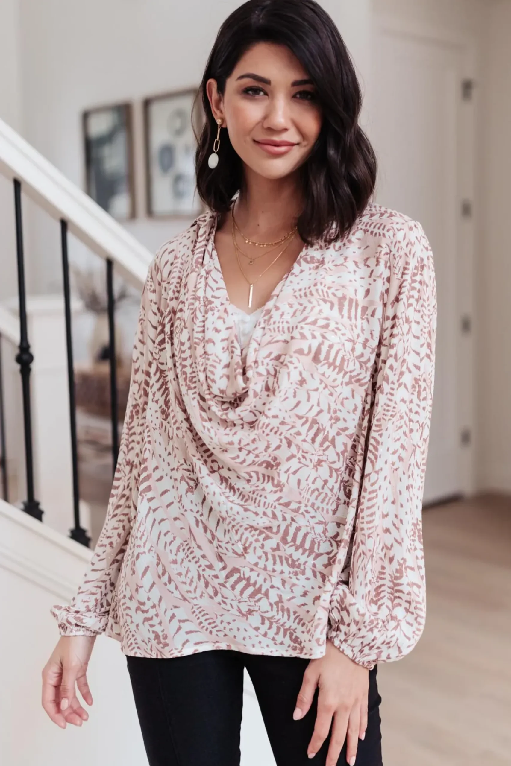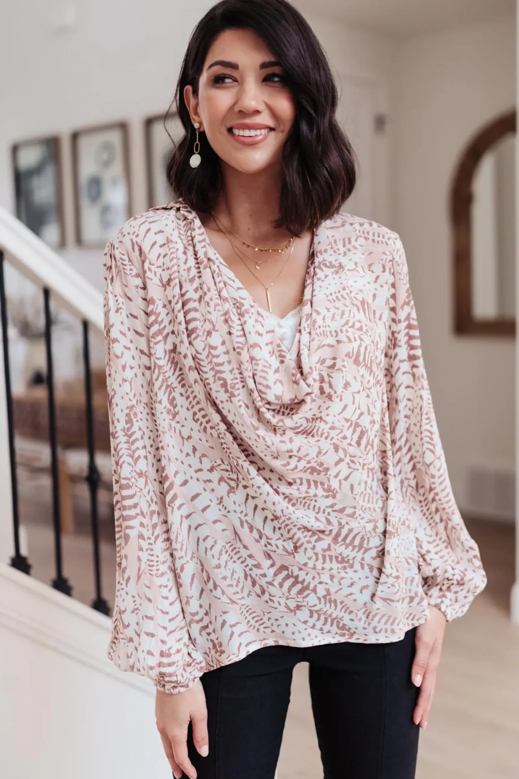 The Take Flight Cowl Neck Top is a stunning statement piece! The deep cowl neckline and soft bishop sleeve give this top such a fun shape. The abstract print has a gold sparkle detail throughout that we LOVE! Pair this top with dark skinny jeans or work trousers.