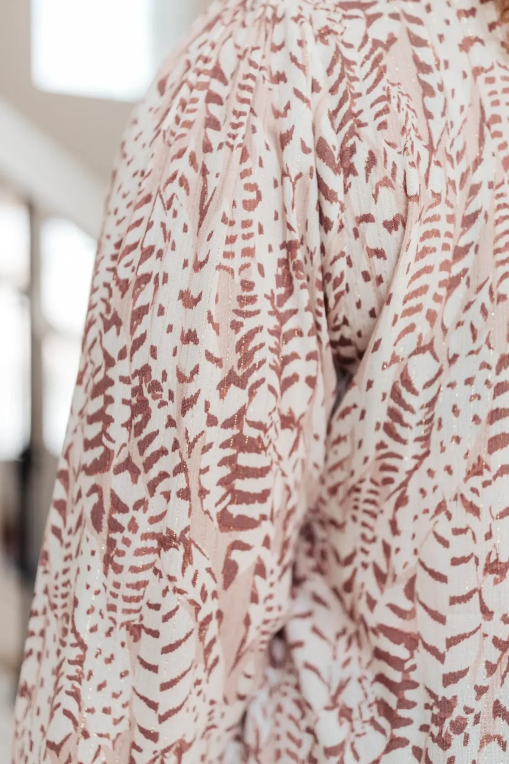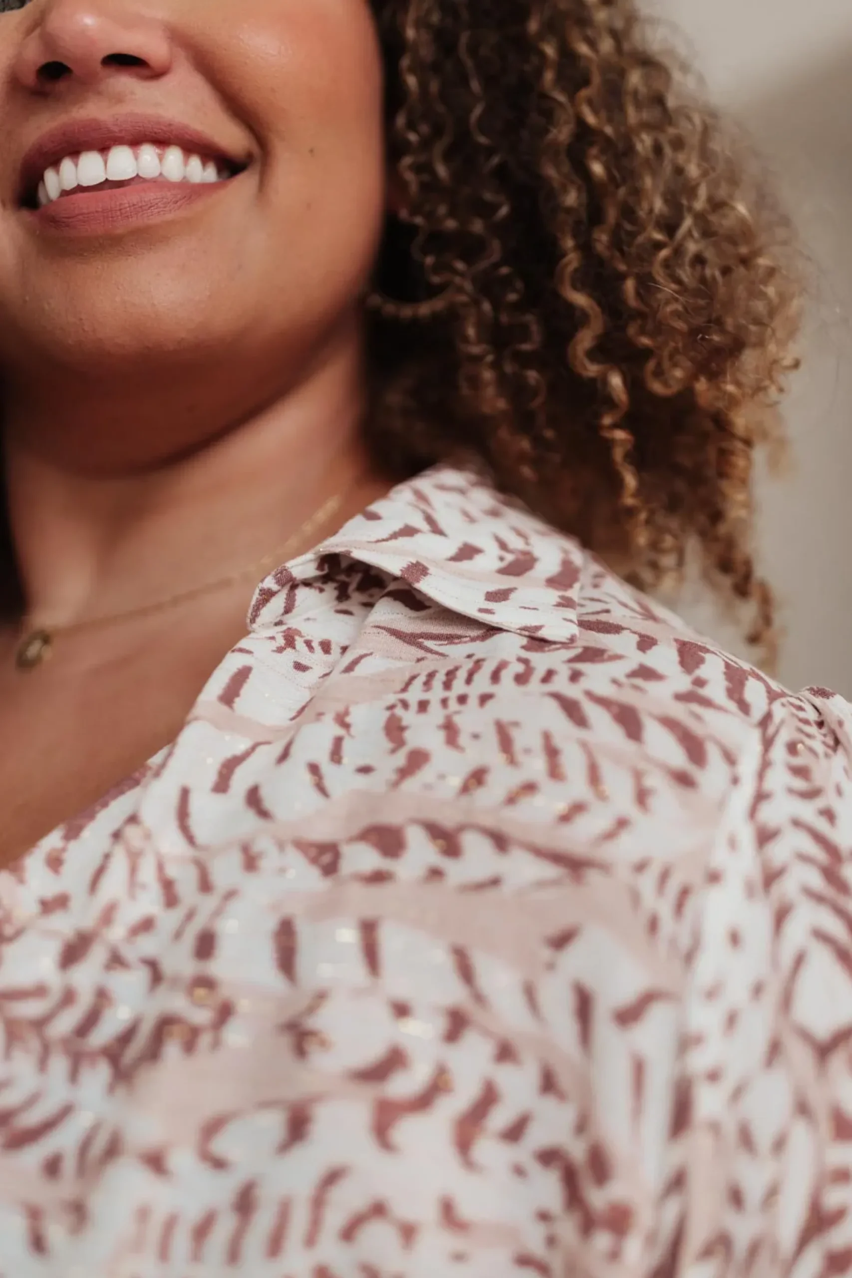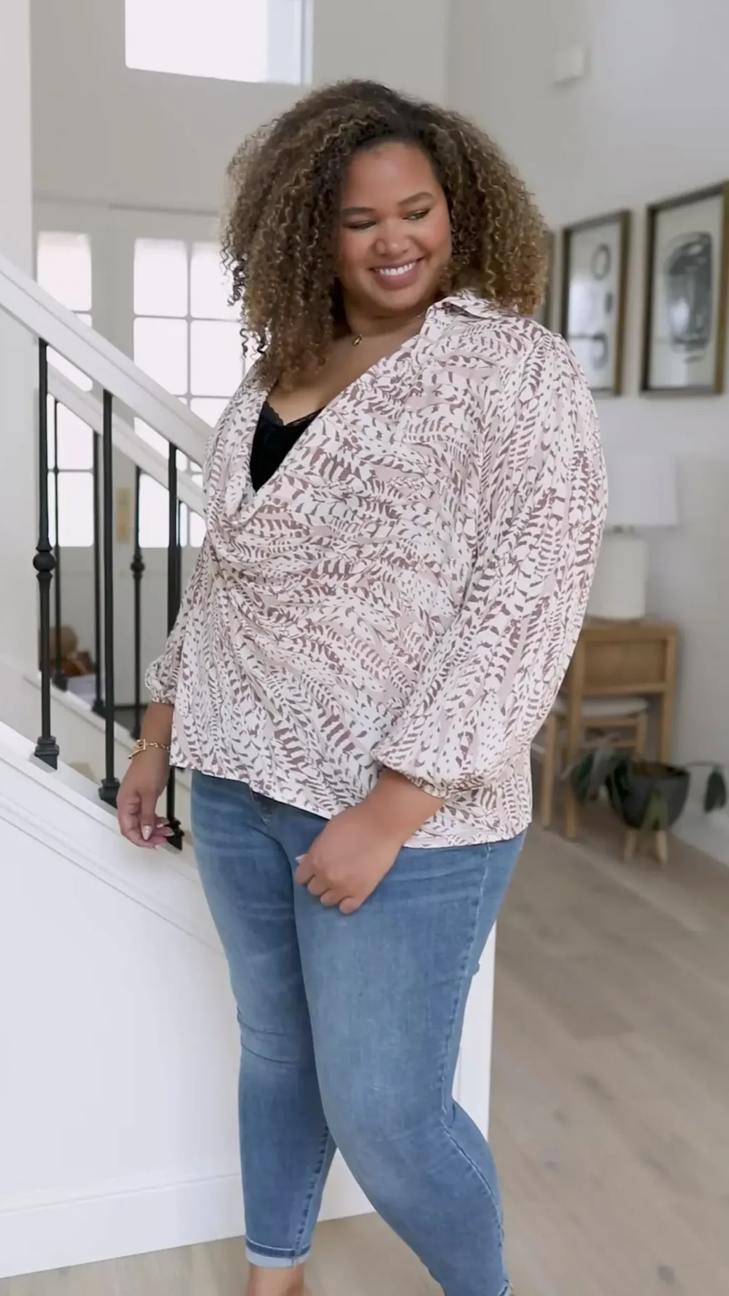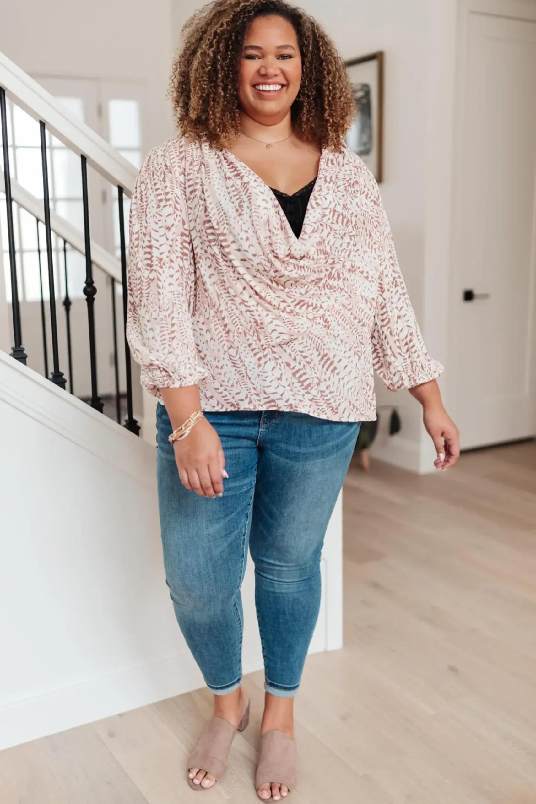 The Take Flight Cowl Neck Top is a stunning statement piece! The deep cowl neckline and soft bishop sleeve give this top such a fun shape. The abstract print has a gold sparkle detail throughout that we LOVE! Pair this top with dark skinny jeans or work trousers.