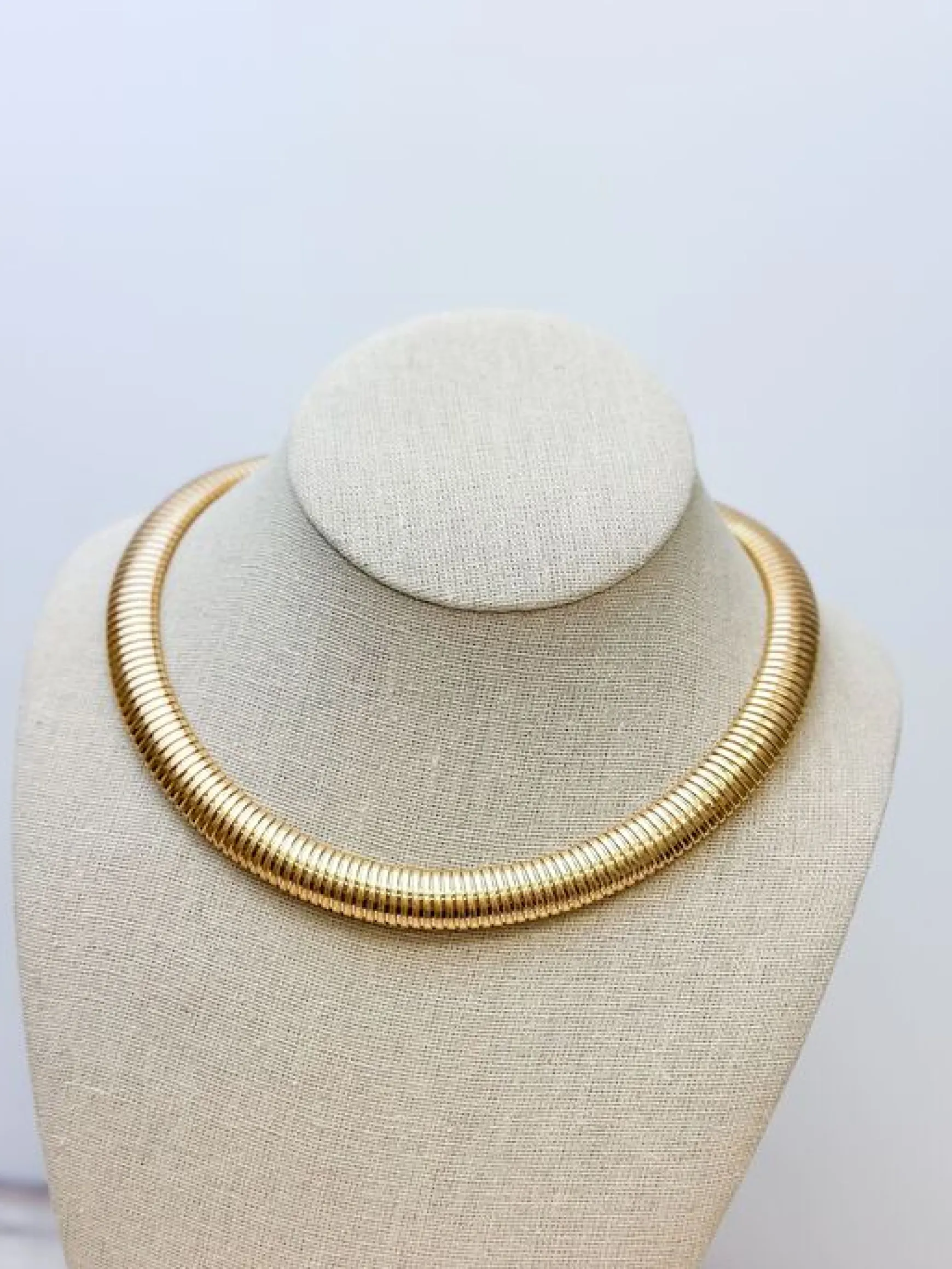 Elevate your look with our Textured Collar Necklace in vintage gold. This statement piece adds a touch of sophistication to any outfit, making it perfect for both casual and formal occasions.