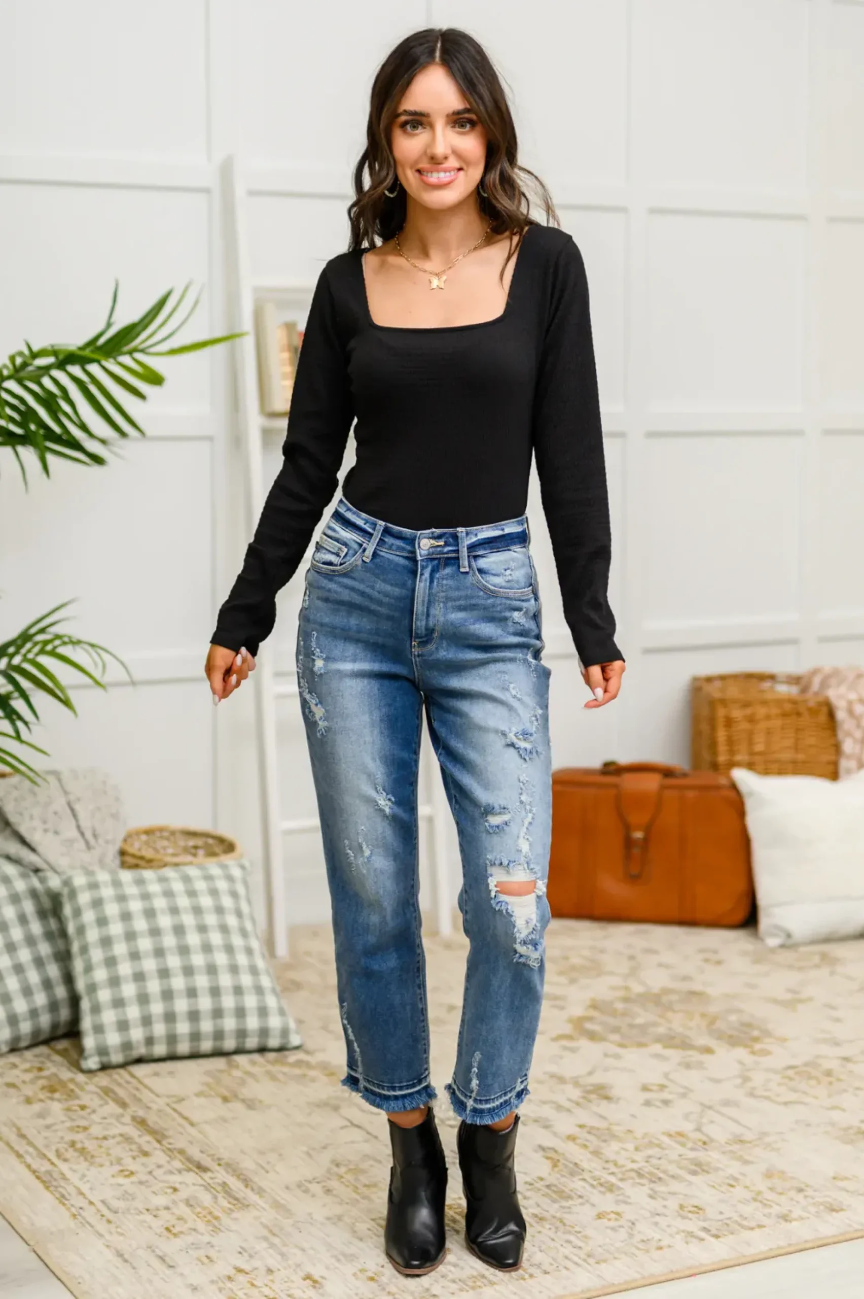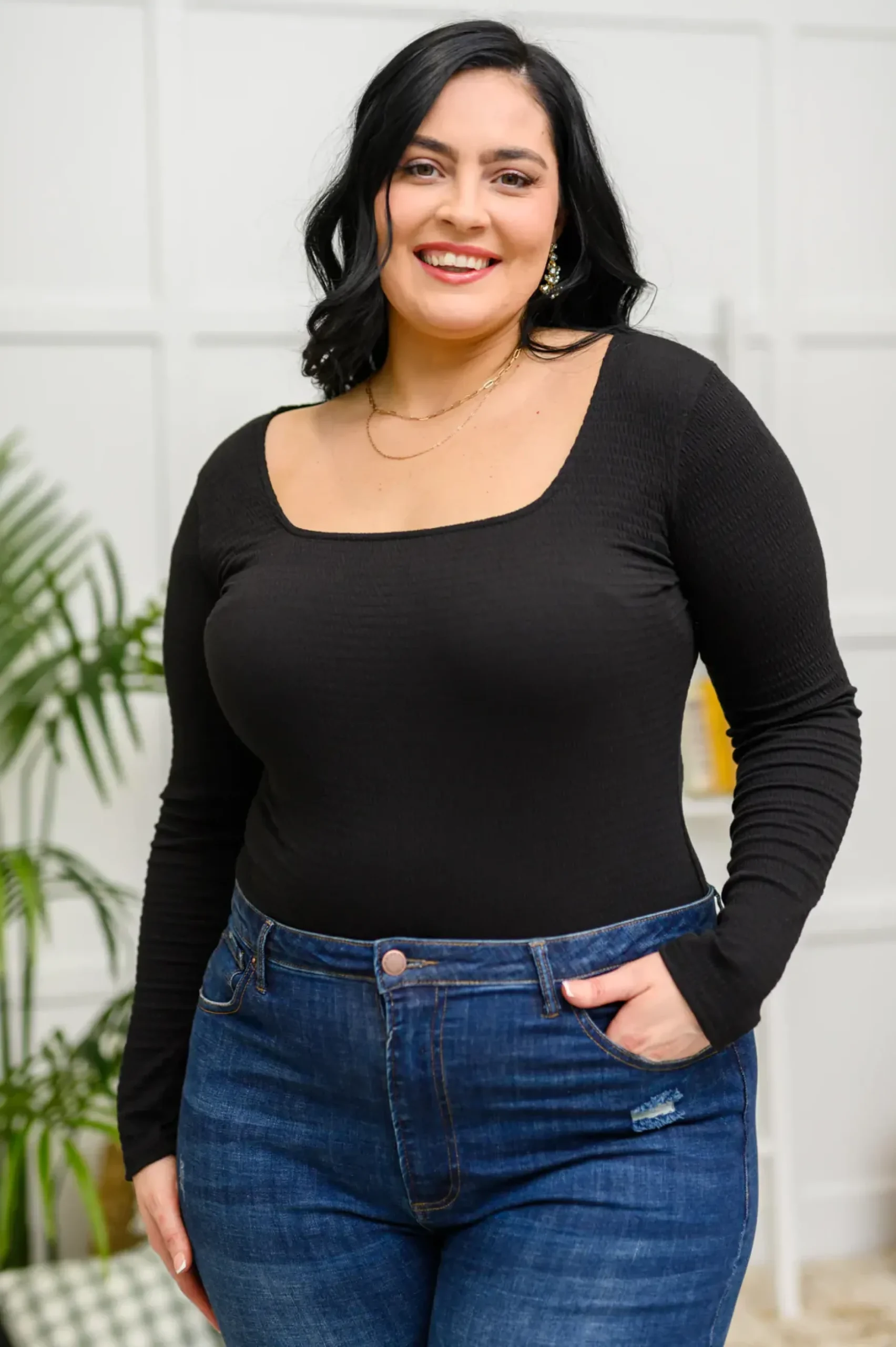 The Trisha Textured Square Neck Bodysuit in Black will look good on anyone! Featuring a lightweight textured knit that shapes a flattering square neckline with long sleeves, slim fit bodice and snap button closure. The perfect staple piece to keep in your closet for years to come!