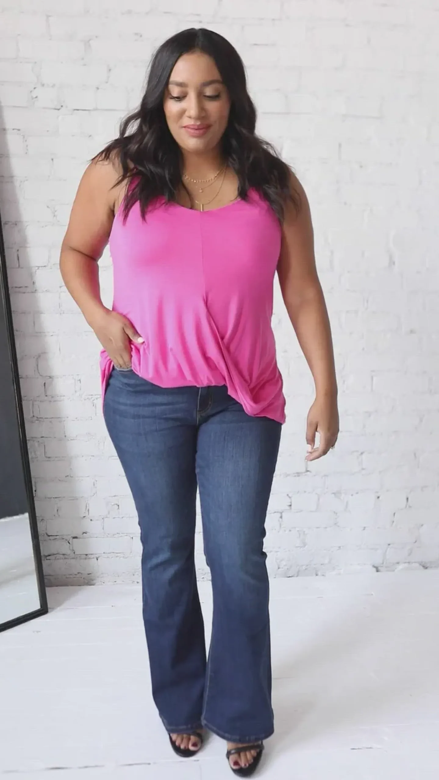 The Think Pink Tank is a bright pop of color for those late summer days! This spaghetti strap tank has a v neckline and twisted high low hem. We love this tank on its own, or layered under a neutral cardigan or jacket!