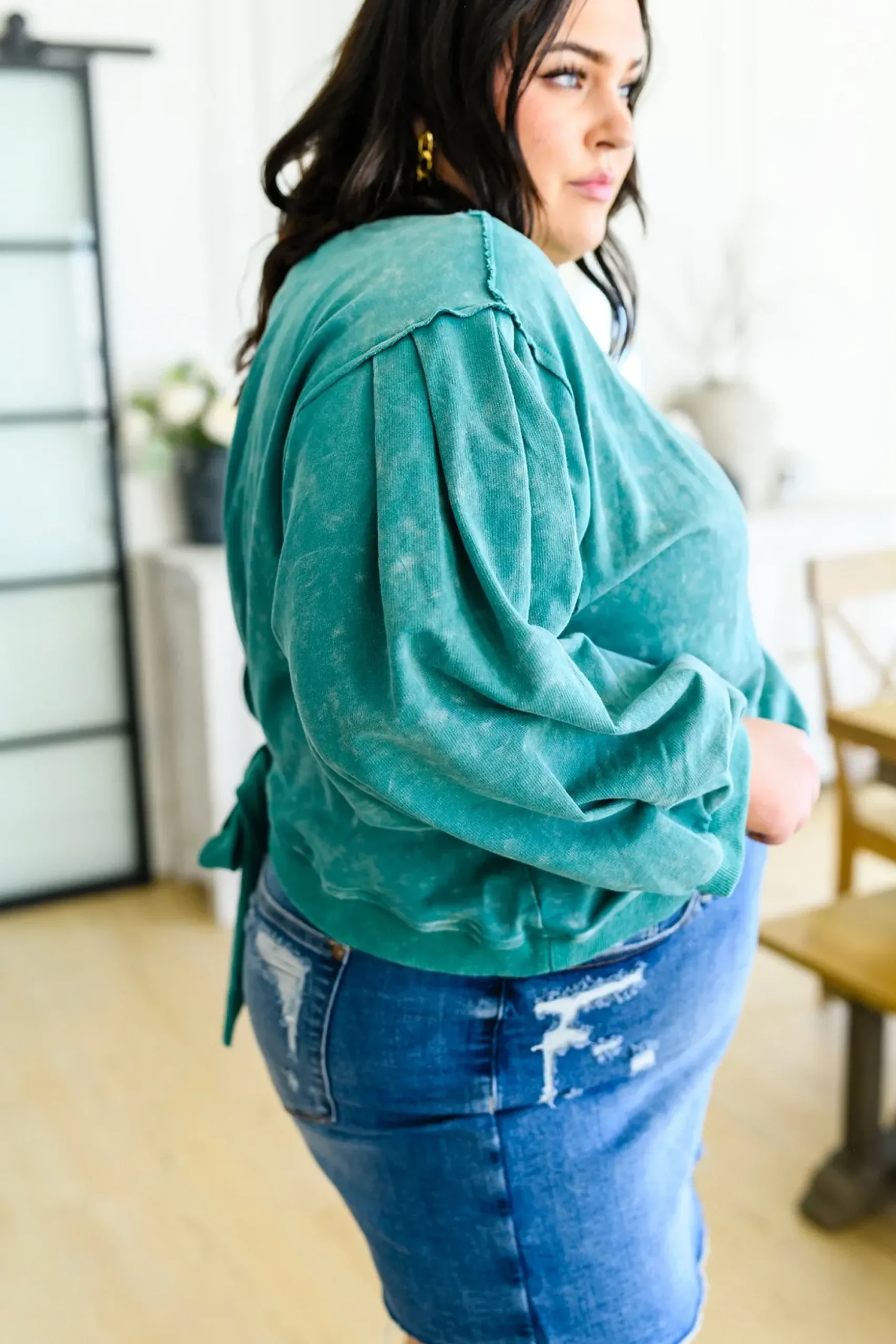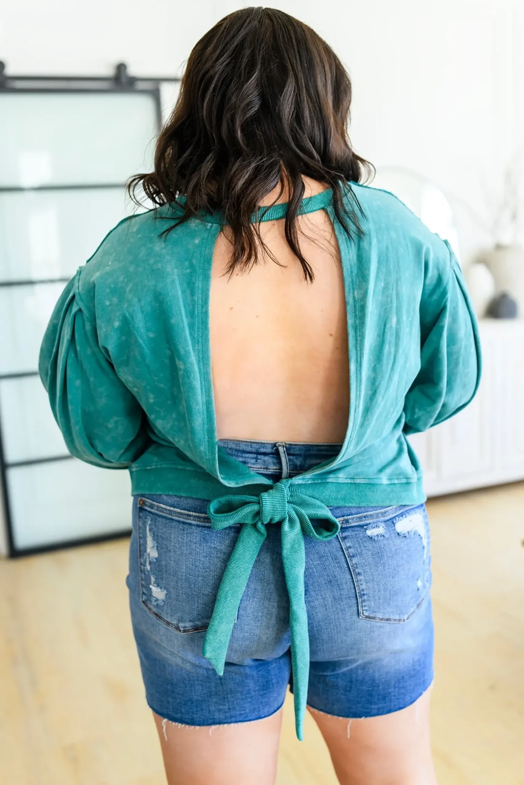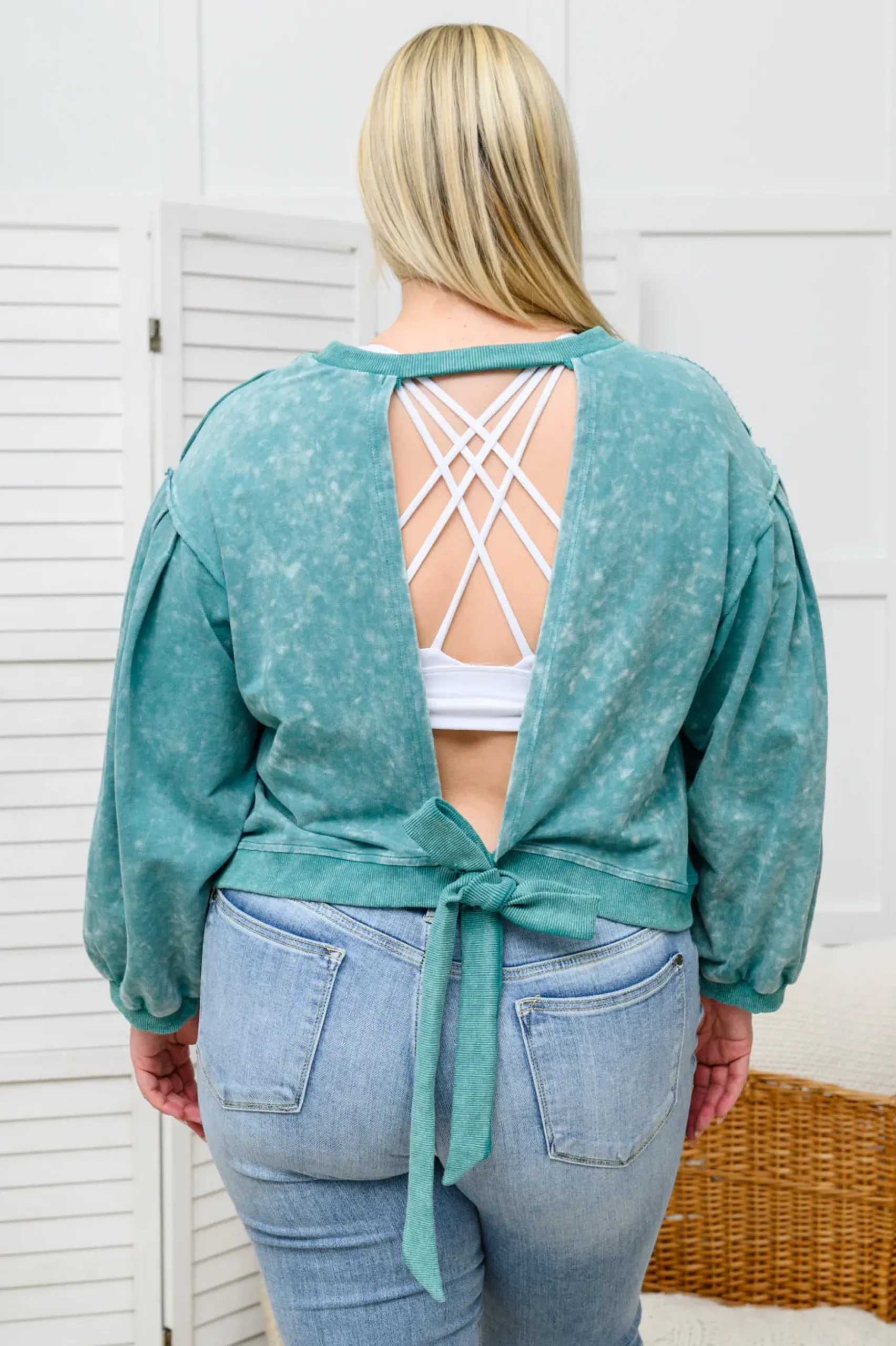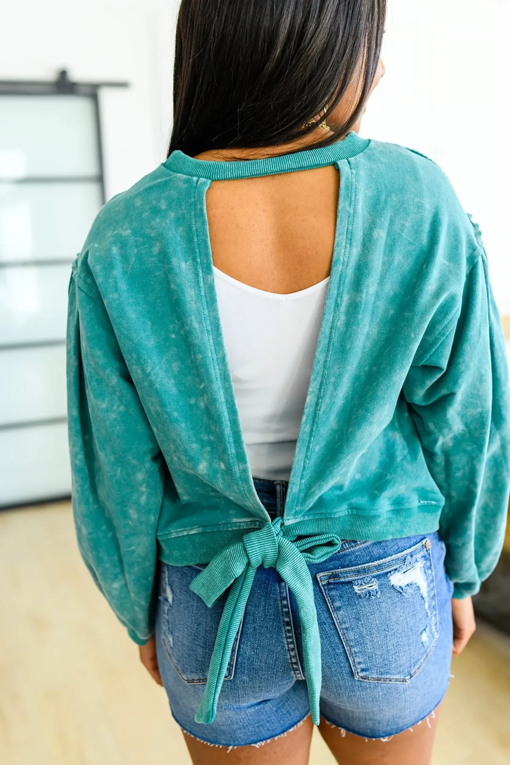 Business in the front, party in the back! The Tied Up In Cuteness Mineral Wash Sweater In Teal features a mineral wash French terry fabric that shapes a crew neckline with pleated balloon sleeves and slightly cropped fit. A cutout design at the back ends at a functional tie detail, with ribbed detail lining the hem, cuffs and neckline.