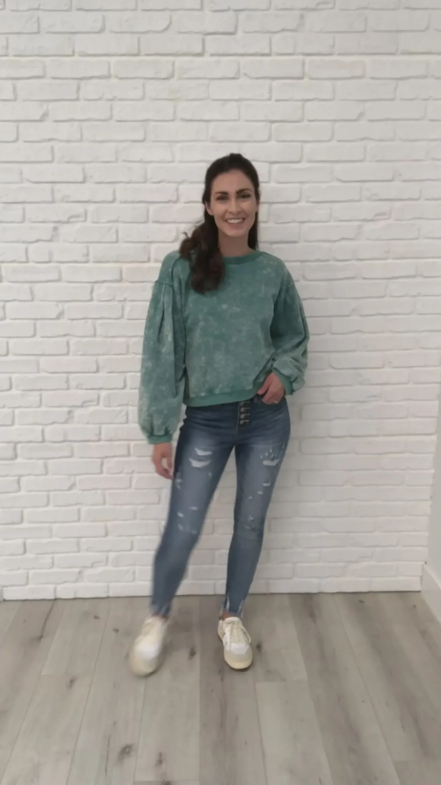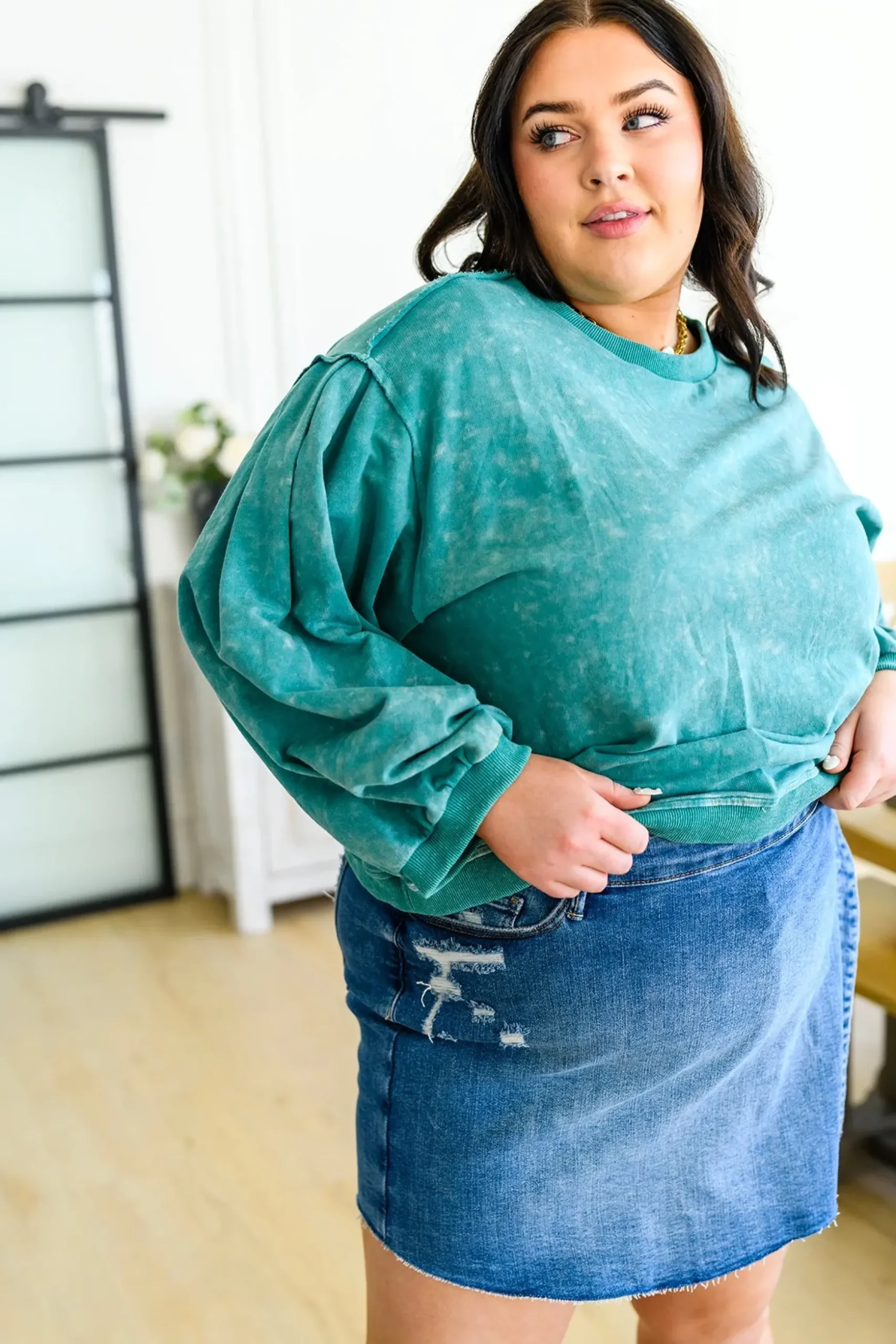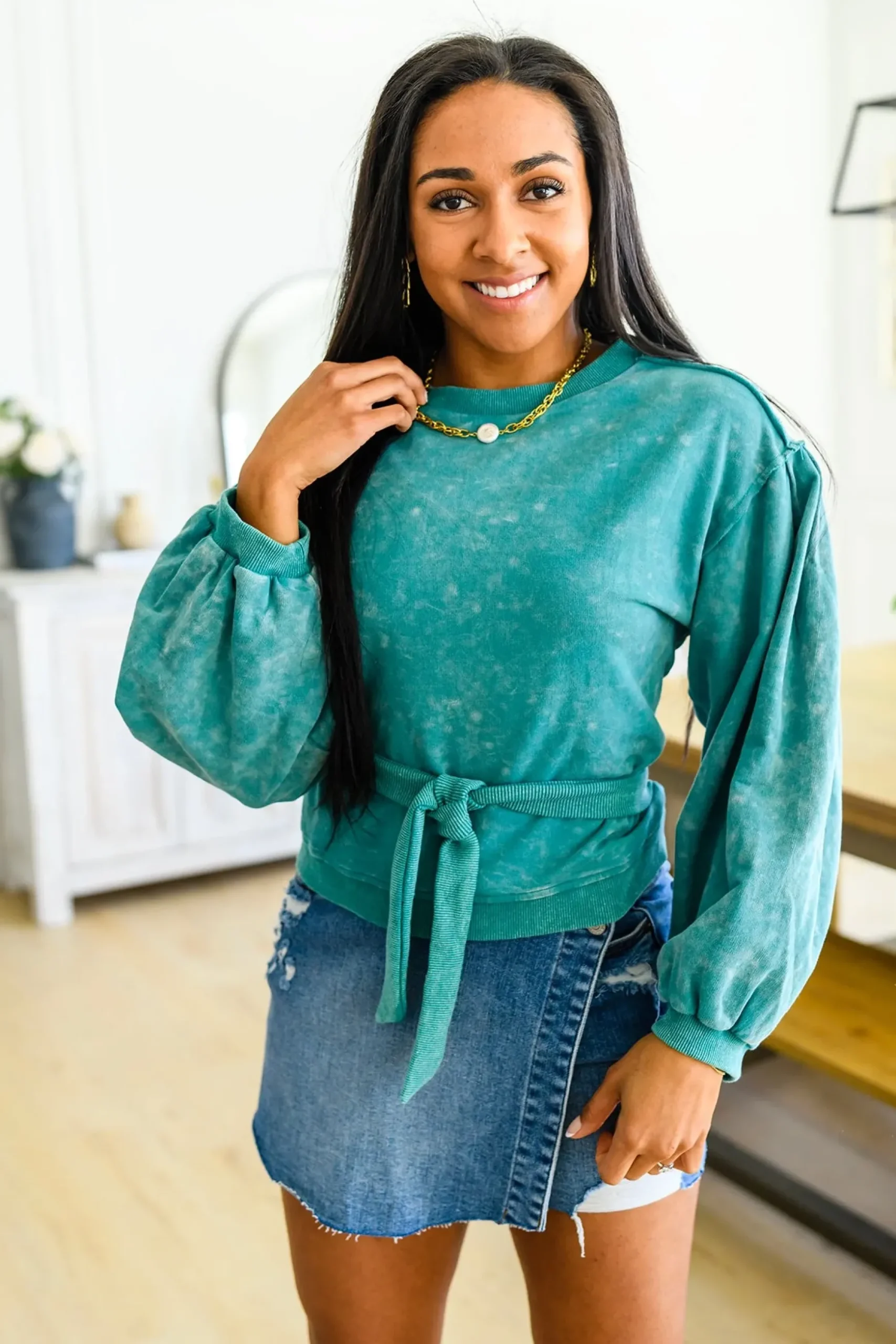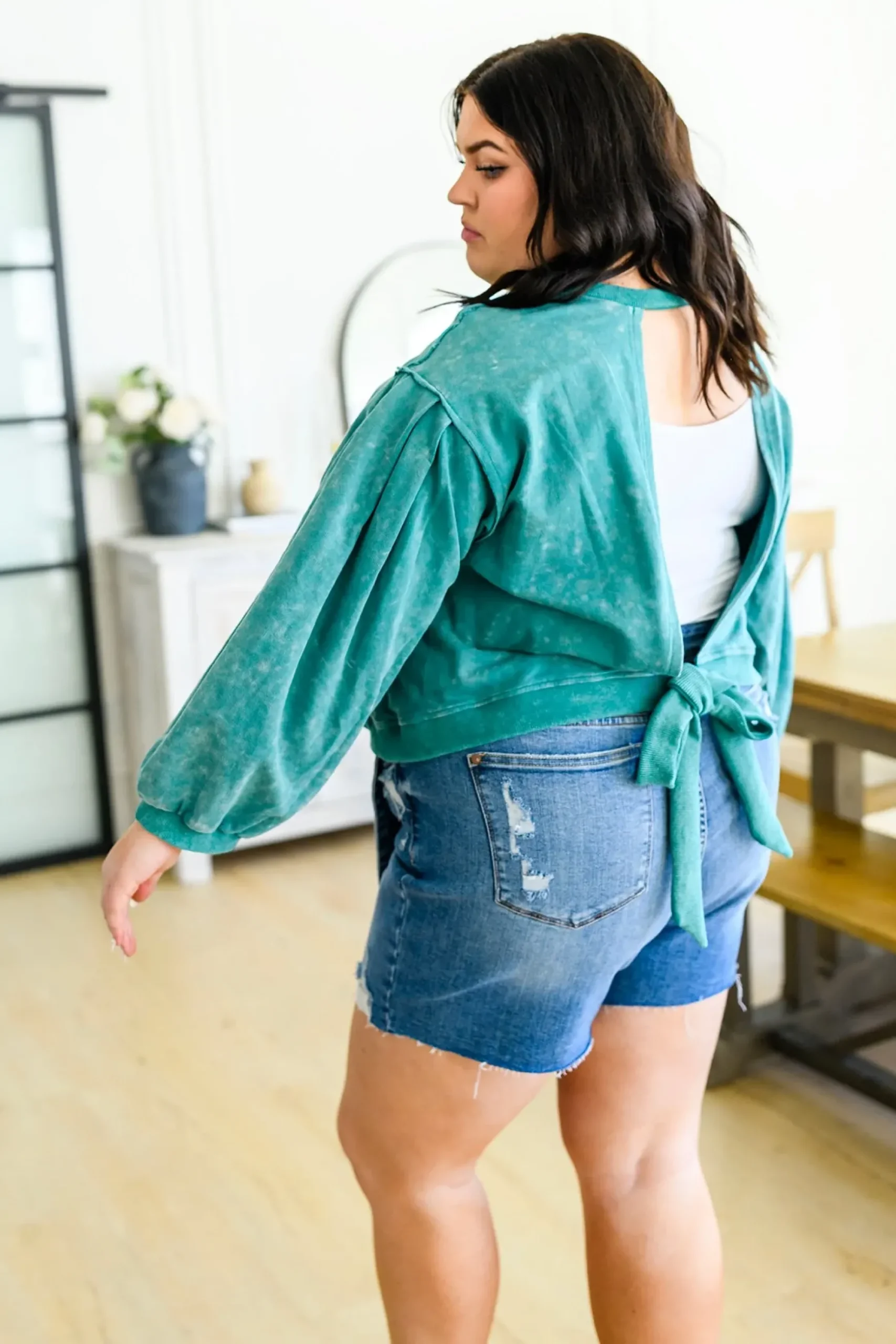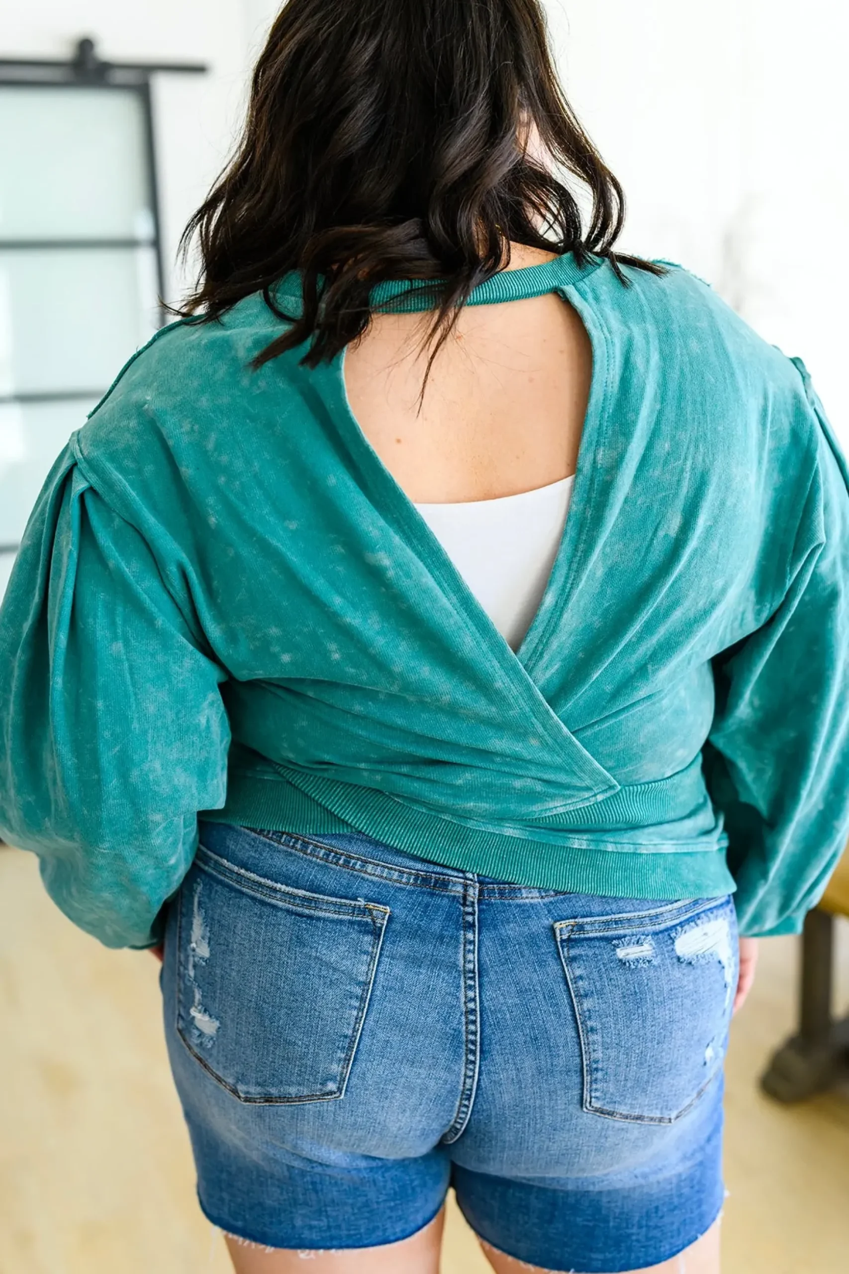 Business in the front, party in the back! The Tied Up In Cuteness Mineral Wash Sweater In Teal features a mineral wash French terry fabric that shapes a crew neckline with pleated balloon sleeves and slightly cropped fit. A cutout design at the back ends at a functional tie detail, with ribbed detail lining the hem, cuffs and neckline.