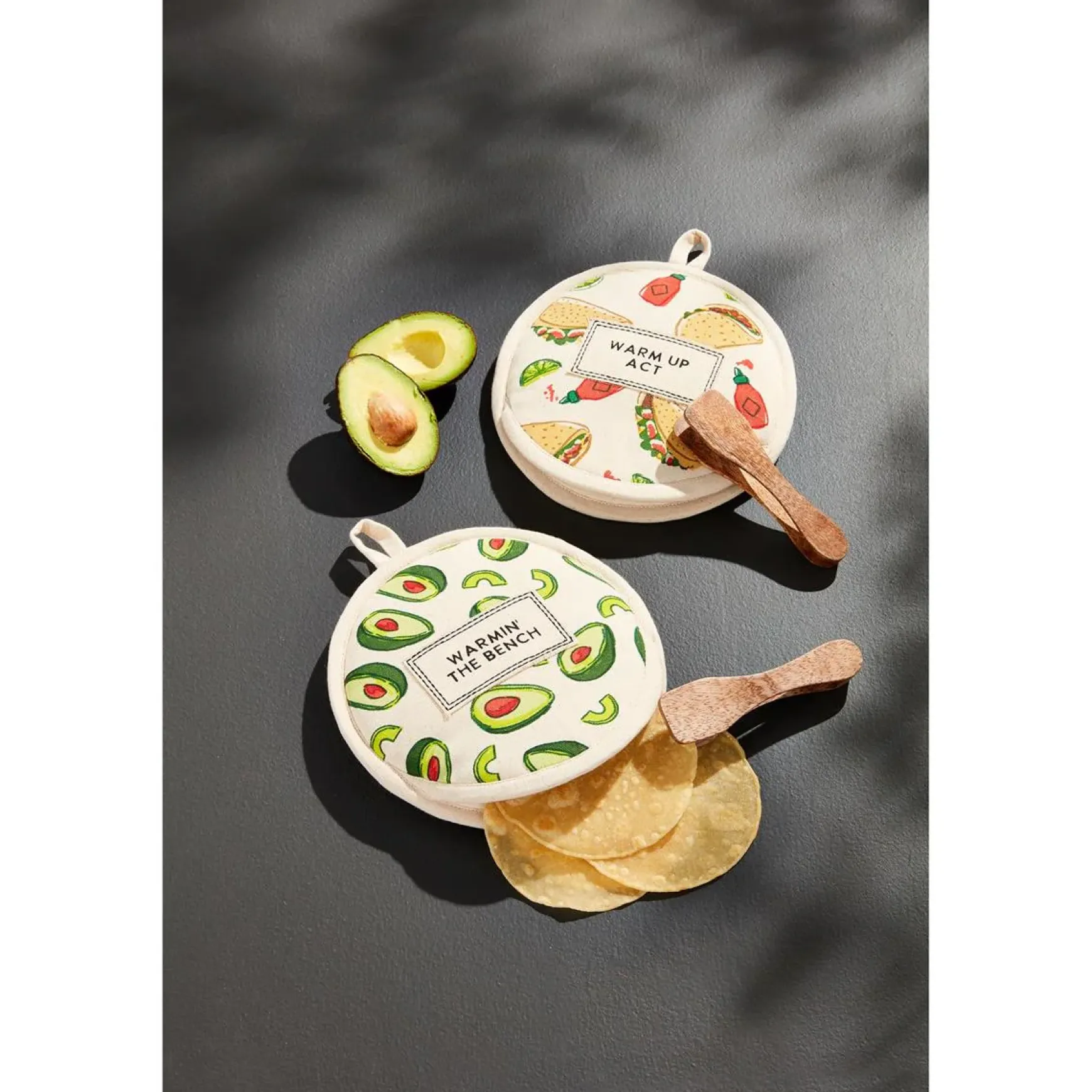2-piece set. Thermal insulated cotton tortilla warmer with canvas accent patch. Comes with wooden tongs. Use to keep pre-heated tortillas warm until serving.