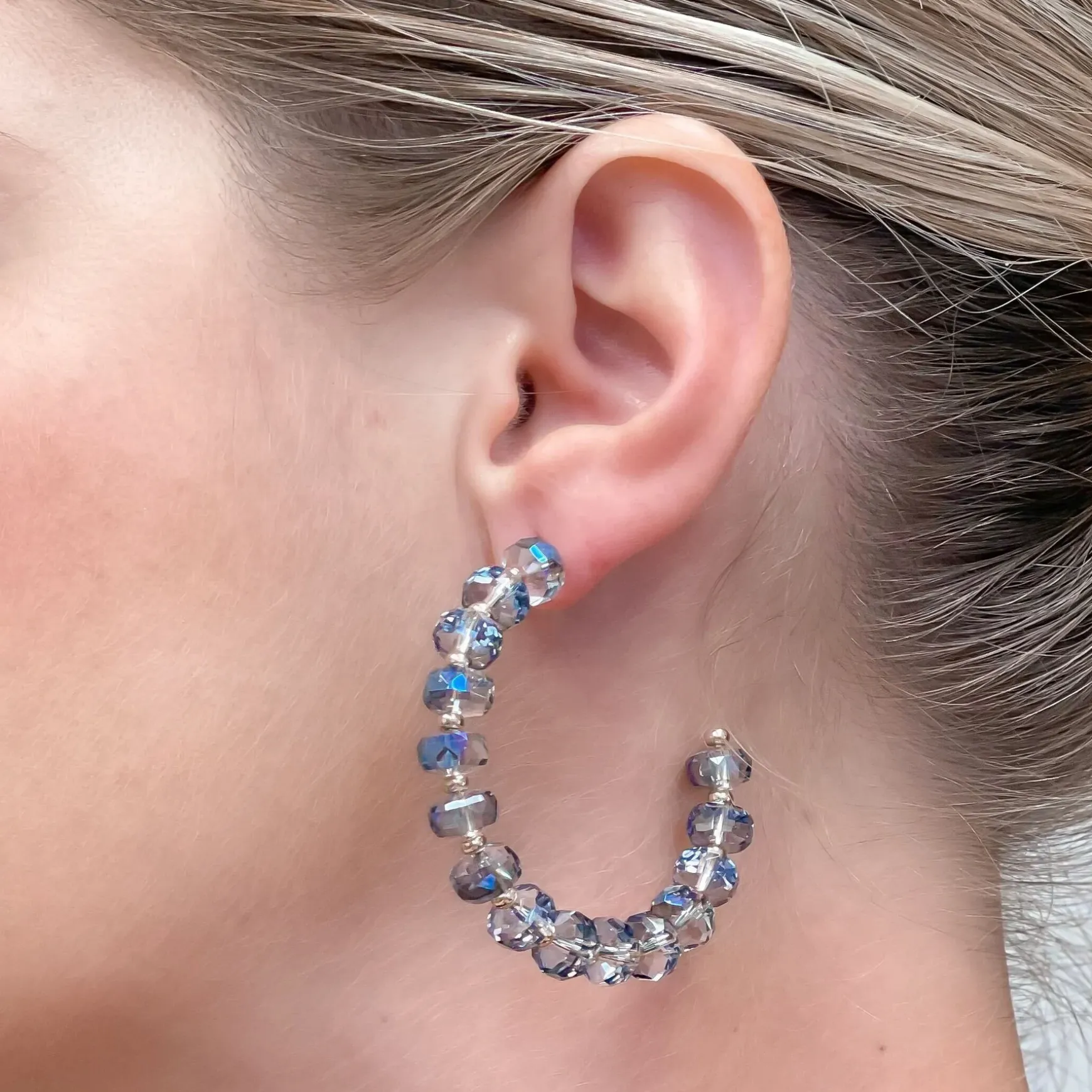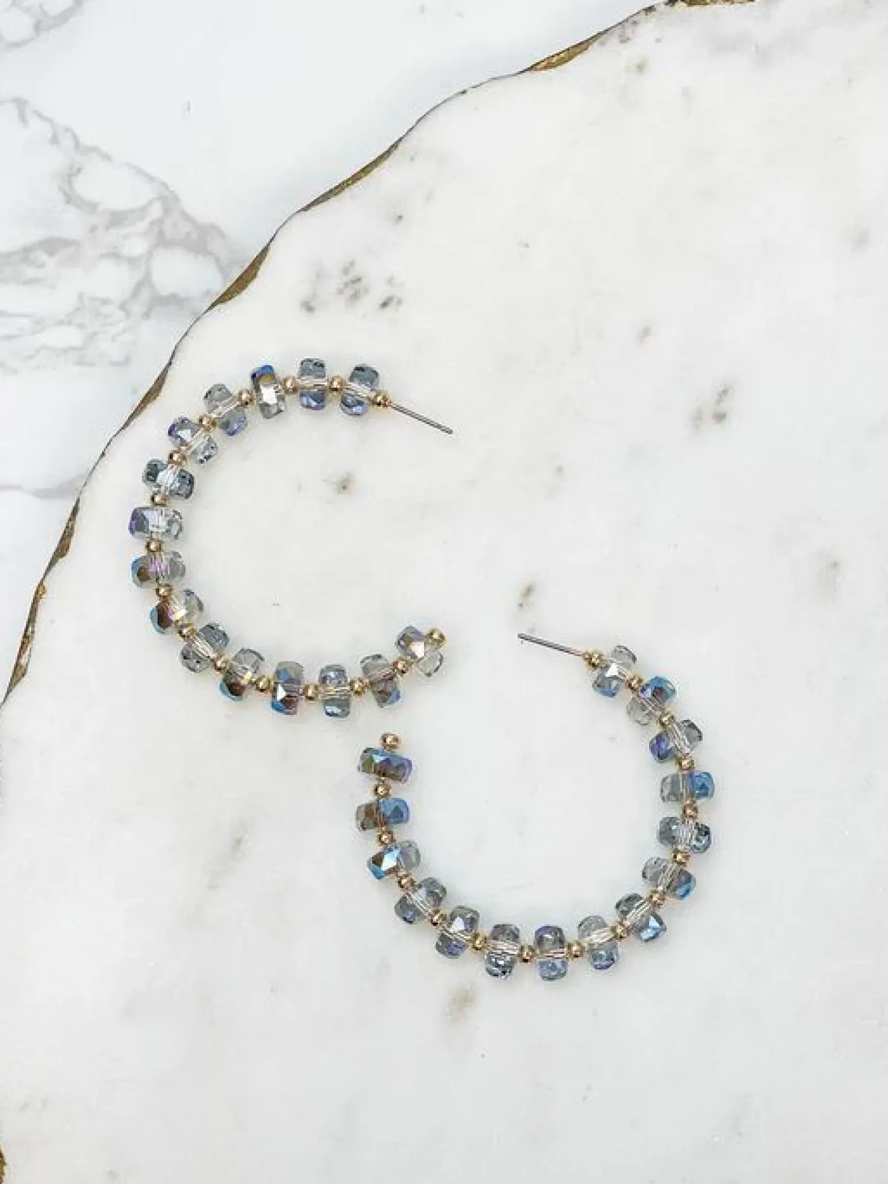These delicate and eye-catching translucent blue and gold hoop earrings are sure to be a talking point.