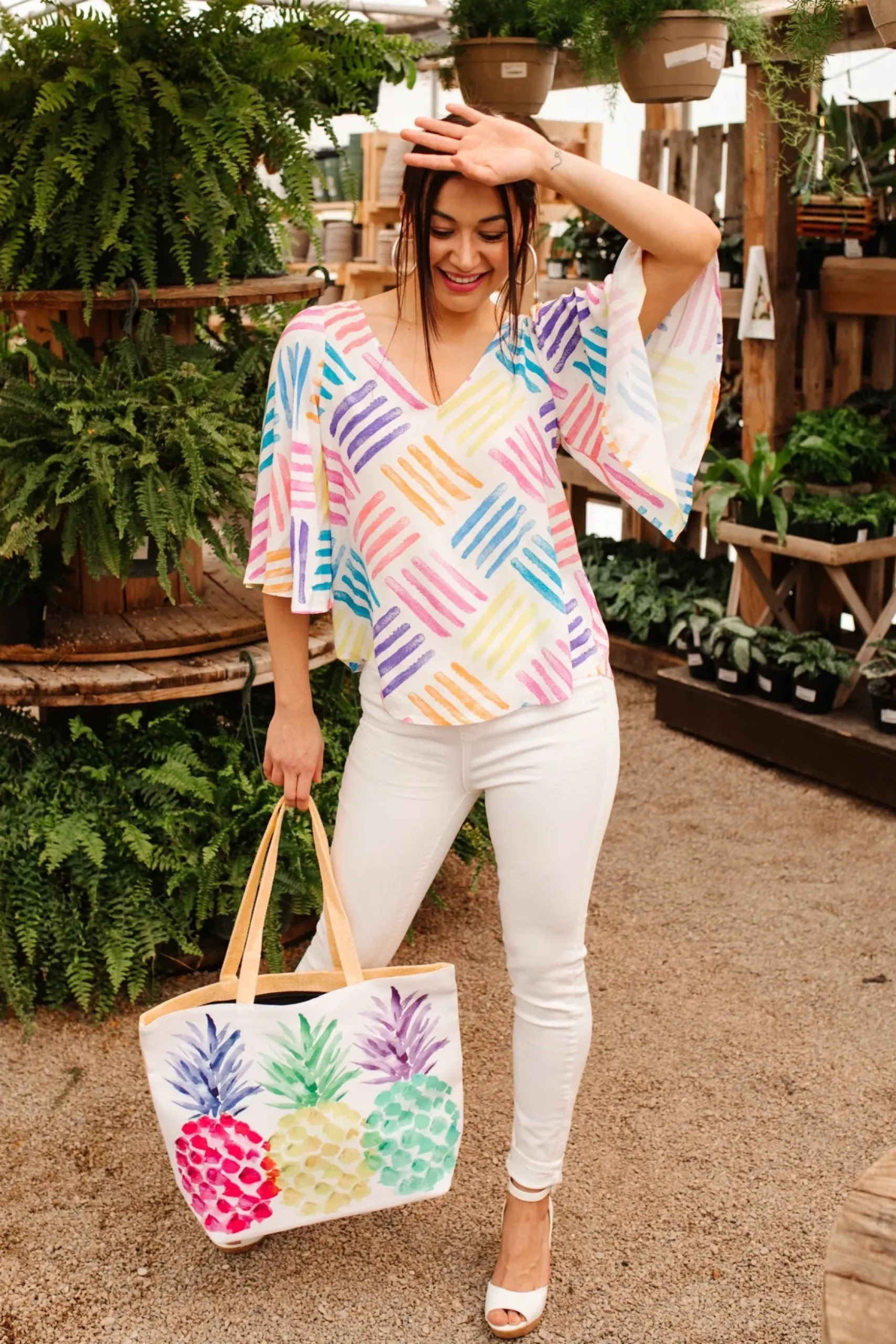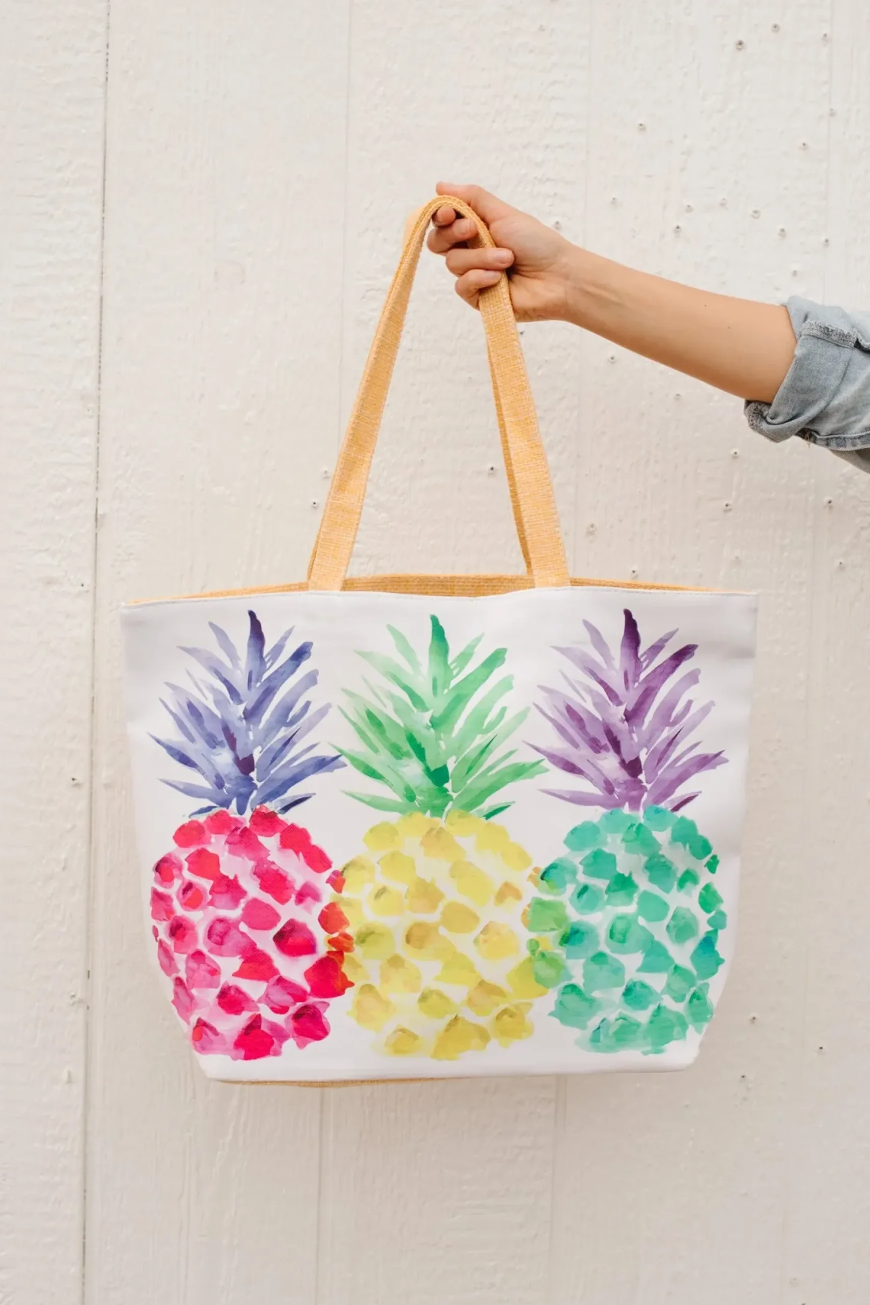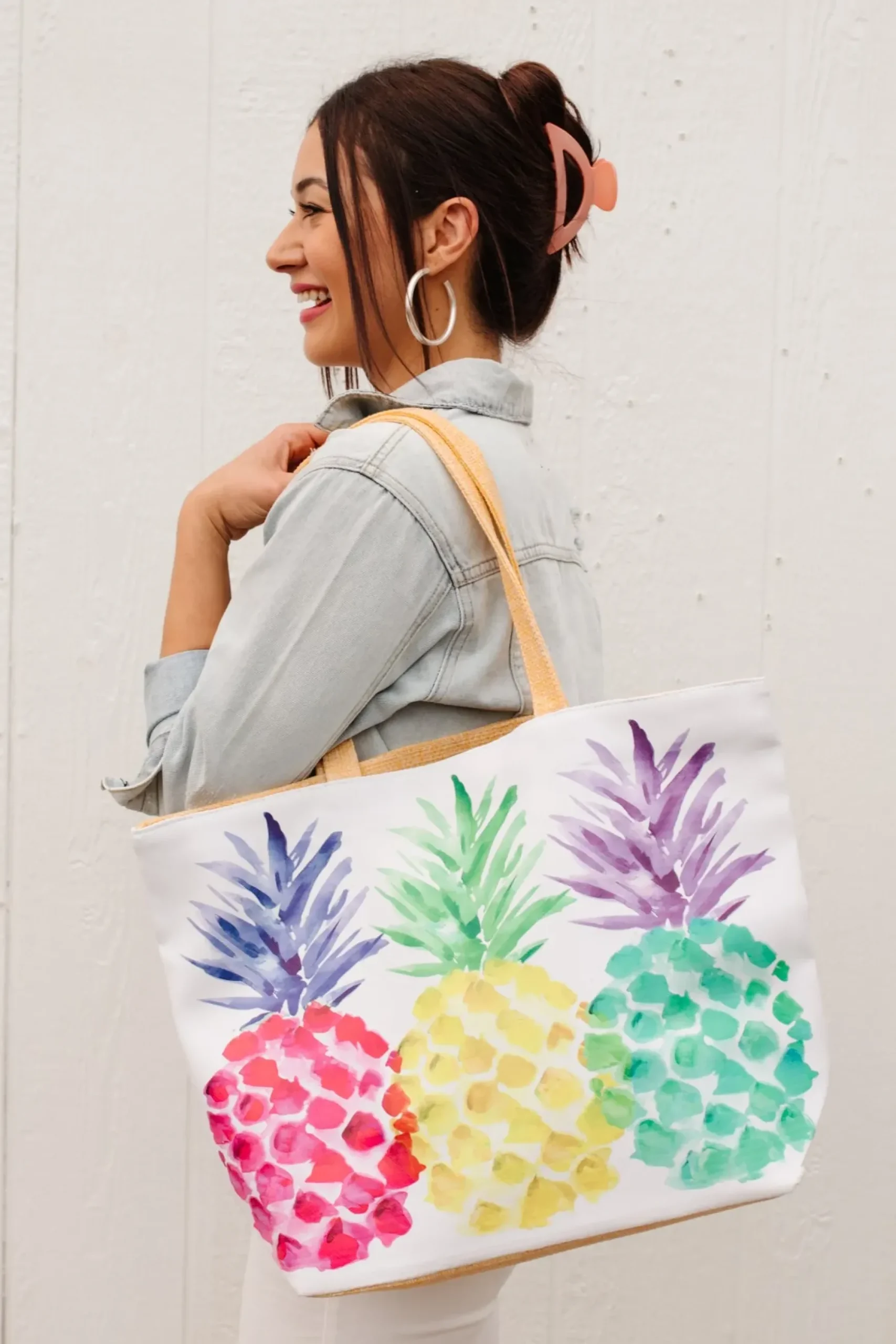 We are color-obsessed for spring and this bag fulfills all of our needs! Three multicolor pineapples make up this bag with a white faux leather front, and linen back and straps. This bag will hold all your essentials and then some!