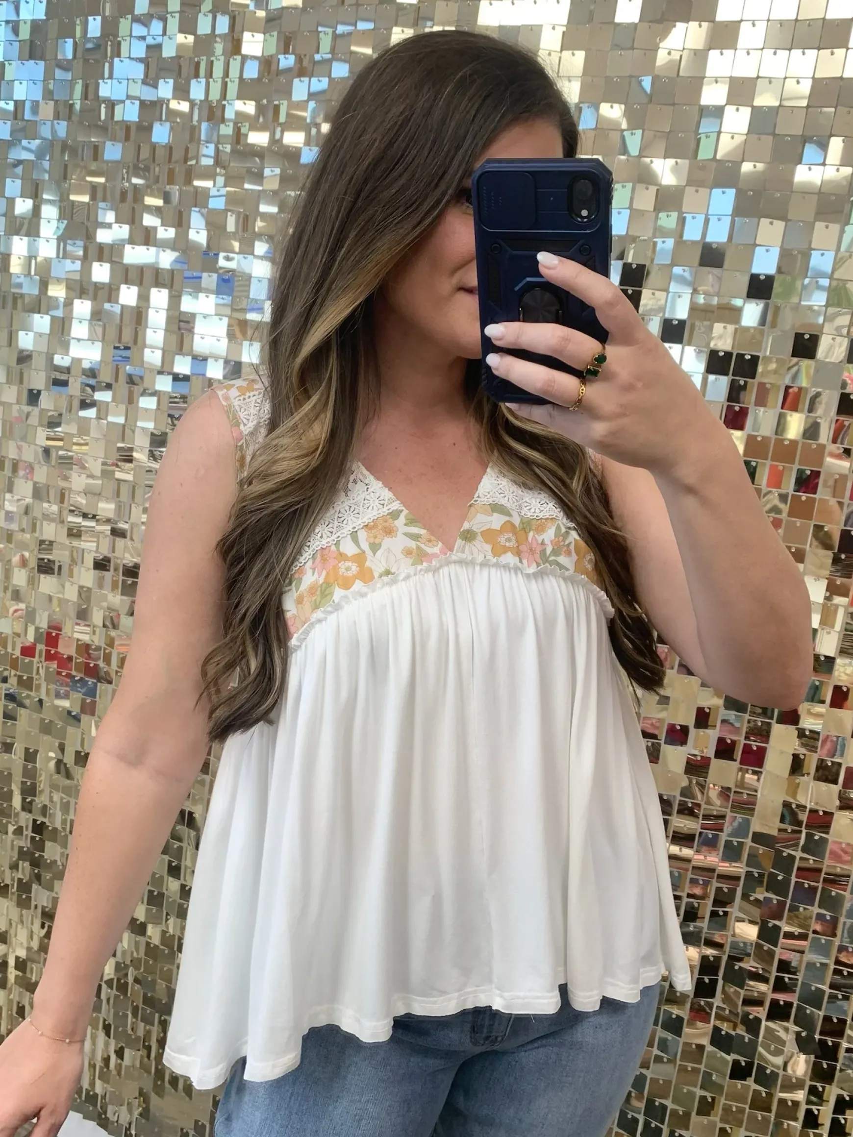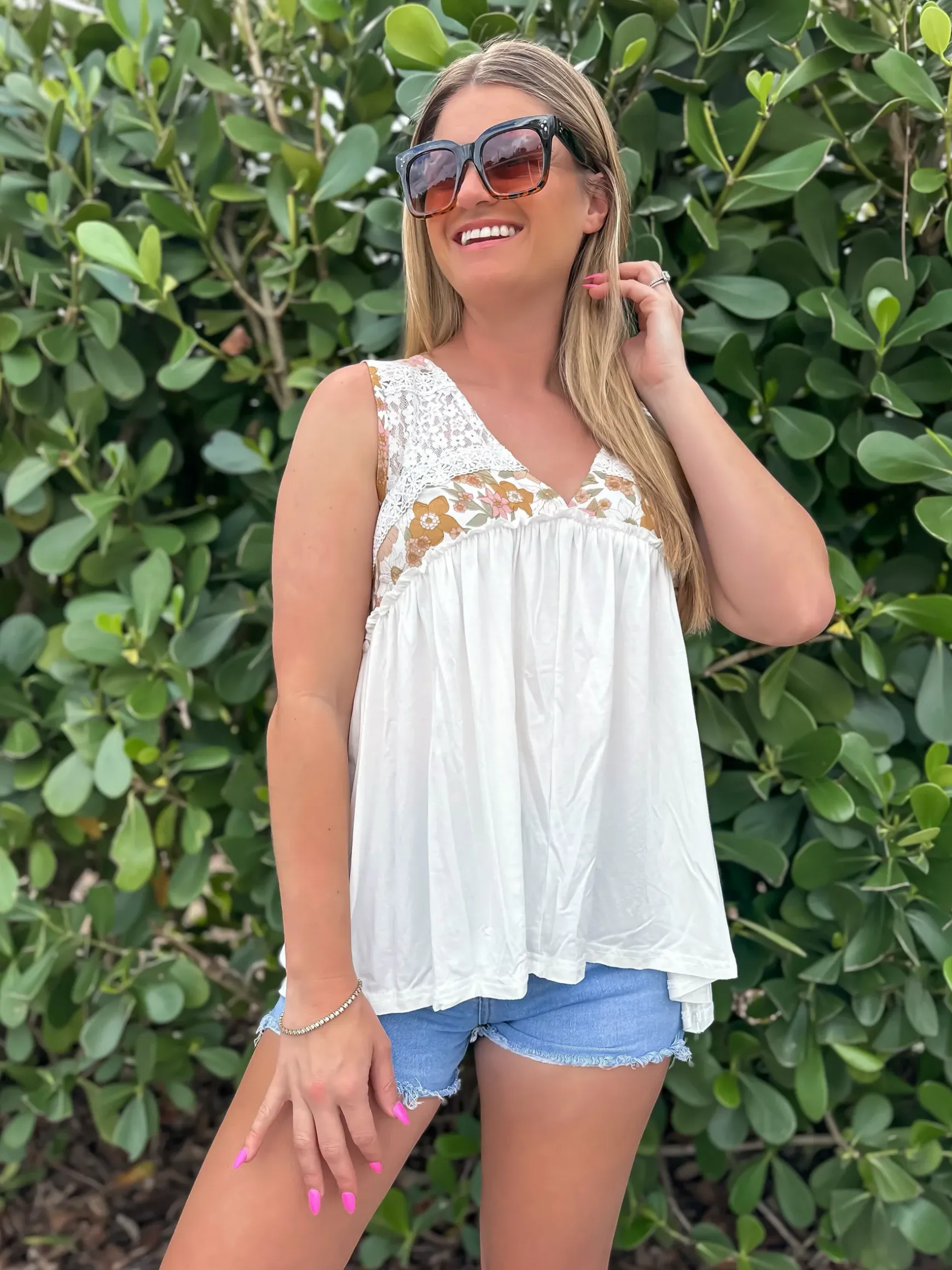 Designed in V-neck, sleeveless, A-line fit top in POL jersey with lace trim detail pointed floral pattern.