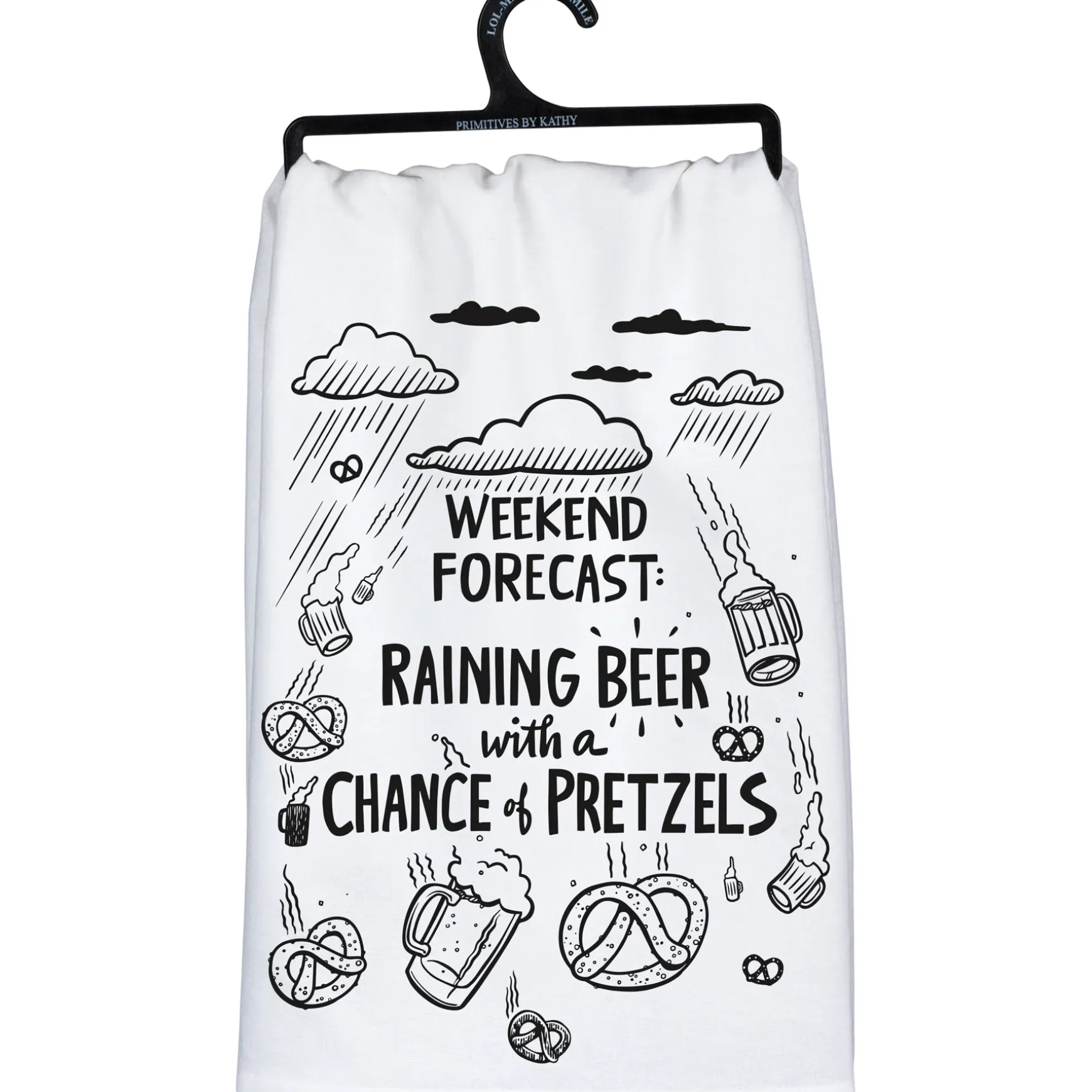 A black and white cotton kitchen towel displaying a hand illustrated design of glasses of beer and pretzels falling from rain clouds around a humorous sentiment that reads “Weekend Forecast: Raining Beer With A Chance Of Pretzels.” Our Forecast Raining Beer kitchen towel is machine-washable for convenient cleaning