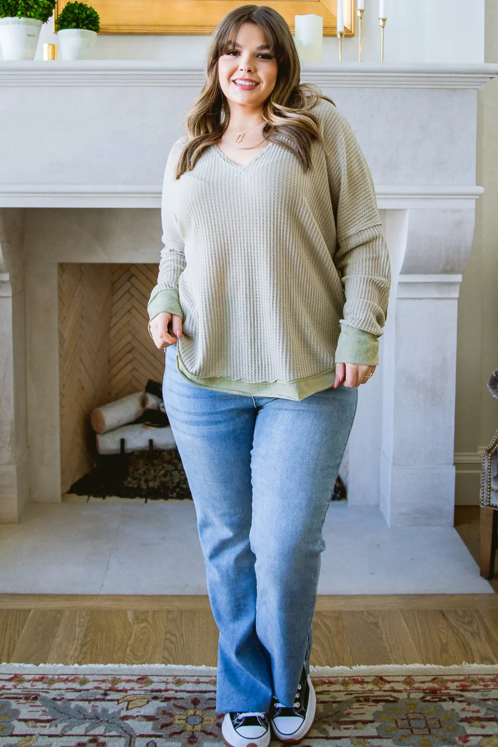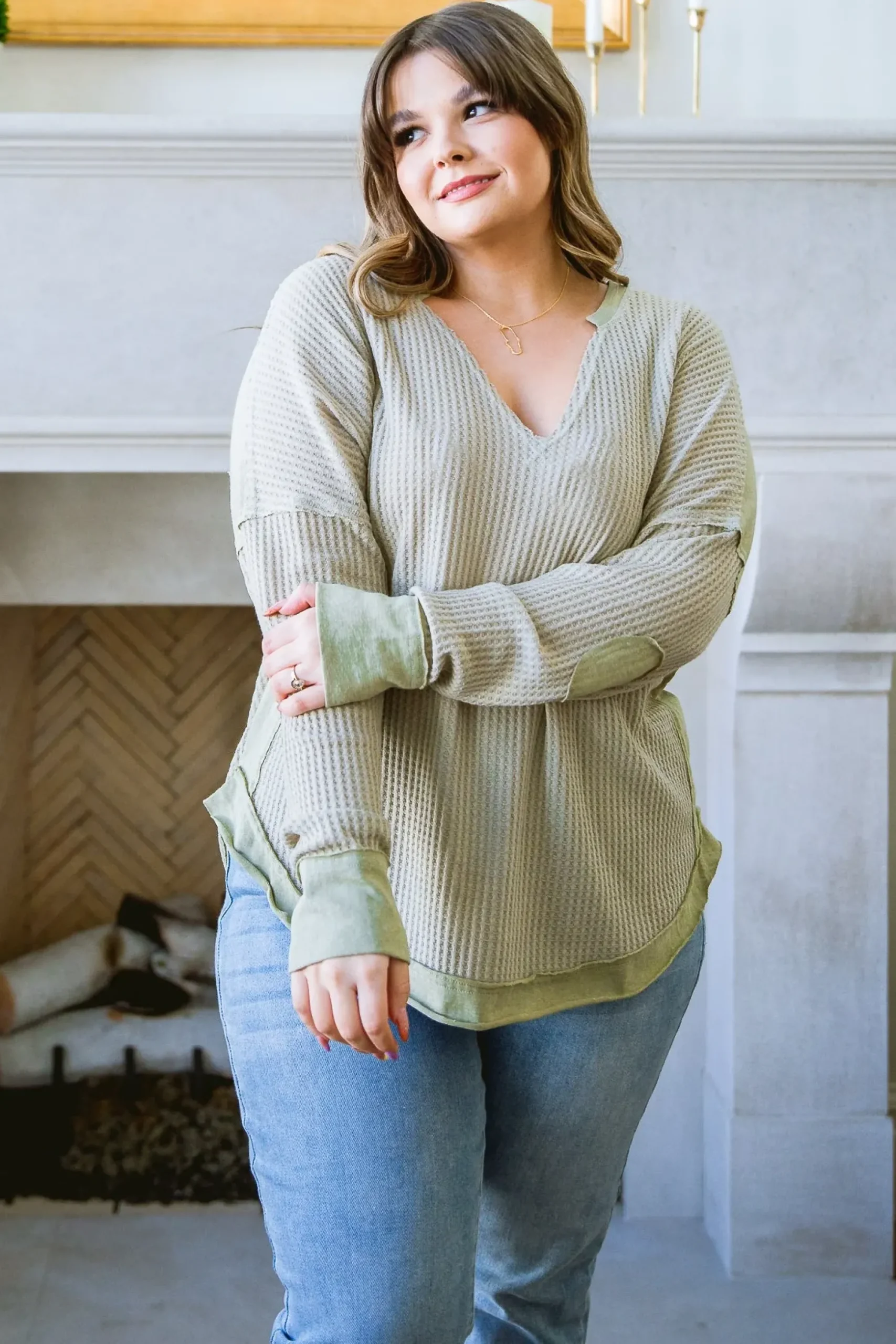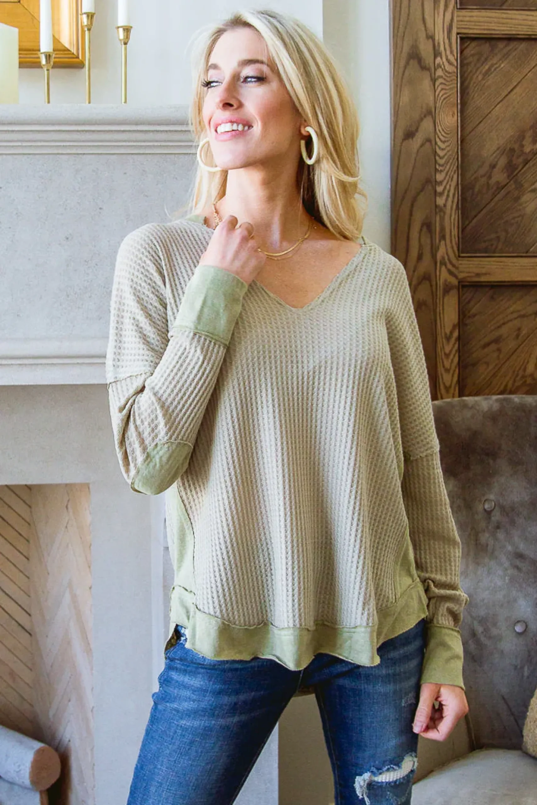 The Winding Roads Top has a gorgeous v neckline that is perfect for showing off your favorite necklaces! This waffled top has a contrast hemline and cuffs that add a fun detail to this relaxed fit top. Pair it with leggings or jeans for a fashionable yet comfortable outfit.