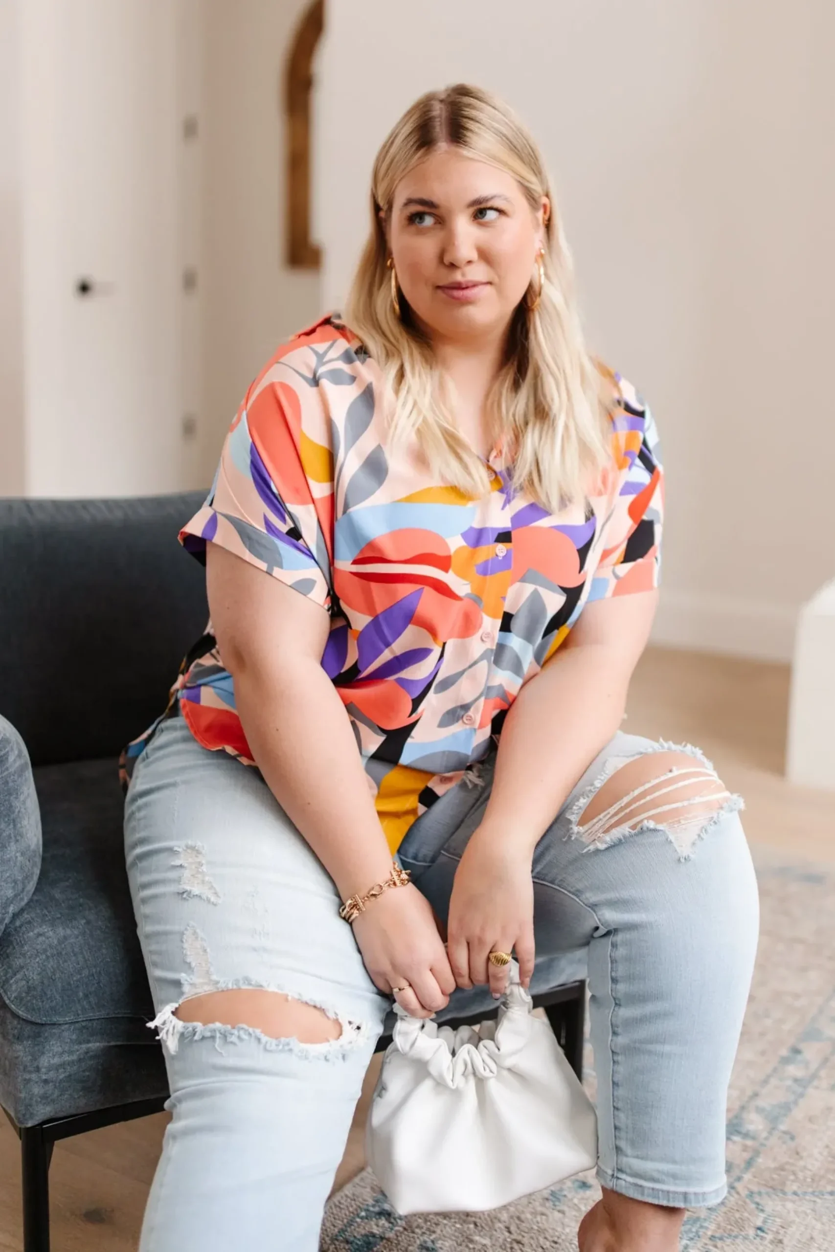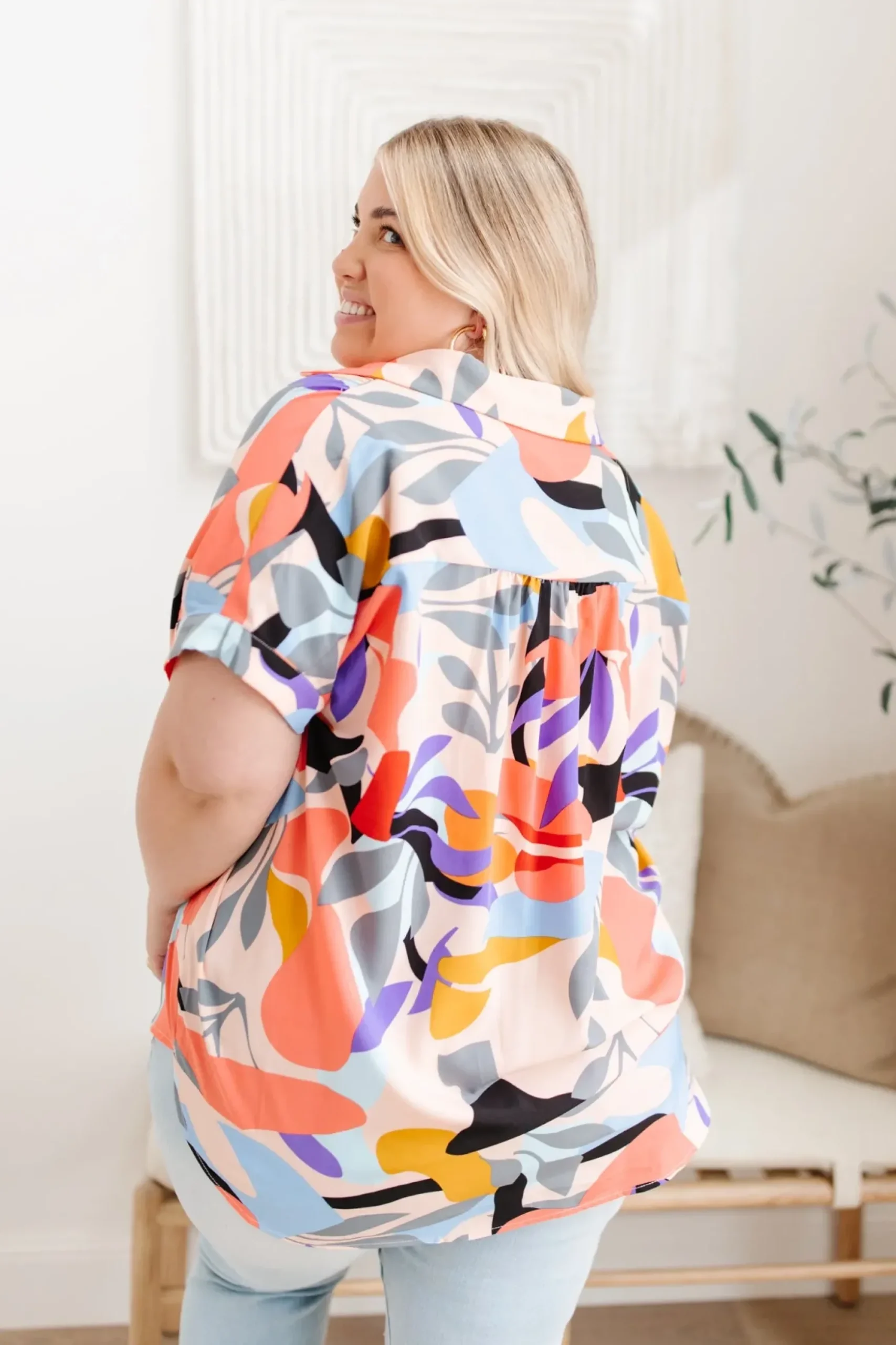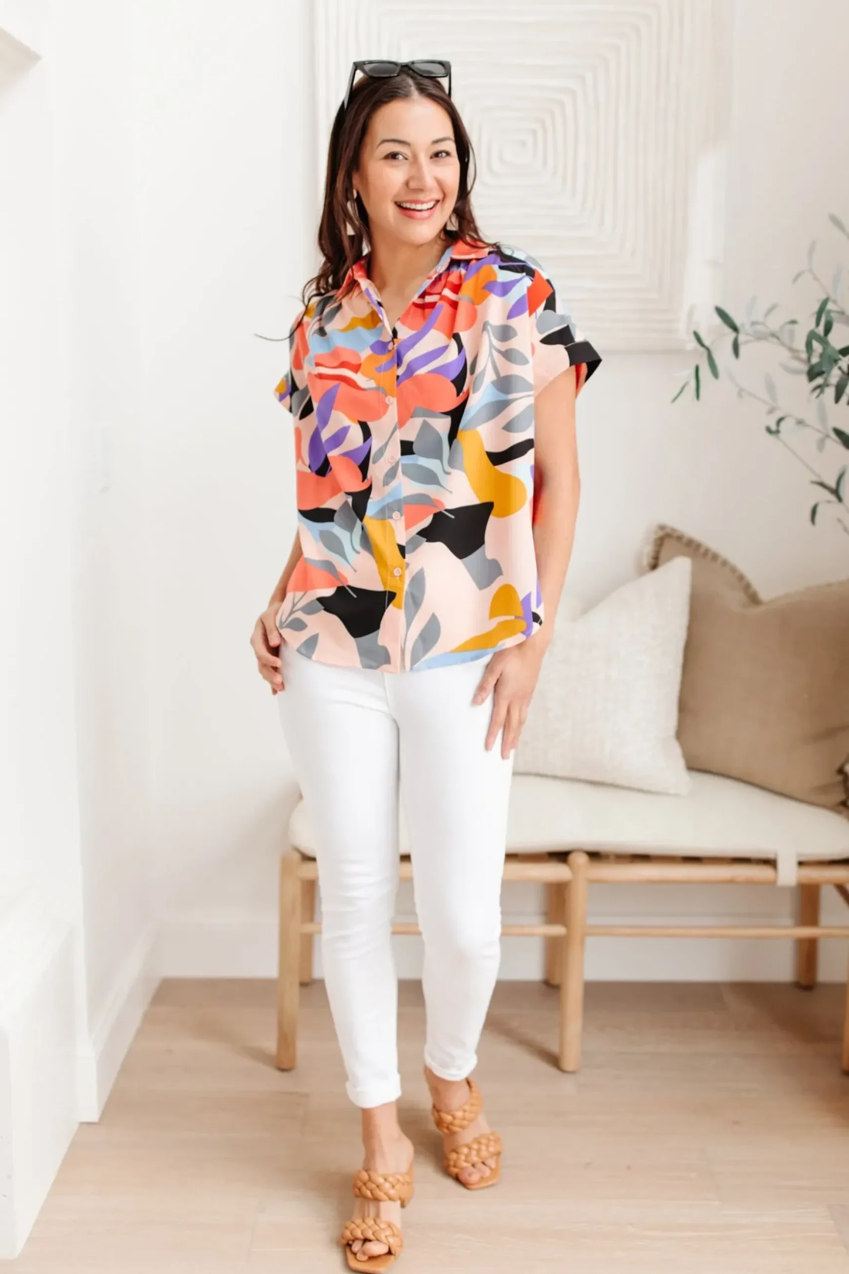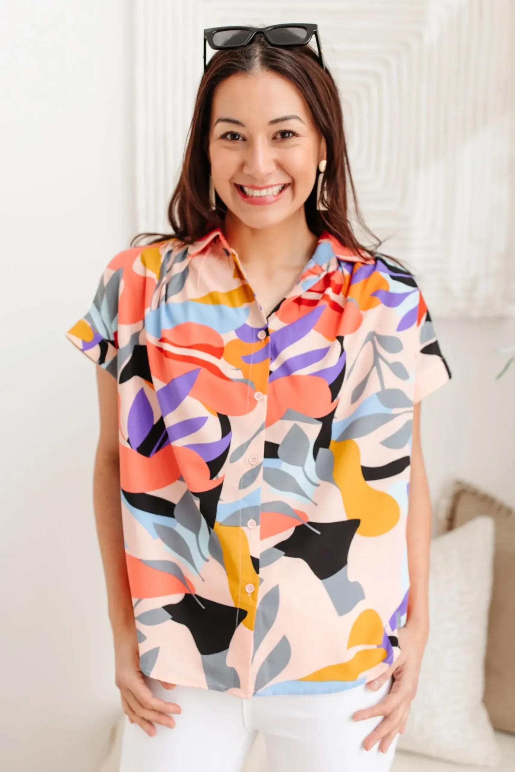 Looking your best is easy in the Working Weekend Top! This funky printed top features a lightweight, flowy fabric, a collared neckline, ruched shoulders, cuffed dolman short sleeves, and a boxy silhouette. Pair with white denim and nude sandals for a look you can feel confident in!