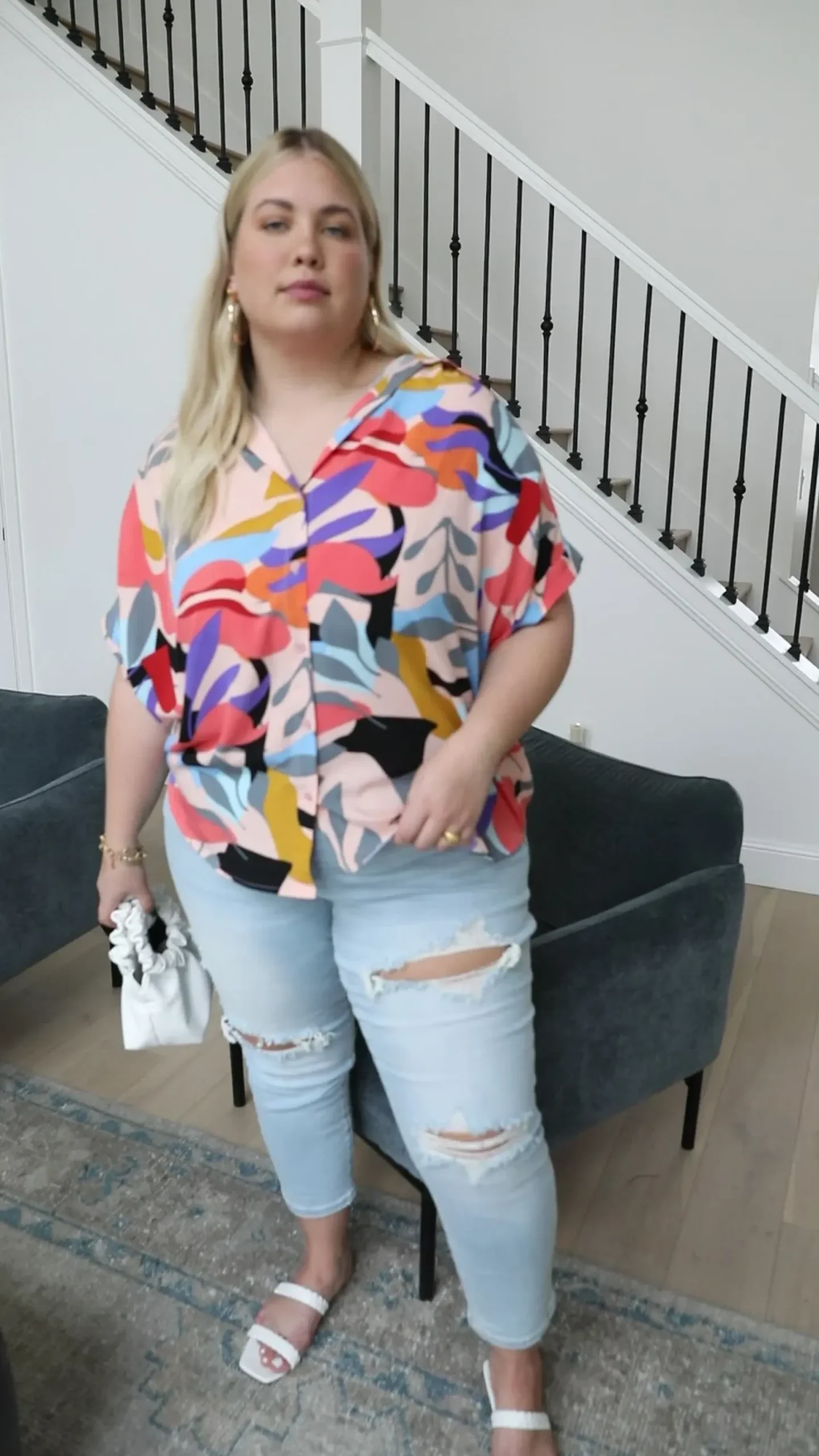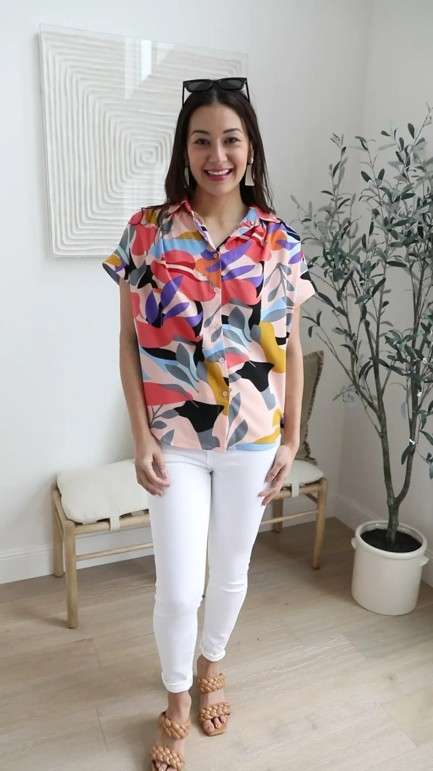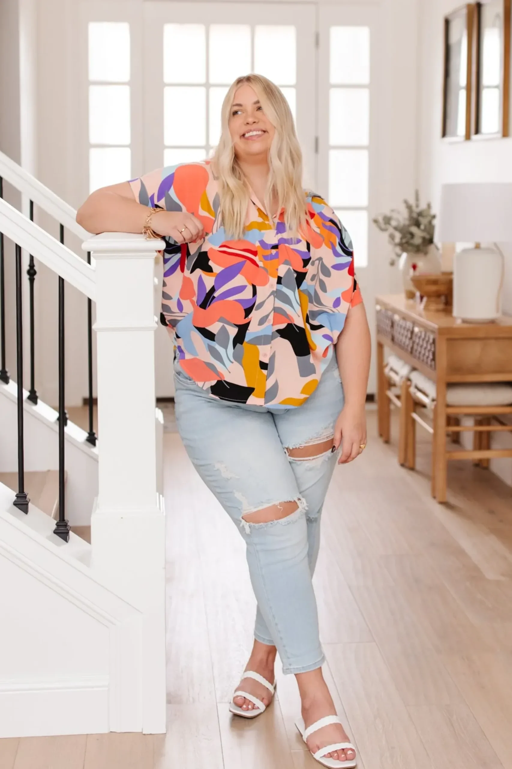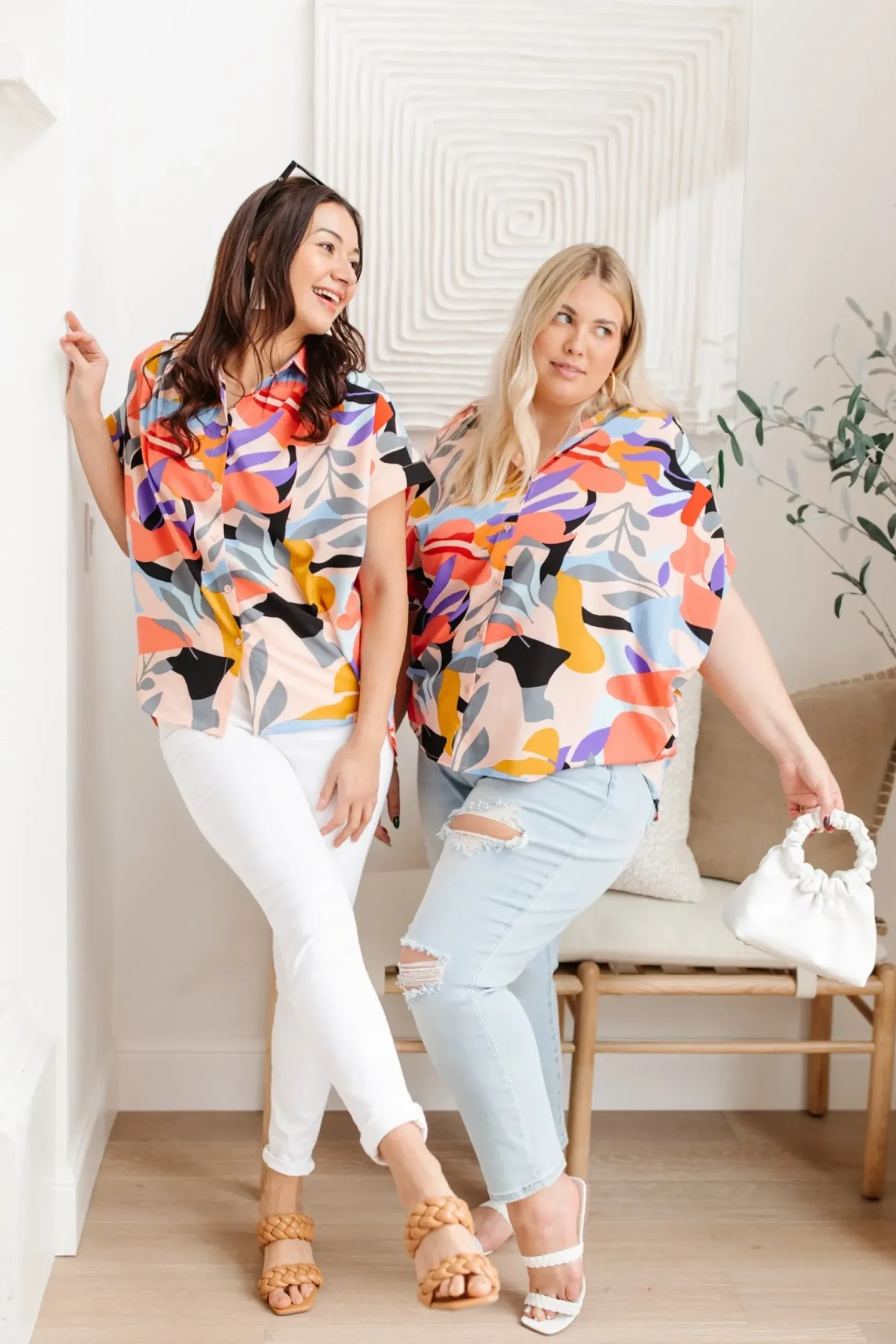 Looking your best is easy in the Working Weekend Top! This funky printed top features a lightweight, flowy fabric, a collared neckline, ruched shoulders, cuffed dolman short sleeves, and a boxy silhouette. Pair with white denim and nude sandals for a look you can feel confident in!
