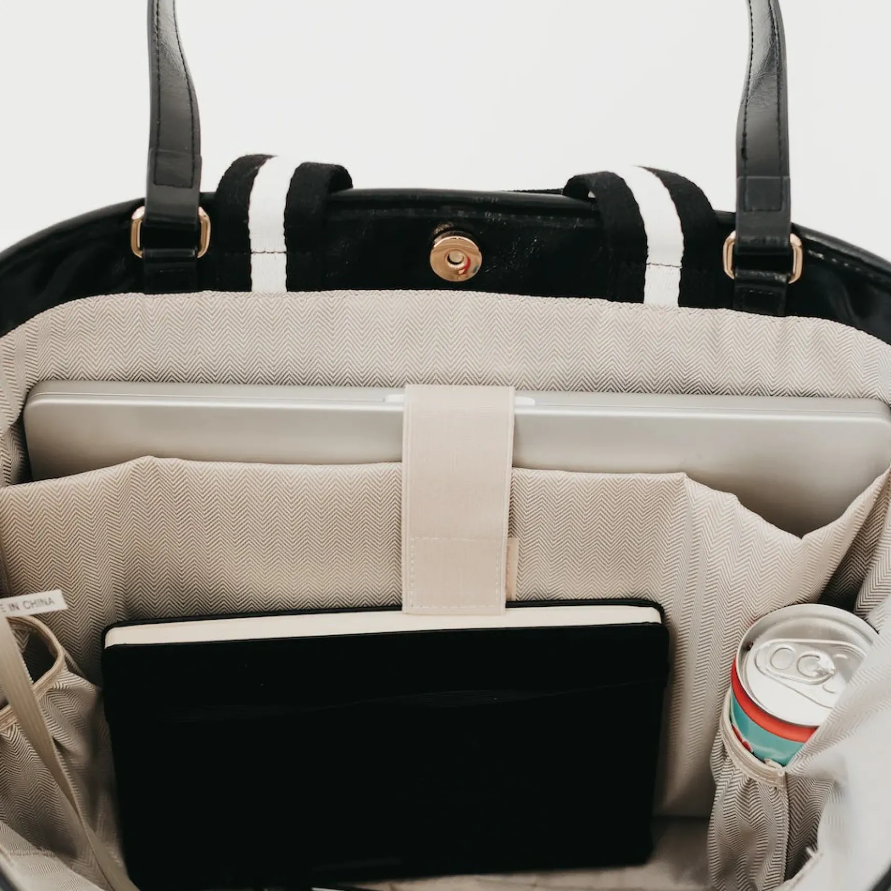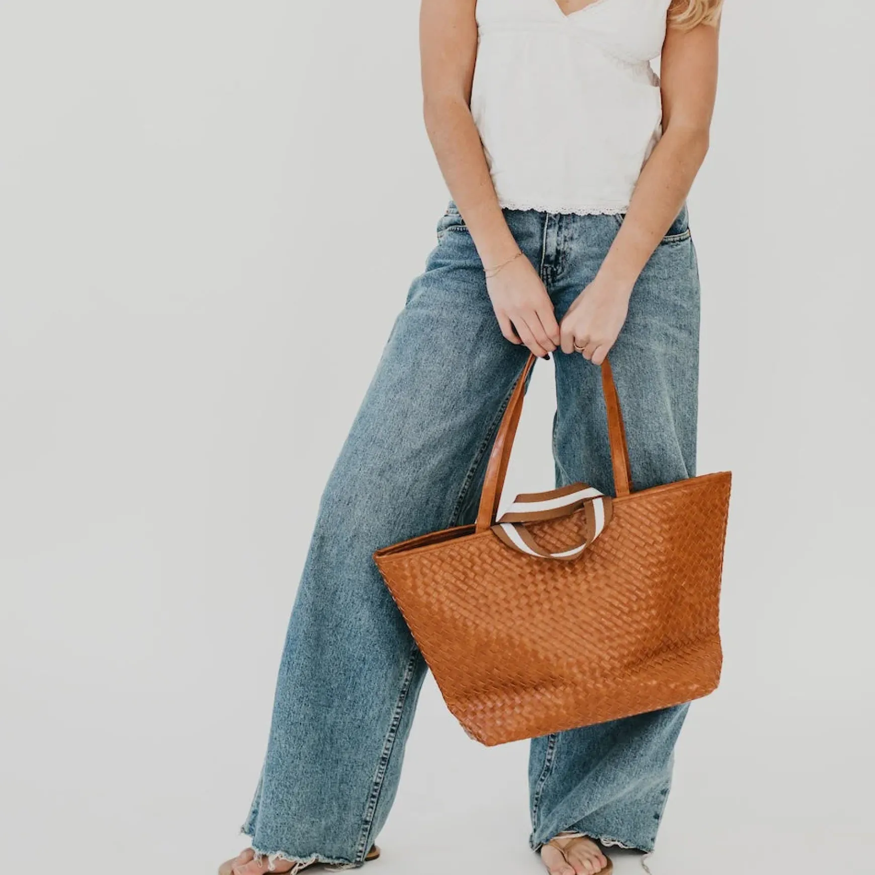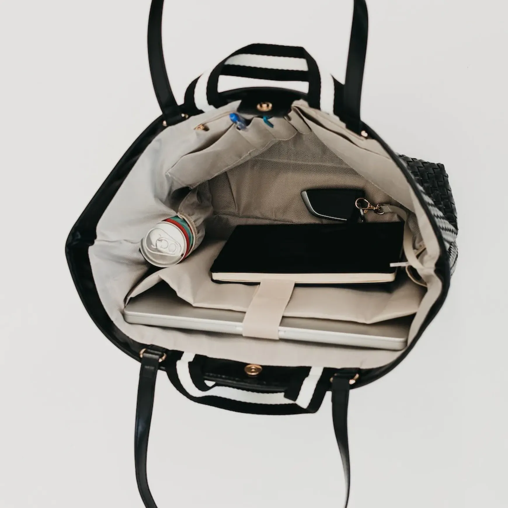 Meet the bag of your dreams, our Woven Tiffany Organized Tote Bag! Available in 5 colors, this must have bag is made from high quality woven vegan leather and includes a vegan leather shoulder strap, a canvas striped hand strap, and a snap closure. Inside the bag, you will find a variety of organizational features including 2 side water bottle pockets, a zipper pocket, 2 large open pockets, 3 small open pockets, a key leash, and a secured laptop sleeve. This bag will be your new everyday go-to!