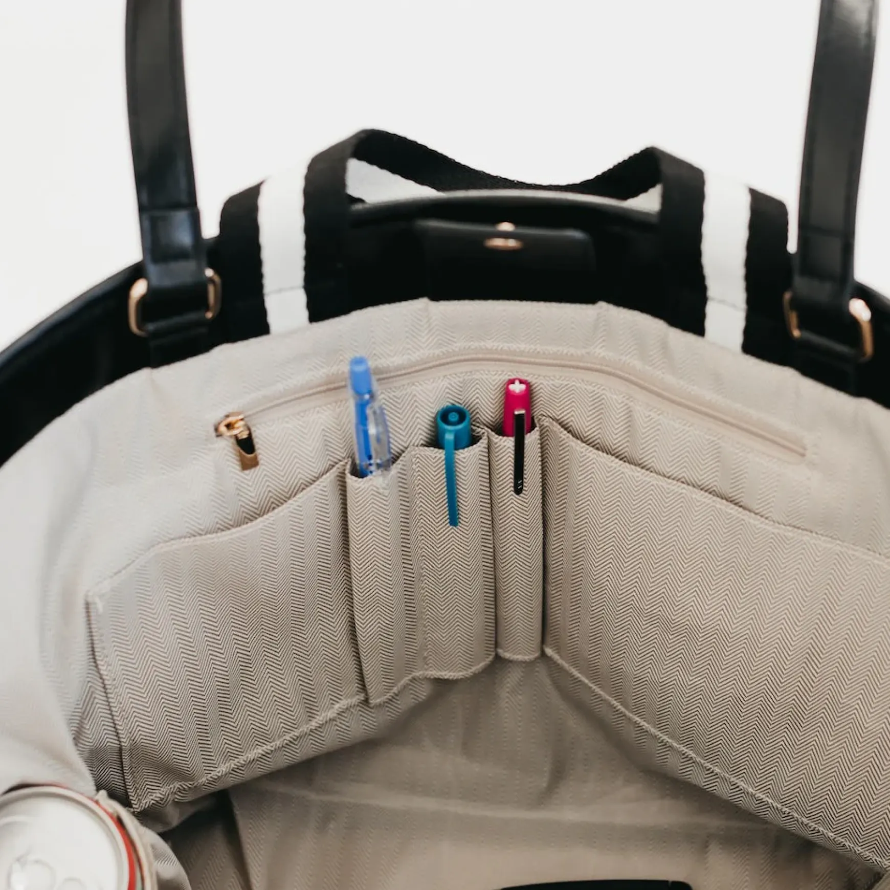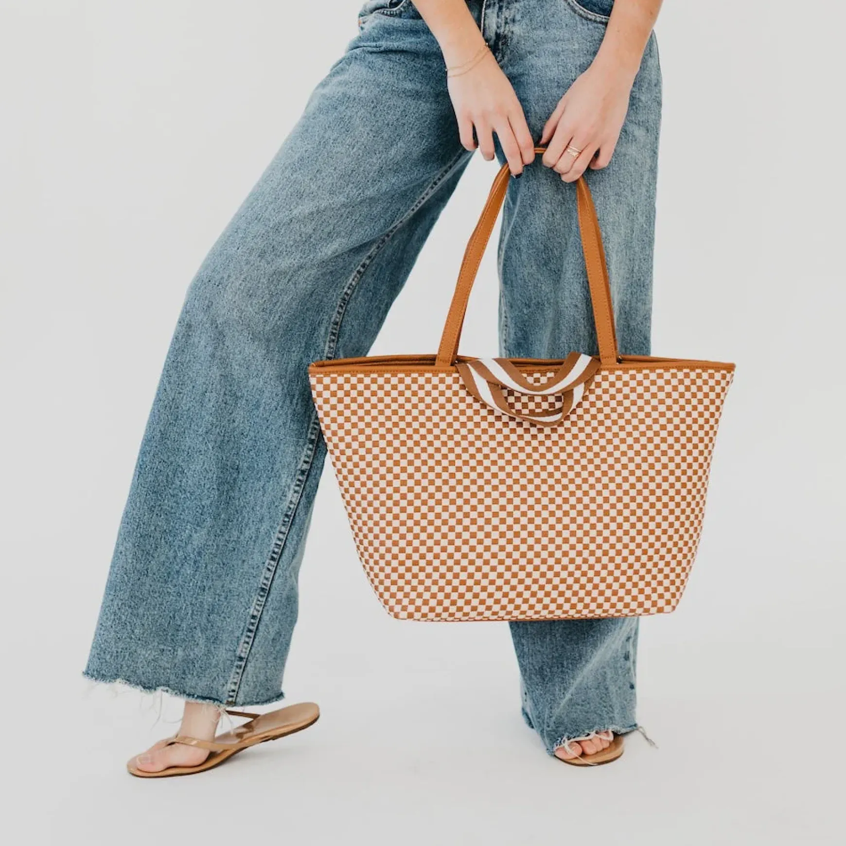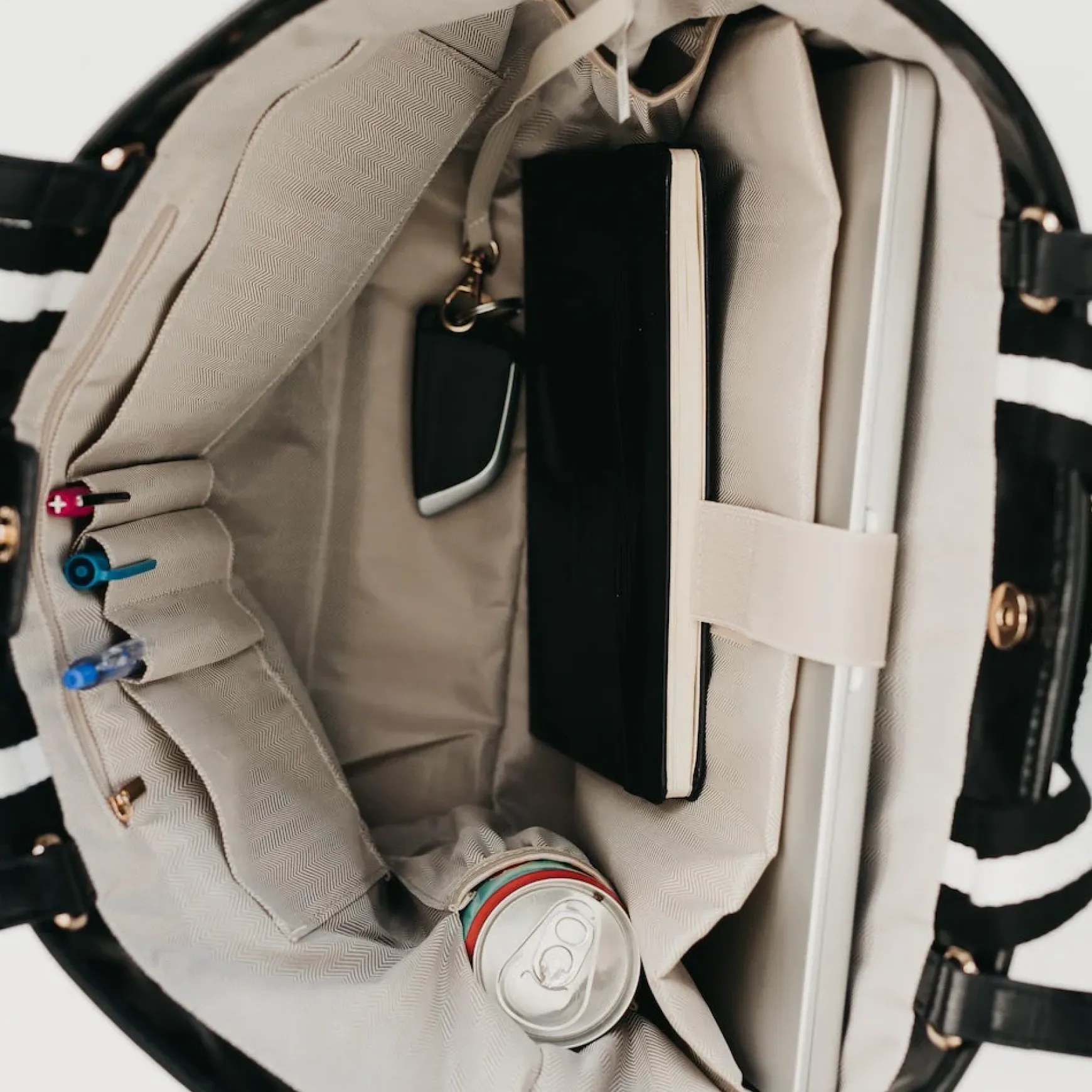 Meet the bag of your dreams, our Woven Tiffany Organized Tote Bag! Available in 5 colors, this must have bag is made from high quality woven vegan leather and includes a vegan leather shoulder strap, a canvas striped hand strap, and a snap closure. Inside the bag, you will find a variety of organizational features including 2 side water bottle pockets, a zipper pocket, 2 large open pockets, 3 small open pockets, a key leash, and a secured laptop sleeve. This bag will be your new everyday go-to!
